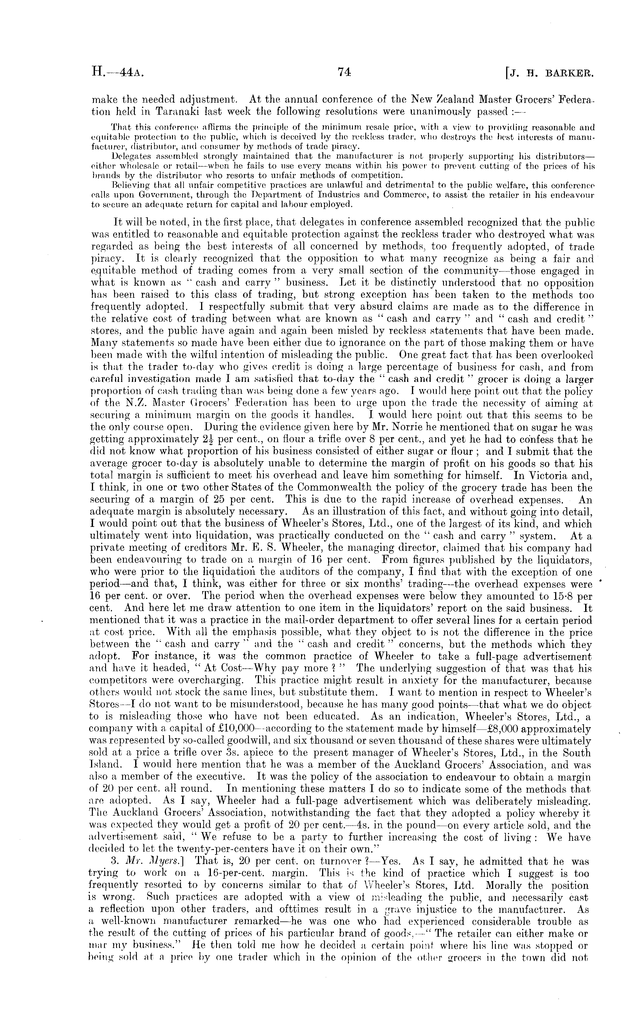 make the needed adjustment. At the annual conference of the New Zealand Master Grocers' Federation held in Taranaki last week the following resolutions were unanimously passed :—• That this conference affirms the principle of the minimum resale price, with a view to providing reasonable and equitable protection to the public, which is deceived by the reckless trader, who destroys the best interests of manufacturer, distributor, and consumer by methods of trade piracy. Delegates assembled strongly maintained that the manufacturer is not properly supporting his distributors — either wholesale or retail —when he fails to use every means within his power to prevent cutting of the prices of his brands by the distributor who resorts to unfair methods of competition. Believing that all unfair competitive practices are unlawful and detrimental to the public welfare, this conference calls upon Government, through the Department of Industries and Commerce, to assist the retailer in his endeavour to secure an adequate return for capital and labour employed. It will be noted, in the first place, that delegates in conference assembled recognized that the public was entitled to reasonable and equitable protection against the reckless trader who destroyed what was regarded as being the best interests of all concerned by methods, too frequently adopted, of trade piracy. It is clearly recognized that the opposition to what many recognize as being a fair and equitable method of trading comes from a very small section of the community— those engaged in what is known as " cash and carry " business. Let it be distinctly understood that no opposition has been raised to this class of trading, but strong exception has been taken to the methods too frequently adopted. I respectfully submit that very absurd claims are made as to the difference in the relative cost of trading between what are known as " cash and carry " and " cash and credit " stores, and the public have again and again been misled by reckless statements that have been made. Many statements so made have been either due to ignorance on the part of those making them or have been made with the wilful intention of misleading the public. One great fact that has been overlooked is that the trader to-day who gives credit is doing a large percentage of business for cash, and from careful investigation made I am satisfied that to-day the " cash and credit " grocer is doing a larger proportion of cash trading than was being done a few years ago. I would hei;e point out that the policy of the N.Z. Master Grocers' Federation has been to urge upon the trade the necessity of aiming at securing a minimum margin on the goods it handles. I would here point out that this seems to be the only course open. During the evidence given here by Mr. Norrie he mentioned that 011 sugar he was getting approximately 1\ per cent., on flour a trifle over 8 per cent., and yet he had to confess that he did not know what proportion of his business consisted of either sugar or flour ; and I submit that the average grocer to-day is absolutely unable to determine the margin of profit on his goods so that his total margin is sufficient to meet his overhead and leave him something for himself. In Victoria and, I think, in one or two other States of the Commonwealth the policy of the grocery trade has been the securing of a margin of 25 per cent. This is due to the rapid increase of overhead expenses. An adequate margin is absolutely necessary. As an illustration of this fact, and without going into detail, I would point out that the business of Wheeler's Stores, Ltd., one of the largest of its kind, and which ultimately went into liquidation, was practically conducted on the " cash and carry " system. At a private meeting of creditors Mr. E. S. Wheeler, the managing director, claimed that his company had been endeavouring to trade on a margin of 16 per cent. From figures published by the liquidators, who were prior to the liquidation the auditors of the company, I find that with the exception of one period—and that, I think, was either for three or six months' trading—-the overhead expenses were 16 per cent, or over. The period when the overhead expenses were below they amounted to 15-8 per cent. And here let me draw attention to one item in the liquidators' report on the said business. It mentioned that it was a practice in the mail-order department to offer several lines for a certain period at cost price. With all the emphasis possible, what they object to is not the difference in the price between the " cash and carry " and the " cash and credit " concerns, but the methods which they adopt. For instance, it was the common practice of Wheeler to take a full-page advertisement and have it headed, "At Cost —Why pay more ? " The underlying suggestion of that was that his competitors were overcharging. This practice might result in anxiety for the manufacturer, because others would not stock the same lines, but substitute them. I want to mention in respect to Wheeler's Stores —I do not want to be misunderstood, because he has many good points—that what we do object to is misleading those who have not been educated. As an indication, Wheeler's Stores, Ltd., a company with a capital of £10,000 —according to the statement made by himself—£B,ooo approximately was represented by so-called goodwill, and six thousand or seven thousand of these shares were ultimately sold at a price a trifle over 3s. apiece to the present manager of Wheeler's Stores, Ltd., in the South Island. I would here mention that he was a member of the Auckland Grocers' Association, and was also a member of the executive. It was the policy of the association to endeavour to obtain a margin of 20 per cent, all round. In mentioning these matters Idoso to indicate some of the methods that are adopted. As I say, Wheeler had a full-page advertisement which was deliberately misleading. The Auckland Groc