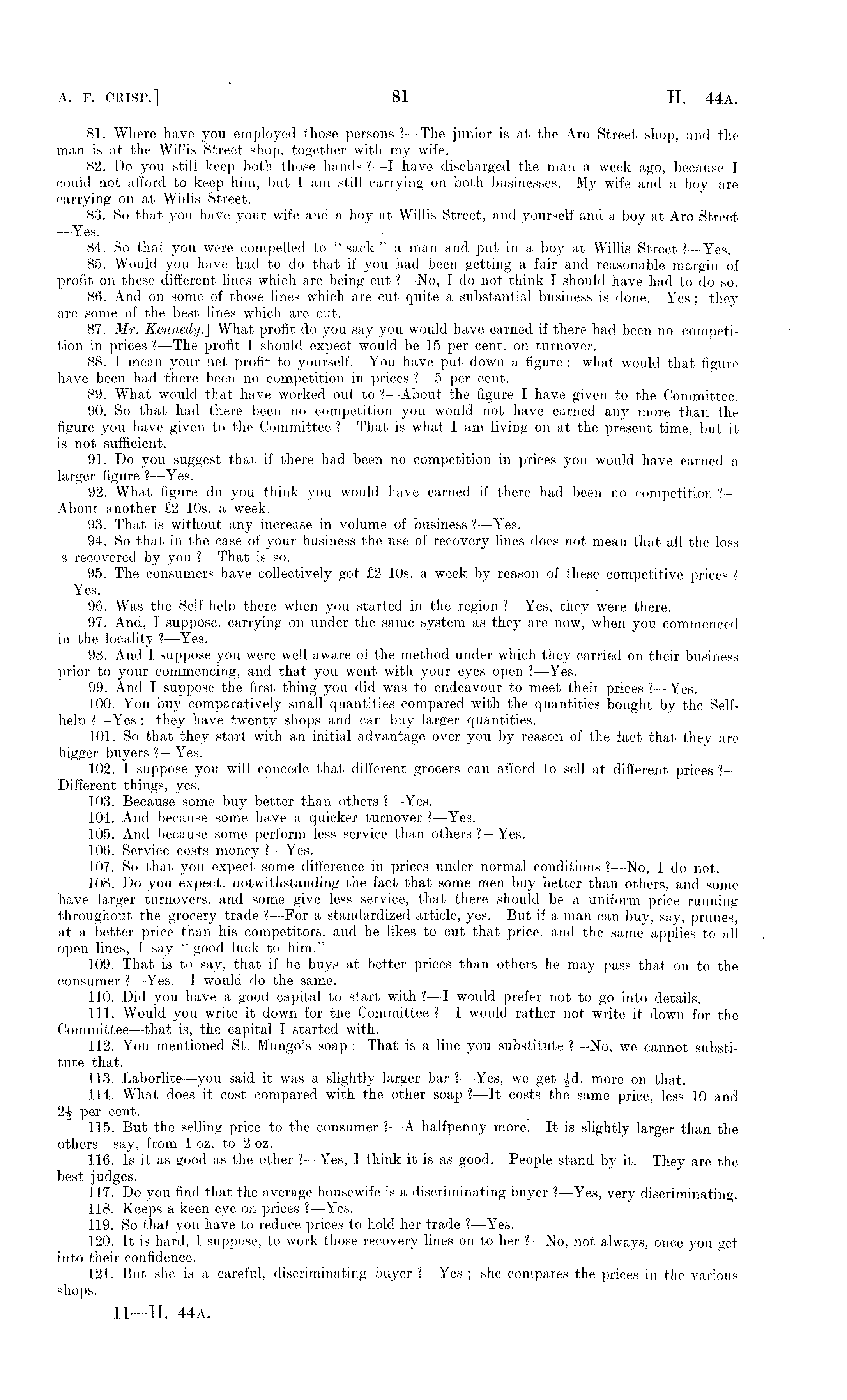 81. Where have you employed those persons ? —The junior is at the Aro Street shop, and the man is at the Willis Street shop, together with my wife. 82. Do you still keep both those hands ?—I have discharged the man a week ago, because I could not afford to keep him, but I am still carrying on both businesses. My wife and a boy are carrying on at Willis Street. 83. So that you have your wife and a boy at Willis Street, and yourself and a boy at Aro Street —Yes. 84. So that you were compelled to "sack" a man and put in a boy at Willis Street ? —Yes. 85. Would you have had to do that if you had been getting a fair and reasonable margin of profit on these different lines which are being cut ?—No, 1 do not think I should have had to do so. 86. And on some of those lines which are cut quite a substantial business is done. —Yes ; they are some of the best lines which are cut. 87. Mr. Kennedy.'] What profit do you say you would have earned if there had been no competition in prices ?— The profit I should expect would be 15 per cent, on turnover. 88. I mean your net profit to yourself. You have put down a figure : what would that figure have been had there been no competition in prices ? —5 per cent. 89. What would that have worked out to ?- About the figure I have given to the Committee. 90. So that had there been no competition you would not have earned any more than the figure you have given to the Committee ?- That is what I am living on at the present time, but it is not sufficient. 91. Do you suggest that if there had been no competition in prices you would have earned a larger figure ? —Yes. 92. What figure do you think you would have earned if there had been no competition ? — About another £2 10s. a week. 93. That is without any increase in volume of business ?—Yes. 94. So that in the case of your business the use of recovery lines does not mean that all the loss s recovered by you ? —That is so. 95. The consumers have collectively got £2 10s. a week by reason of these competitive prices ? —Yes. 96. Was the Self-help there when you started in the region ?—Yes, they were there. 97. And, I suppose, carrying on under the same system as they are now, when you commenced in the locality ? —Yes. 98. And I suppose you were well aware of the method under which they carried on their business prior to your commencing, and that you went with your eyes open ? —Yes. 99. And I suppose the first thing you did was to endeavour to meet their prices ? —Yes. 100. You buy comparatively small quantities compared with the quantities bought by the Selfhelp ?—Yes ; they have twenty shops and can buy larger quantities. 101. So that they start with an initial advantage over you by reason of the fact that they are bigger buyers ? —Yes. 102. I suppose you will concede that different grocers can afford to sell at different prices?'— Different things, yes. 103. Because some buy better than others ? —Yes. 104. And because some have a quicker turnover ?—Yes. 105. And because some perform less service than others ? —Yes. 106. Service costs money ?—Yes. 107. So that you expect some difference in prices under normal conditions?—No, I do not. 108. Do you expect, notwithstanding the fact that some men buy better than others, and some have larger turnovers, and some give less service, that there should be a uniform price running throughout the grocery trade ?—For a standardized article, yes. But if a man can buy, say, prunes, at a better price than his competitors, and he likes to cut that price, and the same applies to all open lines, I say " good luck to him." 109. That is to say, that if he buys at better prices than others he may pass that on to the consumer ? —Yes. I would do the same. 110. Did you have a good capital to start with ? —I would prefer not to go into details. 111. Would you write it down for the Committee? —1 would rather not write it down for the Committee —that is, the capital I started with. 112. You mentioned St. Mungo's soap : That is a line you substitute ?—No, we cannot substitute that. 113. Laborlite —you said it was a slightly larger bar ? —Yes, we get fd. more on that. 114. What does it cost compared with the other soap ? —lt costs the same price, less 10 and 2| per cent. 115. But the selling price to the consumer ? —A halfpenny more. It is slightly larger than the others —say, from I oz. to 2 oz. 116. Is it as good as the other ? —Yes, I think it is as good. People stand by it. They are the best judges. 117. Do you find that the average housewife is a discriminating buyer ? —Yes, very discriminating. 118. Keeps a keen eye on prices ? —Yes. 119. So that you have to reduce prices to hold her trade ?—Yes. 120. It is hard, I suppose, to work those recovery lines on to her ? —No, not always, once you get into their confidence. 121. But she is a careful, discriminating buyer ? —Yes ; she compares the prices in the various shops.