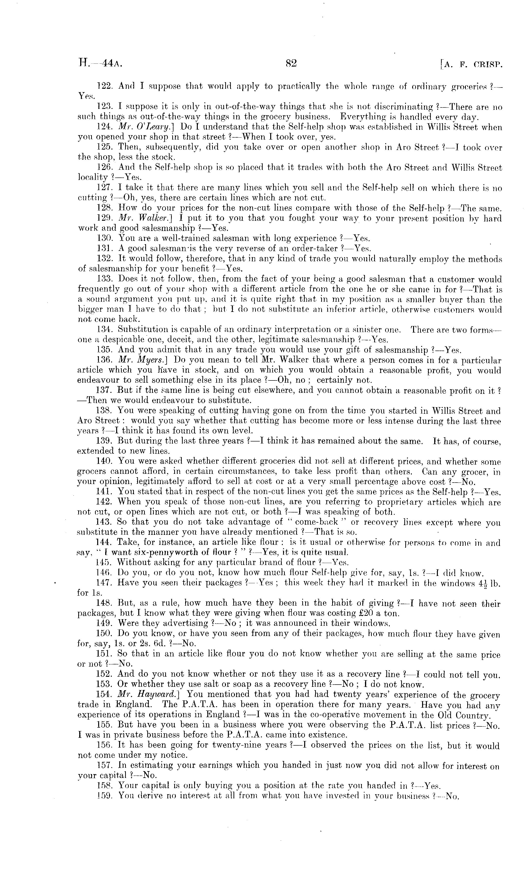 122. And I suppose that would apply to practically the whole range of ordinary groceries?— Yes. 123. I suppose it is only in out-of-the-way things that she is not discriminating ? —There are no such things as out-of-the-way things in the grocery business. Everything is handled every day. 124. Mr. o'Leary.\ Do I understand that the Self-help shop was established in Willis Street when you opened your shop in that street ?—When I took over, yes. 125. Then, subsequently, did you take over or open another shop in Aro Street ? —I took over the shop, less the stock. 126. And the Self-help shop is so placed that it trades with both the Aro Street and Willis Street locality ? —Yes. 127. I take it that there are many lines which you sell and the Self-help sell on which there is no cutting ? —Oh, yes, there are certain lines which are not cut. 128. How do your prices for the non-cut lines compare with those of the Self-help ? —The same. 129. Mr. Walker.] I put it to you that you fought your way to your present position bv hard work and good salesmanship ? —Yes. 130. You are a well-trained salesman with long experience ?—Yes. 131. A good salesman-is the very reverse of an order-taker ?—Yes. 132. It would follow, therefore, that in any kind of trade you would naturally employ the methods of salesmanship for your benefit ? —Yes. 133. Does it not follow, then, from the fact of your being a good salesman that a customer would frequently go out of your shop with a different article from the one he or she came in for ? —That is a sound argument you put up, and it is quite right that in my position as a smaller buyer than the bigger man I have to do that; but Ido not substitute an inferior article, otherwise customers would not come back. 134. Substitution is capable of an ordinary interpretation or a sinister one. There are two forms— one a despicable one, deceit, and the other, legitimate salesmanship ?—Yes. 135. And you admit that in any trade you would use your gift of salesmanship ? —Yes. 136. Mr. Myers.] Do you mean to tell Mr. Walker that where a person comes in for a particular article which you have in stock, and on which you would obtain a reasonable profit, you would endeavour to sell something else in its place ?—Oh, no ; certainly not. 137. But if the same line is being cut elsewhere, and you cannot obtain a reasonable profit on it ? —Then we would endeavour to substitute. 138. You were speaking of cutting having gone on from the time you started in Willis Street and Aro Street: would you say whether that cutting has become more or less intense during the last three years ? —I think it has found its own level. 139. But during the last three years ? —I think it has remained about the same. It has, of course, extended to new lines. 140. You were asked whether different groceries did not sell at different prices, and whether some grocers cannot afford, in certain circumstances, to take less profit than others. Can any grocer, in your opinion, legitimately afford to sell at cost or at a very small percentage above cost ? —No. 141. You stated that in respect of the non-cut lines you get the same prices as the Self-help ? —Yes. 142. When you speak of those non-cut lines, are you referring to proprietary articles which are not cut, or open lines which are not cut, or both ? —I was speaking of both. 143. So that you do not take advantage of " come-back " or recovery lines except where you substitute in the manner you have already mentioned ? —That is so. 144. Take, for instance, an article like flour : is it usual or otherwise for persons to come in and say, " I want six-pennyworth of flour ? " ?—Yes, it is quite usual. 145. Without asking for any particular brand of flour ? —Yes. 146. Do you, or do you not, know how much flour Self-help give for, say, Is. ? —I did know. 147. Have you seen their packages ? —Yes ; this week they had it marked in the windows 4i lb. for Is. 148. But, as a rule, how much have they been in the habit of giving ?—I have not seen their packages, but I know what they were giving when flour was costing £20 a ton. 149. Were they advertising ? —No ; it was announced in their windows. 150. Do you know, or have you seen from any of their packages, how much flour they have given for, say, Is. or 2s. 6d. ? —No. 151. So that in an article like flour you do not know whether you are selling at the same price or not ? —No. 152. And do you not know whether or not they use it as a recovery line ? —I could not tell you. 153. Or whether they use salt or soap as a recovery line ? —No ; I do not know. 154. Mr. Hayward.] You mentioned that you had had twenty years' experience of the grocery trade in England. The P.A.T.A. has been in operation there for many years. Have you had anv experience of its operations in England ? —I was in the co-operative movement in the Old Country. 155. But have you been in a business where you were observing the P.A.T.A. list prices ? —No. I was in private business before the P.A.T.A. came into existence. 156. It has been going for twenty-nine years ? —I observed the prices on the list, but it would not come under my notice. 157. In estimating your earnings which you handed in just now you did not allow for interest on your capital ? —No. 158. Your capital is only buying you a position at the rate you handed in ? —Yes. 159. You derive no interest at all from, what you have invested in vour business ?—No.