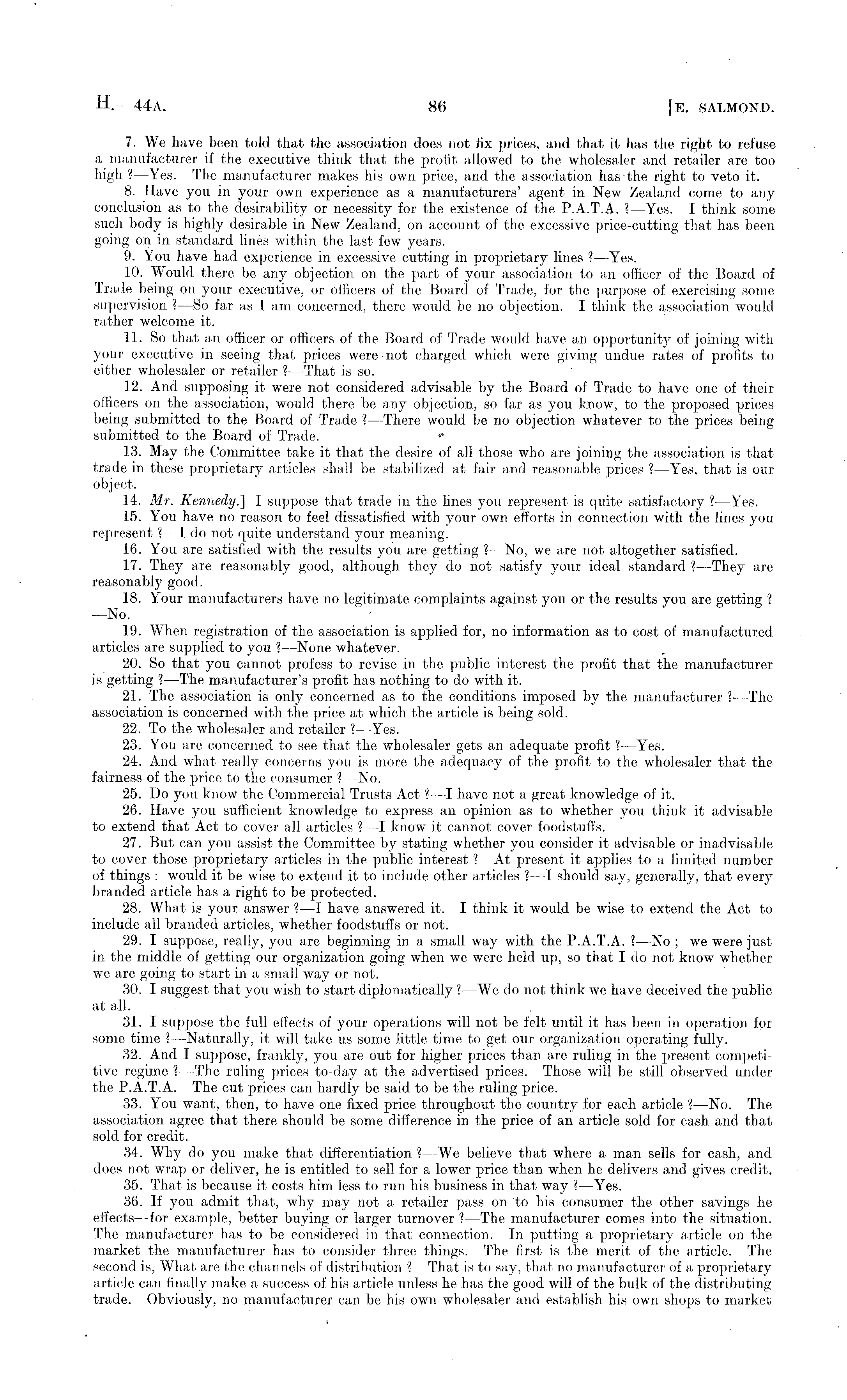 7. We have been told that the association does not fix prices, and that it has the right to refuse a manufacturer if the executive think that the profit allowed to the wholesaler and retailer are too high ? —Yes. The manufacturer makes his own price, and the association has'the right to veto it. 8. Have you in your own experience as a manufacturers' agent in New Zealand come to any conclusion as to the desirability or necessity for the existence of the P.A.T.A. ? —Yes. I think some such body is highly desirable in New Zealand, on account of the excessive price-cutting that has been going on in standard lines within the last few years. 9. You have had experience in excessive cutting in proprietary lines ? —Yes. 10. Would there be any objection on the part of your association to an officer of the Board of Trade being on your executive, or officers of the Board of Trade, for the purpose of exercising some supervision ? —So far as lam concerned, there would be no objection. I think the association would rather welcome it. 11. So that an officer or officers of the Board of Trade would have an opportunity of joining with your executive in seeing that prices were not charged which were giving undue rates of profits to either wholesaler or retailer ? —That is so. 12. And supposing it were not considered advisable by the Board of Trade to have one of their officers on the association, would there be any objection, so far as you know, to the proposed prices being submitted to the Board of Trade ?—There would be no objection whatever to the prices being submitted to the Board of Trade. • 13. May the Committee take it that the desire of all those who are joining the association is that trade in these proprietary articles shall be stabilized at fair and reasonable prices ? —Yes, that is our object. 14. Mr. Kennedy.'] I suppose that trade in the lines you represent is quite satisfactory ? —Yes. 15. You have no reason to feel dissatisfied with your own efforts in connection with the lines you represent ?—I do not quite understand your meaning. 16. You are satisfied with the results you are getting ? —No, we are not altogether satisfied. 17. They are reasonably good, although they do not satisfy your ideal standard ? —They are reasonably good. 18. Your manufacturers have no legitimate complaints against you or the results you are getting ? —No. 19. When registration of the association is applied for, no information as to cost of manufactured articles are supplied to you ? —None whatever. 20. So that you cannot profess to revise in the public interest the profit that the manufacturer is getting ?- -The manufacturer's profit has nothing to do with it. 21. The association is only concerned as to the conditions imposed by the manufacturer ? —The association is concerned with the price at which the article is being sold. 22. To the wholesaler and retailer ?- -Yes. 23. You are concerned to see that the wholesaler gets an adequate profit ?• —Yes. 24. And what really concerns you is more the adequacy of the profit to the wholesaler that the fairness of the price to the consumer ? —No. 25. Do you know the Commercial Trusts Act ? —I have not a great knowledge of it. 26. Have you sufficient knowledge to express an opinion as to whether you think it advisable to extend that Act to cover all articles ?- -I know it cannot cover foodstuffs. 27. But can you assist the Committee by stating whether you consider it advisable or inadvisable to cover those proprietary articles in the public interest ? At present it applies to a limited number of things : would it be wise to extend it to include other articles ? —I should say, generally, that every branded article has a right to be protected. 28. What is your answer ?—I have answered it. I think it would be wise to extend the Act to include all branded articles, whether foodstuffs or not. 29. I suppose, really, you are beginning in a small way with the P.A.T.A. I—No1 —No ; we were just in the middle of getting our organization going when we were held up, so that I do not know whether we are going to start in a small way or not. 30. I suggest that you wish to start diplomatically ? —We do not think we have deceived the public at all. 31. I suppose the full effects of your operations will not be felt until it has been in operation for some time ? —Naturally, it will take us some little time to get our organization operating fully. 32. And I suppose, frankly, you are out for higher prices than are ruling in the present competitive regime ? —The ruling prices to-day at the advertised prices. Those will be still observed under the P.A.T.A. The cut prices can hardly be said to be the ruling price. 33. You want, then, to have one fixed price throughout the country for each article ? —No. The association agree that there should be some difference in the price of an article sold for cash and that sold for credit. 34. Why do you make that differentiation ? —We believe that where a man sells for cash, and does not wrap or deliver, he is entitled to sell for a lower price than when he delivers and gives credit. 35. That is because it costs him less to run his business in that way ? —Yes. 36. If you admit that, why may not a retailer pass on to his consumer the other savings he effects —for example, better buying or larger turnover ?—The manufacturer comes into the situation. The manufacturer has to be considered in that connection. In putting a proprietary article on the market the manufacturer has to consider three things. The first is the merit of the article. The second is, What are the channels of distribution ? That is to say, that no manufacturer of a proprietary article can finally make a success of his article unless he has the good will of the bulk of the distributing trade. Obviously, no manufacturer can be his own wholesaler and establish his own shops to market