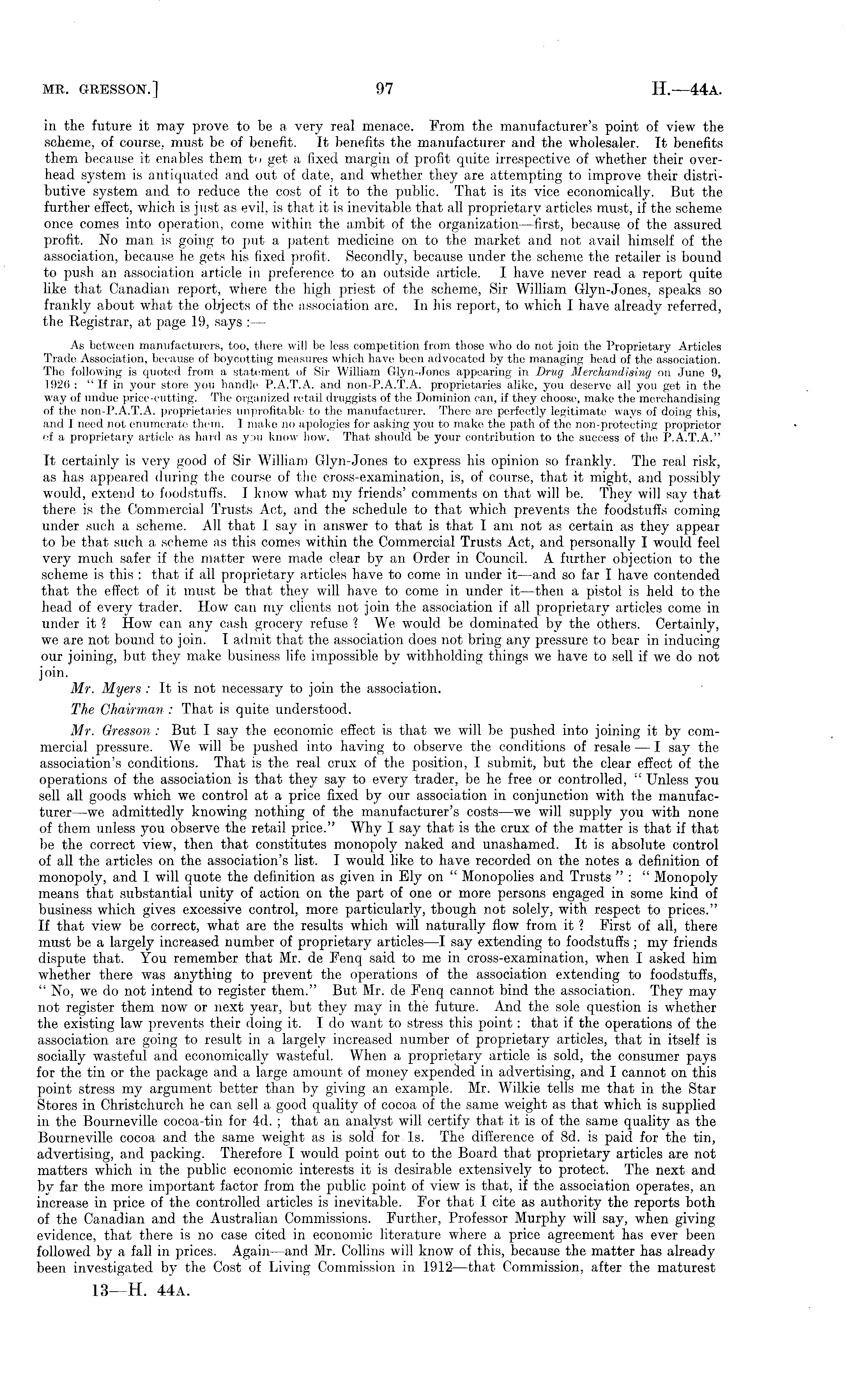 in the future it may prove to be a very real menace. From the manufacturer's point of view the scheme, of course, must be of benefit. It benefits the manufacturer and the wholesaler. It benefits them because it enables them t« < get a fixed margin of profit quite irrespective of whether their overhead system is antiquated and out of date, and whether they are attempting to improve their distributive system and to reduce the cost of it to the public. That is its vice economically. But the further effect, which is just as evil, is that it is inevitable that all proprietary articles must, if the scheme once comes into operation, come within the ambit of the organization —first, because of the assured profit. No man is going to put a patent medicine on to the market and not avail himself of the association, because he gets his fixed profit. Secondly, because under the scheme the retailer is bound to push an association article in preference to an outside article. I have never read a report quite like that Canadian report, where the high priest of the scheme, Sir William Glyn-Jones, speaks so frankly about what the objects of the association are. In his report, to which I have already referred, the Registrar, at page 19, says : —• As between manufacturers, too, there will be less competition from those who do not join the Proprietary Articles Trade Association, because of boycotting measures which have been advocated by the managing head of the association. The following is quoted from a statement of Sir William Glyn-Jones appearing in Drug Merchandising on June 9, 1926 : "If in your store you handle P.A.T.A. and non-P.A.T.A. proprietaries alike, you deserve all you get in the way of undue price-cutting. The organized retail druggists of the Dominion can, if they choose, make the merchandising of the non-P.A.T.A. proprietaries unprofitable to the manufacturer. There are perfectly legitimate ways of doing this, and I need not enumerate them. I make no apologies for asking you to make the path of the non-protecting proprietor of a proprietary article as hard as you know how. That should be your contribution to the success of the P.A.T.A." It certainly is very good of Sir William Glyn-Jones to express his opinion so frankly. The real risk, as has appeared during the course of the cross-examination, is, of course, that it might, and possibly would, extend to foodstuffs. I know what my friends' comments on that will be. They will say that there is the Commercial Trusts Act, and the schedule to that which prevents the foodstuffs coming under such a scheme. All that I say in answer to that is that lam not as certain as they appear to be that such a scheme as this comes within the Commercial Trusts Act, and personally I would feel very much safer if the matter were made clear by an Order in Council. A further objection to the scheme is this : that if all proprietary articles have to come in under it—and so far I have contended that the effect of it must be that they will have to come in under it—then a pistol is held to the head of every trader. How can my clients not join the association if all proprietary articles come in under it ? How can any cash grocery refuse ? We would be dominated by the others. Certainly, we are not bound to join. I admit that the association does not bring any pressure to bear in inducing our joining, but they make business life impossible by withholding things we have to sell if we do not join. Mr. Myers : It is not necessary to join the association. The Chairman : That is quite understood. Mr. Gresson : But I say the economic effect is that we will be pushed into joining it by commercial pressure. We will be pushed into having to observe the conditions of resale — I say the association's conditions. That is the real crux of the position, I submit, but the clear effect of the operations of the association is that they say to every trader, be he free or controlled, " Unless you sell all goods which we control at a price fixed by our association in conjunction with the manufacturer—we admittedly knowing nothing of the manufacturer's costs —we will supply you with none of them unless you observe the retail price." Why I say that is the crux of the matter is that if that be the correct view, then that constitutes monopoly naked and unashamed. It is absolute control of all the articles on the association's list. I would like to have recorded on the notes a definition of monopoly, and I will quote the definition as given in Ely on " Monopolies and Trusts " : " Monopoly means that substantial unity of action on the part of one or more persons engaged in some kind of business which gives excessive control, more particularly, though not solely, with respect to prices." If that view be correct, what are the results which will naturally flow from it ? First of all, there must be a largely increased number of proprietary articles —I say extending to foodstuffs; my friends dispute that. You remember that Mr. de Fenq said to me in cross-examination, when I asked him whether there was anything to prevent the operations of the association extending to foodstuffs, " No, we do not intend to register them." But Mr. de Fenq cannot bind the association. They may not register them now or next year, but they may in the future. And the sole question is whether the existing law prevents their doing it. Ido want to stress this point: that if the operations of the association are going to result in a largely increased number of proprietary articles, that in itself is socially wasteful and economically wasteful. When a proprietary article is sold, the consumer pays for the tin or the package and a large amount of money expended in advertising, and I cannot on this point stress my argument better than by giving an example. Mr. Wilkie tells me that in the Star Stores in Christchurch he can sell a good quality of cocoa of the same weight as that which is supplied in the Bourneville c