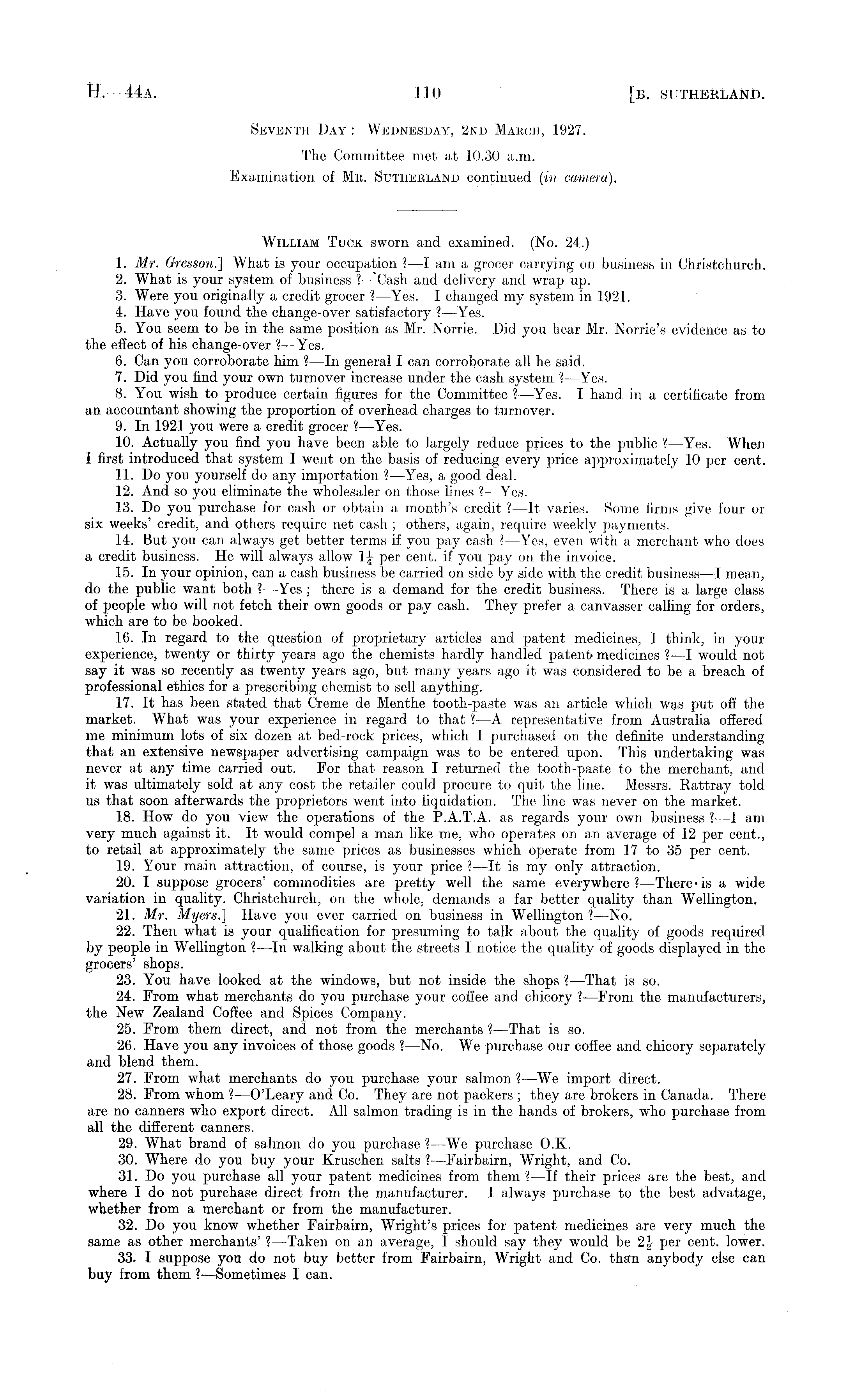 Seventh Day : Wednesday, 2nd March, 1927. The Committee met at 10.30 a.m. Examination of Me. Sutherland continued (in camera). William Tuck sworn and examined. (No. 24.) 1. Mr. Gresson.\ What is your occupation ? —I am a grocer carrying on business in Christchurch. 2. What is your system of business ?—Cash and delivery and wrap up. 3. Were you originally a credit grocer ?—Yes. I changed my system in 1921. 4. Have you found the change-over satisfactory ?—Yes. 5. You seem to be in the same position as Mr. Norrie. Did you hear Mr. Nome's evidence as to the effect of his change-over ?—Yes. 6. Can you corroborate him ? —ln general I can corroborate all he said. 7. Did you find your own turnover increase under the cash system ?—Yes. 8. You wish to produce certain figures for the Committee I—Yes.1 —Yes. I hand in a certificate from an accountant showing the proportion of overhead charges to turnover. 9. In 1921 you were a credit grocer ?—Yes. 10. Actually you find you have been able to largely reduce prices to the public ? —Yes. When I first introduced that system I went on the basis of reducing every price approximately 10 per cent. 11. Do you yourself do any importation ? —Yes, a good deal. 12. And so you eliminate the wholesaler on those lines ? —Yes. 13. Do you purchase for cash or obtain a month's credit ?—lt varies. Some firms give four or six weeks' credit, and others require net cash ; others, again, require weekly payments. 14. But you can always get better terms if you pay cash ? —Yes, even with a merchant who does a credit business. He will always allow 1£ per cent, if you pay on the invoice. 15. In your opinion, can a cash business be carried on side by side with the credit business —I mean, do the public want both ?—Yes ; there is a demand for the credit business. There is a large class of people who will not fetch their own goods or pay cash. They prefer a canvasser calling for orders, which are to be booked. 16. In regard to the question of proprietary articles and patent medicines, I think, in your experience, twenty or thirty years ago the chemists hardly handled patent medicines ? —I would not say it was so recently as twenty years ago, but many years ago it was considered to be a breach of professional ethics for a prescribing chemist to sell anything. 17. It has been stated that Creme de Menthe tooth-paste was an article which wijs put off the market. What was your experience in regard to that ? —A representative from Australia offered me minimum lots of six dozen at bed-rock prices, which I purchased on the definite understanding that an extensive newspaper advertising campaign was to be entered upon. This undertaking was never at any time carried out. For that reason I returned the tooth-paste to the merchant, and it was ultimately sold at any cost the retailer could procure to quit the line. Messrs. Rattray told us that soon afterwards the proprietors went into liquidation. The line was never on the market. 18. How do you view the operations of the P.A.T.A. as regards your own business ? —I am very much against it. It would compel a man like me, who operates on an average of 12 per cent., to retail at approximately the same prices as businesses which operate from 17 to 35 per cent. 19. Your main attraction, of course, is your price ?—lt is my only attraction. 20. I suppose grocers' commodities are pretty well the same everywhere?— There-is a wide variation in quality. Christchurch, on the whole, demands a far better quality than Wellington. 21. Mr. Myers.] Have you ever carried on business in Wellington?— No. 22. Then what is your qualification for presuming to talk about the quality of goods required by people in Wellington ?—ln walking about the streets I notice the quality of goods displayed in the grocers' shops. 23. You have looked at the windows, but not inside the shops ?—That is so. 24. From what merchants do you purchase your coffee and chicory ?• —From the manufacturers, the New Zealand Coffee and Spices Company. 25. From them direct, and not from the merchants ?—That is so. 26. Have you any invoices of those goods ? —No. We purchase our coffee and chicory separately and blend them. 27. From what merchants do you purchase your salmon ? —We import direct. 28. From whom ? —O'Leary and Co. They are not packers ; they are brokers in Canada. There are no canners who export direct. All salmon trading is in the hands of brokers, who purchase from all the different canners. 29. What brand of salmon do you purchase ? —We purchase O.K. 30. Where do you buy your Kruschen salts ? —Fairbairn, Wright, and Co. 31. Do you purchase all your patent medicines from them ?—lf their prices are the best, and where Ido not purchase direct from the manufacturer. I always purchase to the best advatage, whether from a merchant or from the manufacturer. 32. Do you know whether Fairbairn, Wright's prices for patent medicines are very much the same as other merchants' ? —Taken on an average, I should say they would be 2| per cent, lower. 33. I suppose you do not buy better from Fairbairn, Wright and Co. than anybody else can buy from them ? —Sometimes I can.