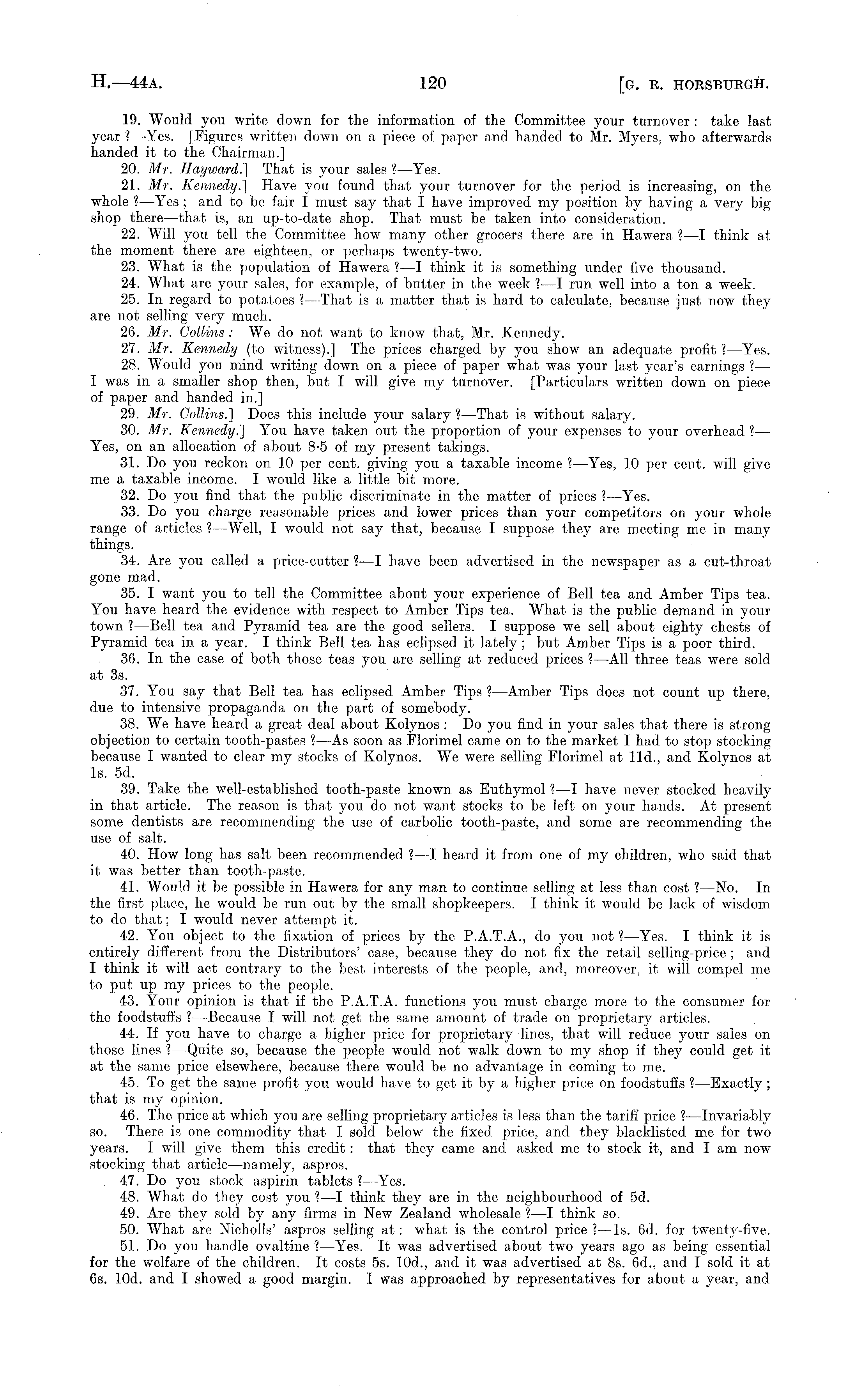 19. Would you write down for the information of the Committee your turnover : take last year ? —Yes. [Figures written down on a piece of paper and handed to Mr. Myers ; who afterwards handed it to the Chairman.] 20. Mr. Hayward.] That is your sales ? —Yes. 21. Mr. Kennedy.] Have you found that your turnover for the period is increasing, on the whole " Yes ; and to be fair I must say that I have improved my position by having a very big shop there—that is, an up-to-date shop. That must be taken into consideration. 22. Will you tell the Committee how many other grocers there are in Hawera ? —I think at the moment there are eighteen, or perhaps twenty-two. 23. What is the population of Hawera ? —I think it is something under five thousand. 24. What are your sales, for example, of butter in the week ?- —I run well into a ton a week. 25. In regard to potatoes ? —That is a matter that is hard to calculate, because just now they are not selling very much. 26. Mr. Collins: We do not want to know that, Mr. Kennedy. 27. Mr. Kennedy (to witness).] The prices charged by you show an adequate profit ? —Yes. 28. Would you mind writing down on a piece of paper what was your last year's earnings ?— I was in a smaller shop then, but I will give my turnover. [Particulars written down on piece of paper and handed in.] 29. Mr. Collins.'] Does this include your salary ?-—That is without salary. 30. Mr. Kennedy.] You have taken out the proportion of your expenses to your overhead ? — Yes, on an allocation of about 8-5 of my present takings. 31. Do you reckon on 10 per cent, giving you a taxable income I—Yes,1 —Yes, 10 per cent, will give me a taxable income. I would like a little bit more. 32. Do you find that the public discriminate in the matter of prices ? —Yes. 33. Do you charge reasonable prices and lower prices than your competitors on your whole range of articles ? —Well, I would not say that, because I suppose they are meeting me in many things. 34. Are you called a price-cutter ?—I have been advertised in the newspaper as a cut-throat gone mad. 35. I want you to tell the Committee about your experience of Bell tea and Amber Tips tea. You have heard the evidence with respect to Amber Tips tea. What is the public demand in your town ?—Bell tea and Pyramid tea are the good sellers. I suppose we sell about eighty chests of Pyramid tea in a year. I think Bell tea has eclipsed it lately ; but Amber Tips is a poor third. 36. In the case of both those teas you are selling at reduced prices I—All1 —All three teas were sold at 3s. 37. You say that Bell tea has eclipsed Amber Tips ?■—Amber Tips does not count up there, due to intensive propaganda on the part of somebody. 38. We have heard a great deal about Kolynos : Do you find in your sales that there is strong objection to certain tooth-pastes ? —As soon as Florimel came on to the market I had to stop stocking because I wanted to clear my stocks of Kolynos. We were selling Florimel at lid., and Kolynos at Is. sd. 39. Take the well-established tooth-paste known as Euthymol ? —I have never stocked heavily in that article. The reason is that you do not want stocks to be left on your hands. At present some dentists are recommending the use of carbolic tooth-paste, and some are recommending the use of salt. 40. How long has salt been recommended ?—I heard it from one of my children, who said that it was better than tooth-paste. 41. Would it be possible in Hawera for any man to continue selling at less than cost ? —No. In the first place, he would be run out by the small shopkeepers. I think it would be lack of wisdom to do that; I would never attempt it. 42. You object to the fixation of prices by the P.A.T.A., do you not ? —Yes. I think it is entirely different from the Distributors' case, because they do not fix the retail selling-price ; and I think it will act contrary to the best interests of the people, and, moreover, it will compel me to put up my prices to the people. 43. Your opinion is that if the P.A.T.A. functions you must charge more to the consumer for the foodstuffs ?—Because I will not get the same amount of trade on proprietary articles. 44. If you have to charge a higher price for proprietary lines, that will reduce your sales on those lines ?—Quite so, because the people would not walk down to my shop if they could get it at the same price elsewhere, because there would be no advantage in coming to me. 45. To get the same profit you would have to get it by a higher price on foodstuffs ? —Exactly ; that is my opinion. 46. The price at which, you are selling proprietary articles is less than the tariff price ? —lnvariably so. There is one commodity that I sold below the fixed price, and they blacklisted me for two years. I will give them this credit: that they came and asked me to stock it, and lam now stocking that article—namely, aspros. 47. Do you stock aspirin tablets ? —Yes. 48. What do they cost you ? —I think they are in the neighbourhood of sd. 49. Are they sold by any firms in New Zealand wholesale ? —I think so. 50. What are Nicholls' aspros selling at: what is the control price ?• —Is. 6d. for twenty-five. 51. Do you handle ovaltine ?—Yes. It was advertised about two years ago as being essential for the welfare of the children. It costs ss. 10d., and it was advertised at Bs. 6d., and I sold it at 6s. lOd. and I showed a good margin. I was approached by representatives for about a year, and