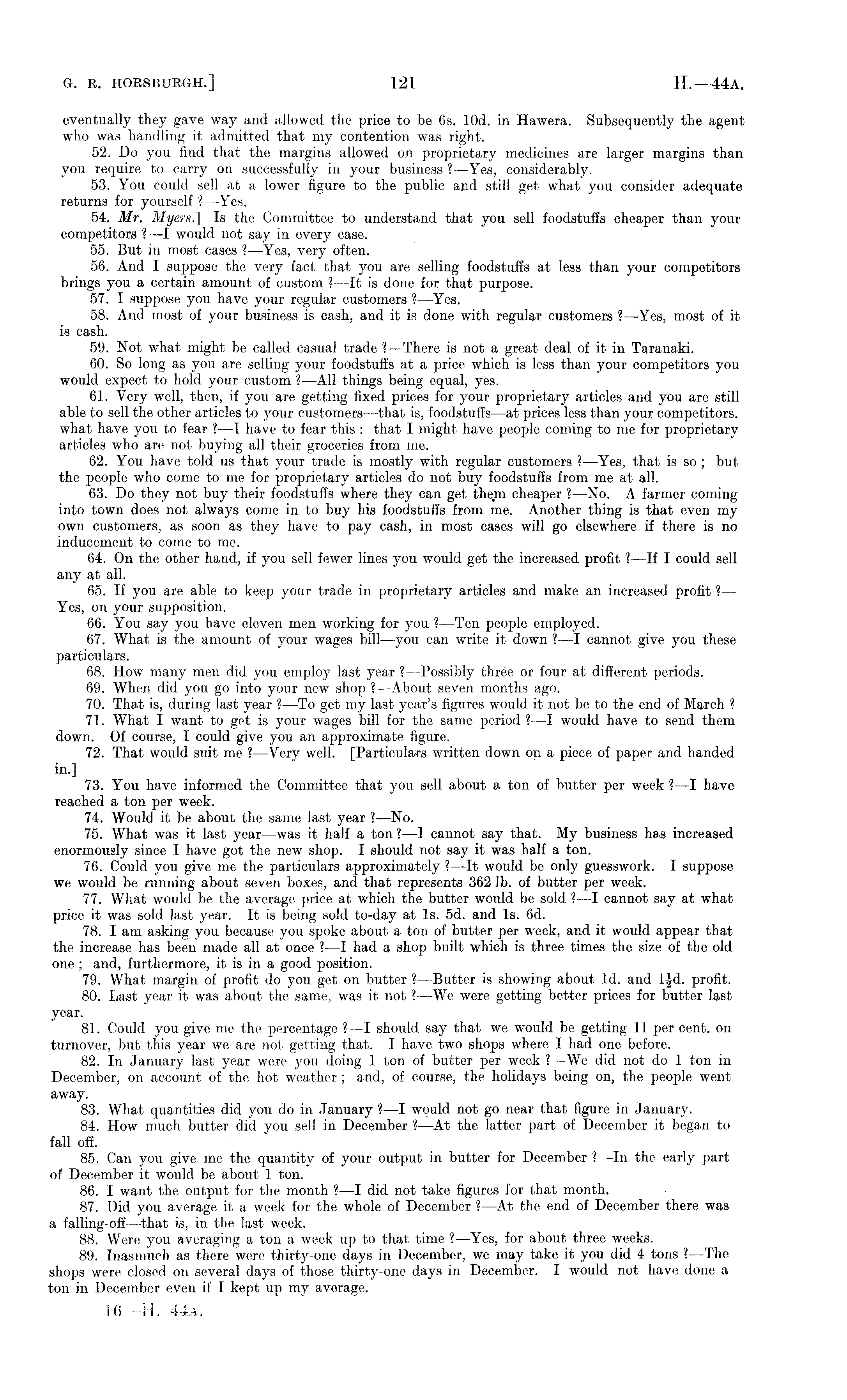 eventually they gave way and allowed the price to be 6s. 10d. in Hawera. Subsequently the agent who was handling it admitted that my contention was right. 52. Do you find that the margins allowed on proprietary medicines are larger margins than you require to carry on successfully in your business ? —Yes, considerably. 53. You could sell at a lower figure to the public and still get what you consider adequate returns for yourself ? —Yes. 54. Mr. Myers.] Is the Committee to understand that you sell foodstuffs cheaper than your competitors I—l1 —I would not say in every case. 55. But in most cases ? —Yes, very often. 56. And I suppose the very fact that you are selling foodstuffs at less than your competitors brings you a certain amount of custom ?—lt is done for that purpose. 57. I suppose you have your regular customers ? —Yes. 58. And most of your business is cash, and it is done with regular customers ?—Yes, most of it is cash. 59. Not what might be called casual trade ? —There is not a great deal of it in Taranaki. 60. So long as you are selling your foodstuffs at a price which is less than your competitors you would expect to hold your custom ? —All things being equal, yes. 61. Very well, then, if you are getting fixed prices for your proprietary articles and you are still able to sell the other articles to your customers —that is, foodstuffs—at prices less than your competitors, what have you to fear ? —I have to fear this : that I might have people coming to me for proprietary articles who are not buying all their groceries from me. 62. You have told us that your trade is mostly with regular customers ? —Yes, that is so ; but the people who come to me for proprietary articles do not buy foodstuffs from me at all. 63. Do they not buy their foodstuffs where they can get them cheaper ?—No. A farmer coming into town does not always come in to buy his foodstuffs from me. Another thing is that even my own customers, as soon as they have to pay cash, in most cases will go elsewhere if there is no inducement to come to me. 64. On the other hand, if you sell fewer lines you would get the increased profit ? —lf I could sell any at all. 65. If you are able to keep your trade in proprietary articles and make an increased profit ? — Yes, on your supposition. 66. You say you have eleven men working for you ? —-Ten people employed. 67. What is the amount of your wages bill —you can write it down ? —I cannot give you these particulars. 68. How many men did you employ last year ?—Possibly three or four at different periods. 69. When did you go into your new shop ? —About seven months ago. 70. That is, during last year ? —To get my last year's figures would it not be to the end of March ? 71. What I want to get is your wages bill for the same period I—l would have to send them down. Of course, I could give you an approximate figure. 72. That would suit me ? —Very well. [Particulars written down on a piece of paper and handed in.] 73. You have informed the Committee that you sell about a. ton of butter per week ? —I have reached a ton per week. 74. Would it be about the same last year ?—No. 75. What was it last year —was it half a ton ? —I cannot say that. My business has increased enormously since I have got the new shop. I should not say it was half a ton. 76. Could you give me the particulars approximately ? —lt would be only guesswork. I suppose we would be running about seven boxes, and that represents 362 lb. of butter per week. 77. What would be the average price at which the butter would be sold ? —I cannot say at what price it was sold last year. It is being sold to-day at Is. sd. and Is. 6d. 78. I am asking you because you spoke about a ton of butter per week, and it would appear that the increase has been made all at once ? —I had a shop built which is three times the size of the old one ; and, furthermore, it is in a good position. 79. What margin of profit do you get on butter ? —Butter is showing about Id. and l|-d. profit. 80. Last year it was about the same, was it not ? —We were getting better prices for butter last year. 81. Could you give me the percentage ? —I should say that we would be getting 11 per cent, on turnover, but this year we are not getting that. I have two shops where I had one before. 82. In January last year were you doing 1 ton of butter per week ? —We did not do 1 ton in December, on account of the hot weather ; and, of course, the holidays being on, the people went away. 83. What quantities did you do in January ?—I would not go near that figure in January. 84. How much butter did you sell in December \ —At the latter part of December it began to fall off. 85. Can you give me the quantity of your output in butter for December ? —ln the early part of December it would be about 1 ton. 86. I want the output for the month ?—I did not take figures for that month. 87. Did you average it a week for the whole of December ?—At the end of December there was a falling-off—that is, in the last week. 88. Were you averaging a ton a week up to that time ? —Yes, for about three weeks. 89. Inasmuch as there were thirty-one days in December, we may take it you did 4 tons ? —The shops were closed on several days of those thirty-one days in December. I would not have done a ton in December even if I kept up my average.
