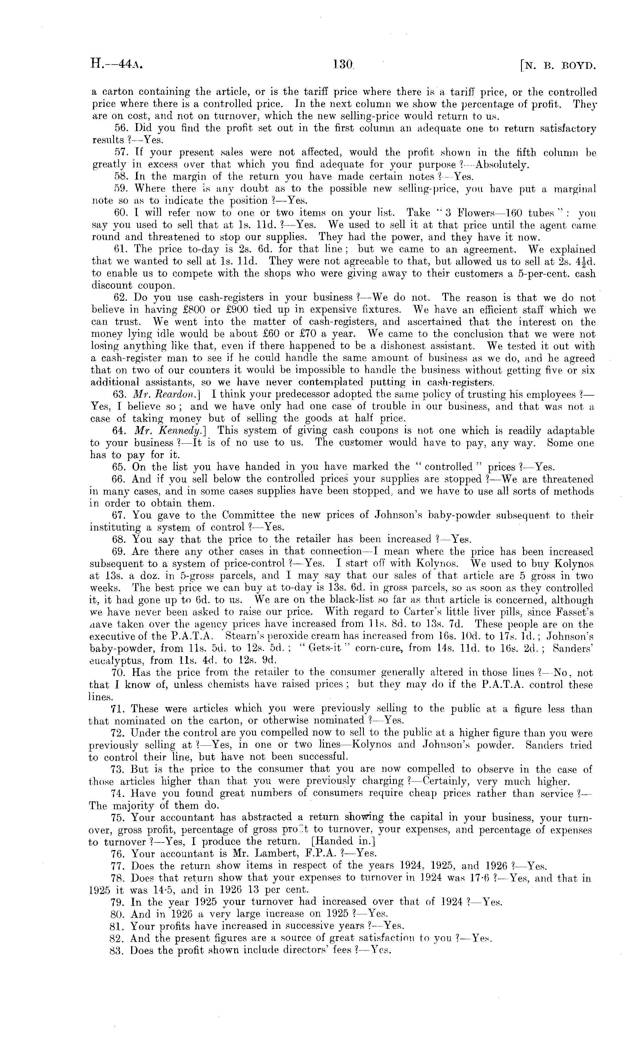 a carton containing the article, or is the tariff price where there is a tariff price, or the controlled price where there is a controlled price. In the next column we show the percentage of profit. They are on cost, and not on turnover, which the new selling-price would return to us. 56. Did you find the profit set out in the first column an adequate one to return satisfactory results ?—-Yes. 57. If your present sales were not affected, would the profit shown in the fifth column be greatly in excess over that which you find adequate for your purpose ?- Absolutely. 58. In the margin of the return you have made certain notes ? —Yes. 59. Where there is any doubt as to the possible new selling-price, you have put a marginal note so as to indicate the position ?—Yes. 60. I will refer now to one Or two items on your list. Take " 3 Flowers —160 tubes " : you say you used to sell that at Is. lid. ? —Yes. We used to sell it at that price until the agent came round and threatened to stop our supplies. They had the power, and they have it now. 61. The price to-day is 2s. 6d. for that line; but we came to an agreement. We explained that we wanted to sell at Is. lid. They were not agreeable to that, but allowed us to sell at 2s. 4|d. to enable us to compete with the shops who were giving away to their customers a 5-per-cent. cash discount coupon. 62. Do you use cash-registers in your business ?—We do not. The reason is that we do not believe in having £800 or £900 tied up in expensive fixtures. We have an efficient staff which we can trust. We went into the matter of cash-registers, and ascertained that the interest on the money lying idle would be about £60 or £70 a year. We came to the conclusion that we were not losing anything like that, even if there happened to be a dishonest assistant. We tested it out with a cash-register man to see if he could handle the same amount of business as we do, and he agreed that on two of our counters it would be impossible to handle the business without getting five or six additional assistants, so we have never contemplated putting in cash-registers. 63. Mr. Reardon.\ I think your predecessor adopted the same policy of trusting his employees ? — Yes, I believe so ; and we have only had one case of trouble in our business, and that was not a case of taking money but of selling the goods at half price. 64. Mr. Kennedy.] This system of giving cash coupons is not one which is readily adaptable to your business ?—lt is of no use to us. The customer would have to pay, any way. Some one has to pay for it. 65. On the list you have handed in you have marked the " controlled " prices ? —Yes. 66. And if you sell below the controlled prices your supplies are stopped ?- We are threatened in many cases, and in some cases supplies have been stopped, and we have to use all sorts of methods in order to obtain them. 67. You gave to the Committee the new prices of Johnson's baby-powder subsequent to their instituting a system of control ? —Yes. 68. You say that the price to the retailer has been increased ? —Yes. 69. Are there any other oases in that connection —I mean where the price has been increased subsequent to a system of price-control ?—Yes. I start off with Kolynos. We used to buy Kolynos at 13s. a doz. in 5-gross parcels, and I may say that our sales of that article are 5 gross in two weeks. The best price we can buy at to-day is 13s. 6d. in gross parcels, so as soon as they controlled it, it had gone up to 6d. to us. We are on the black-list so far as that article is concerned, although we have never been asked to raise our price. With regard to Carter's little liver pills, since Fasset's aave taken over the agency prices have increased from lis. Bd. to 13s. 7d. These people are on the executive of the P.A.T.A. Steam's peroxide cream has increased from 16s. lOd. to 17s. Id.; Johnson's baby-powder, from lis. sd. to 12s. sd. ; " Gets-it " corn-cure, from 14s. lid. to 16s. 2d. ; Sanders' eucalyptus, from lis. 4d. to 12s. 9d. 70. Has the price from the retailer to the consumer generally altered in those lines I—No,1 —No, not that I know of, unless chemists have raised prices ; but they may do if the P.A.T.A. control these lines. 71. These were articles which you were previously selling to the public at a figure less than that nominated on the carton, or otherwise nominated ?- Yes. 72. Under the control are you compelled now to sell to the public at a higher figure than you were previously selling at ?—Yes, in one or two lines—Kolynos and Johnson's powder. Sanders tried to control their line, but have not been successful. 73. But is the price to the consumer that you are now compelled to observe in the case of those articles higher than that you were previously charging ? —Certainly, very much higher. 74. Have you found great numbers of consumers require cheap prices rather than service ?— The majority of them do. 75. Your accountant has abstracted a return showing the capital in your business, your turnover, gross profit, percentage of gross pro' t to turnover, your expenses, and percentage of expenses to turnover I—Yes,1 —Yes, I produce the return. [Handed in.] 76. Your accountant is Mr. Lambert, F.P.A. ? —Yes. 77. Does the return show items in respect of the years 1924. 1925, and 1926 ?—Yes. 78. Does that return show that your expenses to turnover in 1924 was 17-6 ? —Yes, and that in 1925 it was 14'5, and in 1926 13 per cent. 79. In the year 1925 your turnover had increased over that of 1924 ? —Yes. 80. And in 1926 a very large increase on 1925 ? —Yes. 81. Your profits have increased in successive years ? —Yes. 82. And the present figures are a source of great satisfaction to you ? —Yes. 83. Does the profit shown include directors' fees ? —Yes.