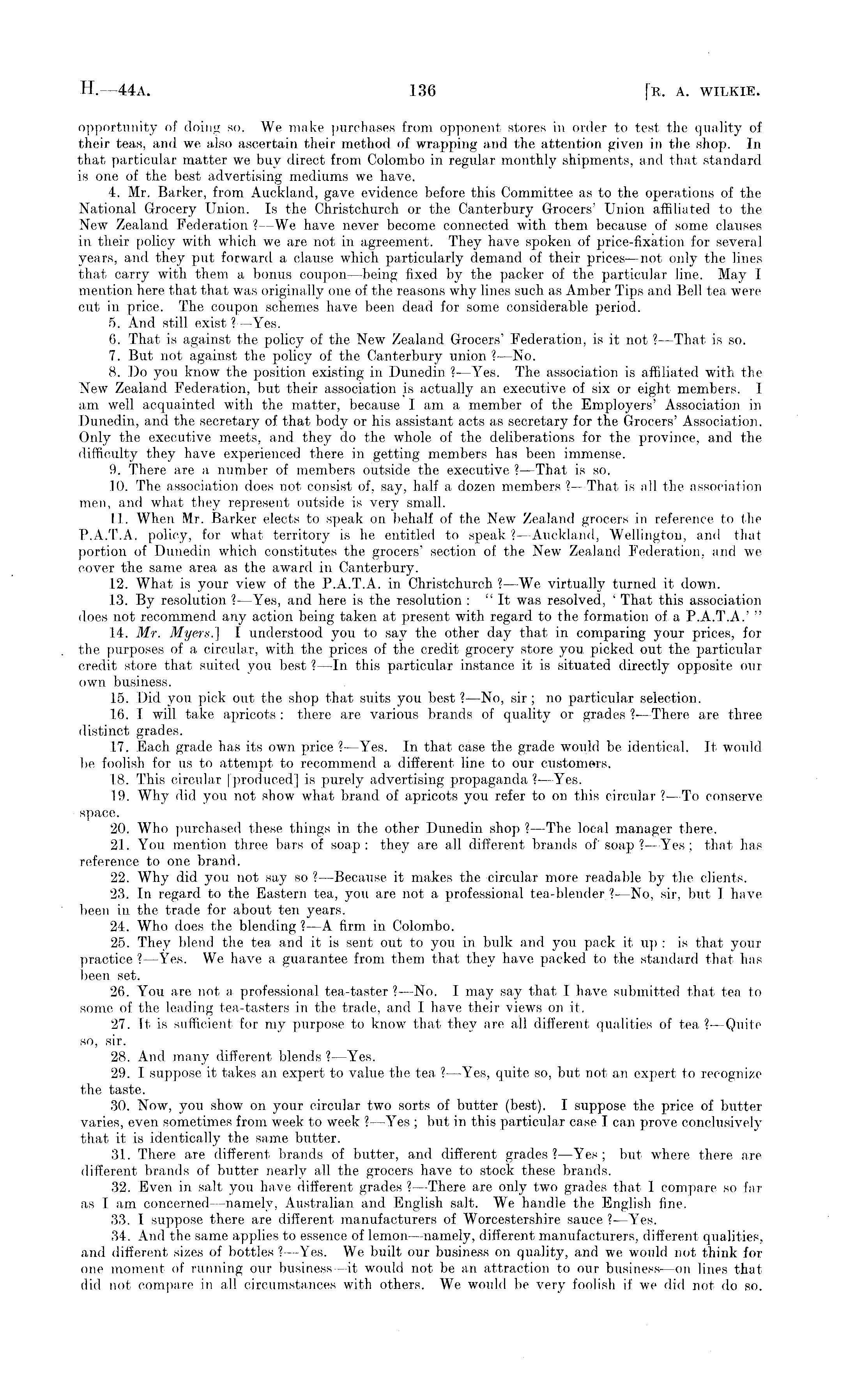 opportunity of doing so. We make purchases from opponent stores in order to test the quality of their teas, and we also ascertain their method of wrapping and the attention given in the shop. In that particular matter we buy direct from Colombo in regular monthly shipments, and that standard is one of the best advertising mediums we have. 4. Mr. Barker, from Auckland, gave evidence before this Committee as to the operations of the National Grocery Union. Is the Christchurch or the Canterbury Grocers' Union affiliated to the New Zealand Federation ? —We have never become connected with them because of some clauses in their policy with which we are not in agreement. They have spoken of price-fixation for several years, and they put forward a clause which particularly demand of their prices—not only the lines that carry with them a bonus coupon—being fixed by the packer of the particular line. May I mention here that that was originally one of the reasons why lines such as Amber Tips and Bell tea were cut in price. The coupon schemes have been dead for some considerable period. 5. And still exist ? —Yes. 0. That is against the policy of the New Zealand Grocers' Federation, is it not ? —That is so. 7. But not against the policy of the Canterbury union ? —No. 8. Do you know the position existing in Dunedin ? —Yes. The association is affiliated with the New Zealand Federation, but their association is actually an executive of six or eight members. I am well acquainted with the matter, because I am a member of the Employers' Association in Dunedin, and the secretary of that body or his assistant acts as secretary for the Grocers' Association. Only the executive meets, and they do the whole of the deliberations for the province, and the difficulty they have experienced there in getting members has been immense. 9. There are a number of members outside the executive ? —That is so. 10. The association does not consist of, say, half a dozen members ?— That is all the association men, and what they represent outside is very small. 11. When Mr. Barker elects to speak on behalf of the New Zealand grocers in reference to the P.A.T.A. policy, for what territory is he entitled to speak ? —Auckland, Wellington, and that portion of Dunedin which constitutes the grocers' section of the New Zealand Federation, and we cover the same area as the award in Canterbury. 12. What is your view of the P.A.T.A. in Christchurch ? —We virtually turned it down. 13. By resolution ? —Yes, and here is the resolution : "It was resolved, ' That this association does not recommend any action being taken at present with regard to the formation of a P.A.T.A.' " 14. Mr. Myers.\ I understood you to say the other day that in comparing your prices, for the purposes of a circular, with the prices of the credit grocery store you picked out the particular credit store that suited you best ?- In this particular instance it is situated directly opposite our own business. 15. Did you pick out the shop that suits you best ?■ —No, sir ; no particular selection. 1.6. T will take apricots: there are various brands of quality or grades?— There are three distinct grades. 17. Each grade has its own price ?—Yes. In that case the grade would be identical. It would be foolish for us to attempt to recommend a different line to our customers. 18. This circular [produced] is purely advertising propaganda ?- —Yes. 19. Why did you not show what brand of apricots you refer to on this circular ? —To conserve space. 20. Who purchased these things in the other Dunedin shop ? —The local manager there. 21. You mention three bars of soap : they are all different brands of soap ?—Yes; that has reference to one brand. 22. Why did you not say so ? —Because it makes the circular more readable by the clients. 23. In regard to the Eastern tea, you are not a professional tea-blender ?■ —No, sir, but I have been in the trade for about ten years. 24. Who does the blending ? —A firm in Colombo. 25. They blend the tea and it is sent out to you in bulk and you pack it up : is that your practice ? —Yes. We have a guarantee from them that they have packed to the standard that has been set. 26. You are not a professional tea-taster ?—No. I may say that I have submitted that tea to some of the leading tea-tasters in the trade, and I have their views on it. 27. It is sufficient for my purpose to know that they are all different qualities of tea ? —Quite so, sir. 28. And many different blends ? —Yes. 29. I suppose it takes an expert to value the tea ? —Yes, quite so, but not an expert to recognize the taste. 30. Now, you show on your circular two sorts of butter (best). I suppose the price of butter varies, even sometimes from week to week ? —Yes ; but in this particular case I can prove conclusively that it is identically the same butter. 31. There are different brands of butter, and different grades?— Yes; but where there are different brands of butter nearly all the grocers have to stock these brands. 32. Even in salt you have different grades ?—There are only two grades that ] compare so far as I am concerned —namely, Australian and English salt. We handle the English fine. 33. I suppose there are different manufacturers of Worcestershire sauce ?-—Yes. 34. And the same applies to essence of lemon—namely, different manufacturers, different qualities, and different sizes of bottles ? —Yes. We built our business on quality, and we would not think for one moment of running our business- it would not be an attraction to our business-—on lines that did not compare in all circumstances with others. We would be very foolish if we did not do so.