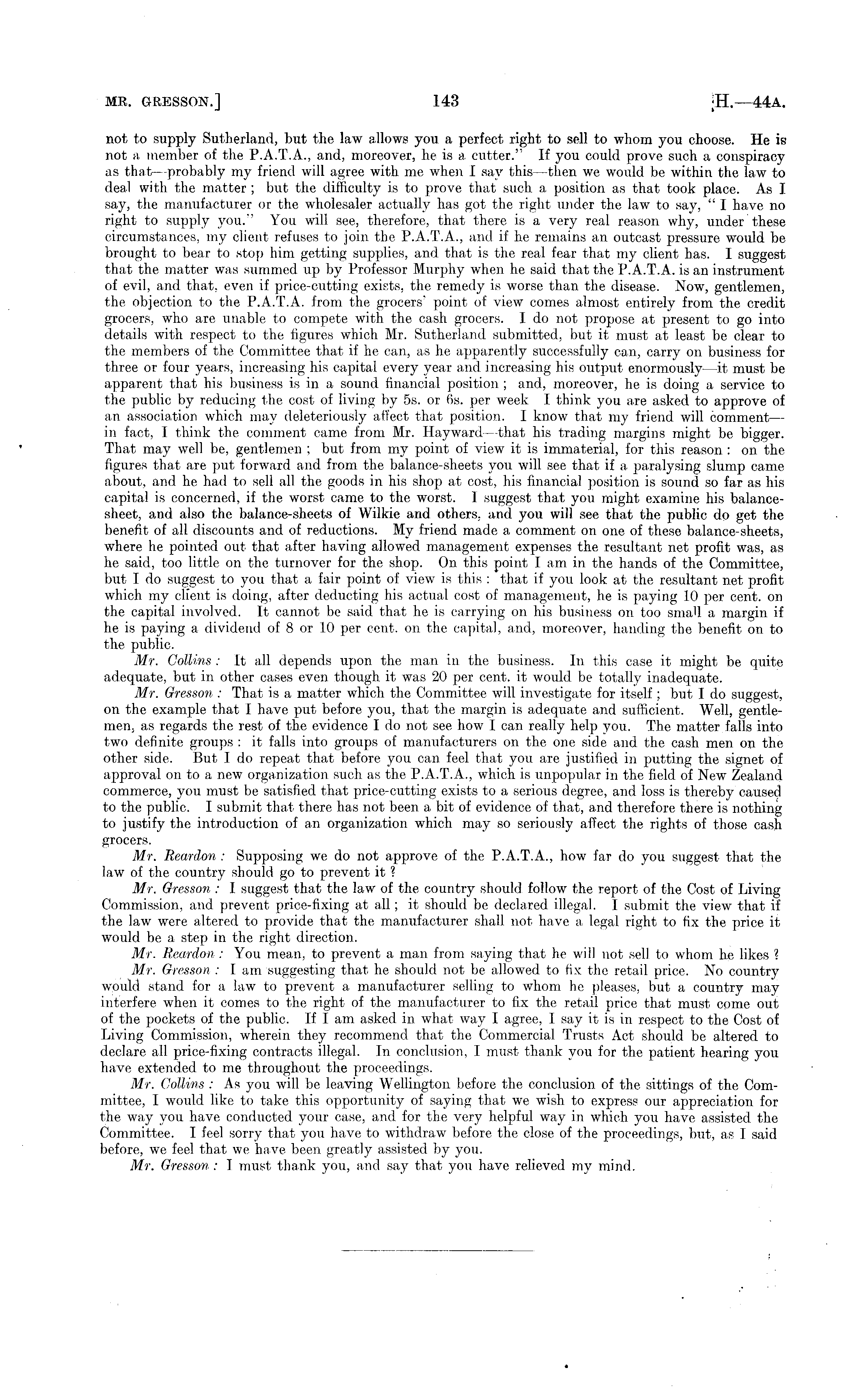 not to supply Sutherland, but the law allows you a perfect right to sell to whom you choose. He is not a member of the P.A.T.A., and, moreover, he is a cutter." If you could prove such a conspiracy as that—probably my friend will agree with me when I say this—then we would be within the law to deal with the matter; but the difficulty is to prove that such a position as that took place. As I say, the manufacturer or the wholesaler actually has got the right under the law to say, " I have no right to supply you." You will see, therefore, that there is a very real reason why, under these circumstances, my client refuses to join the P.A.T.A., and if he remains an outcast pressure would be brought to bear to stop him getting supplies, and that is the real fear that my client has. I suggest that the matter was summed up by Professor Murphy when he said that the P.A.T.A. is an instrument of evil, and that, even if price-cutting exists, the remedy is worse than the disease. Now, gentlemen, the objection to the P.A.T.A. from the grocers' point of view comes almost entirely from the credit grocers, who are unable to compete with the cash grocers. Ido not propose at present to go into details with respect to the figures which Mr. Sutherland submitted, but it must at least be clear to the members of the Committee that if he can, as he apparently successfully can, carry on business for three or four years, increasing his capital every year and increasing his output enormously—it must be apparent that his business is in a sound financial position ; and, moreover, he is doing a service to the public by reducing the cost of living by ss. or 6s. per week I think you are asked to approve of an association which may deleteriously affect that position. I know that my friend will comment — in fact, I think the comment came from Mr. Hayward —that his trading margins might be bigger. That may well be, gentlemen ; but from my point of view it is immaterial, for this reason : on the figures that are put forward and from the balance-sheets you will see that if a paralysing slump came about, and he had to sell all the goods in his shop at cost, his financial position is sound so far as his capital is concerned, if the worst came to the worst. I suggest that you might examine his balancesheet, and also the balance-sheets of Wilkie and others, and you will see that the public do get the benefit of all discounts and of reductions. My friend made a comment on one of these balance-sheets, where he pointed out that after having allowed management expenses the resultant net profit was, as he said, too little on the turnover for the shop. On this point lam in the hands of the Committee, but I do suggest to you that a fair point of view is this : that if you look at the resultant net profit which my client is doing, after deducting his actual cost of management, he is paying 10 per cent, on the capital involved. It cannot be said that he is carrying on his business on too small a margin if he is paying a dividend of 8 or 10 per cent, on the capital, and, moreover, handing the benefit on to the public. Mr. Collins : It all depends upon the man in the business. In this case it might be quite adequate, but in other cases even though it was 20 per cent, it would be totally inadequate. Mr. Gresson : That is a matter which the Committee will investigate for itself ; but I do suggest, on the example that I have put before you, that the margin is adequate and sufficient. Well, gentlemen, as regards the rest of the evidence Ido not see how I can really help you. The matter , falls into two definite groups : it falls into groups of manufacturers on the one side and the cash men on the other side. But Ido repeat that before you can feel that you are justified in putting the signet of approval on to a new organization such as the P.A.T.A., which is unpopular in the field of New Zealand commerce, you must be satisfied that price-cutting exists to a serious degree, and loss is thereby caused to the public. I submit that there has not been a bit of evidence of that, and therefore there is nothing to justify the introduction of an organization which may so seriously affect the rights of those cash grocers. Mr. Reardon : Supposing we do not approve of the P.A.T.A., how far do you suggest that the law of the country should go to prevent it 1 Mr. Gresson : I suggest that the law of the country should follow the report of the Cost of Living Commission, and prevent price-fixing at all; it should be declared illegal. I submit the view that if the law were altered to provide that the manufacturer shall not have a legal right to fix the price it would be a step in the right direction. Mr. Reardon : You mean, to prevent a man from saying that he will not sell to whom he likes ? Mr. Gresson : lam suggesting that he should not be allowed to fix the retail price. No country would stand for a law to prevent a manufacturer selling to whom he pleases, but a country may interfere when it comes to the right of the manufacturer to fix the retail price that must come out of the pockets of the public. If lam asked in what way I agree, I say it is in respect to the Cost of Living Commission, wherein they recommend that the Commercial Trusts Act should be altered to declare all price-fixing contracts illegal. In conclusion, I must thank you for the patient hearing you have extended to me throughout the proceedings. Mr. Collins : As you will be leaving Wellington before the conclusion of the sittings of the Committee, I would like to take this opportunity of saying that we wish to express our appreciation for the way you have conducted your case, and for the very helpful way in which you have assisted the Committee. I feel sorry that you have to withdraw before the close of the proceedings, but, as I said before, we feel that we have been greatly assisted by you. Mr. Gresson: I must thank you, and say that you have relieved my mind.