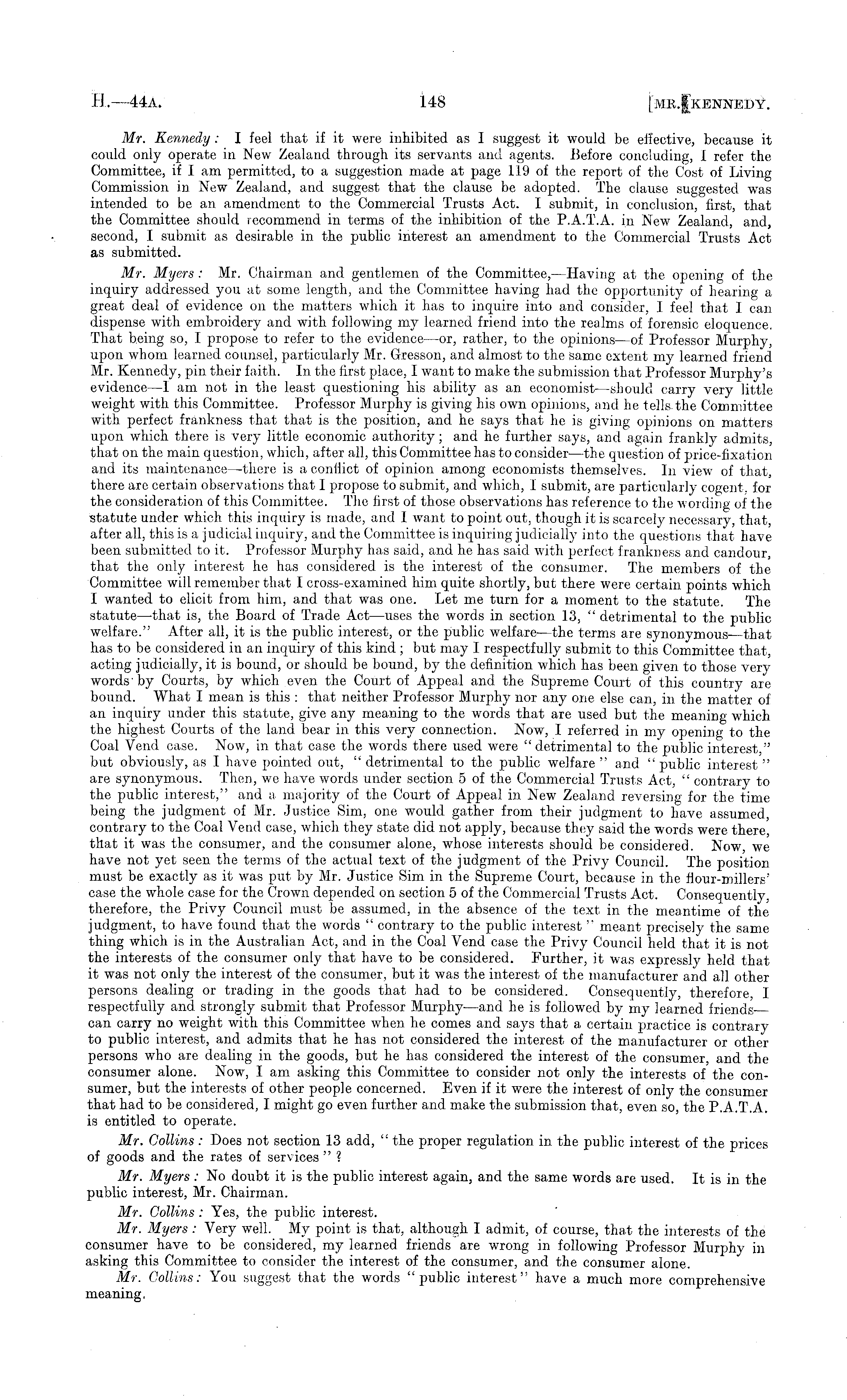 Mr. Kennedy: I feel that if it were inhibited as I suggest it would be effective, because it could only operate in New Zealand through its servants and agents. Before concluding, I refer the Committee, if I am permitted, to a suggestion made at page 119 of the report of the Cost of Living Commission in New Zealand, and suggest that the clause be adopted. The clause suggested was intended to be an amendment to the Commercial Trusts Act. I submit, in conclusion, first, that the Committee should recommend in terms of the inhibition of the P.A.T.A. in New Zealand, and, second, I submit as desirable in the public interest an amendment to the Commercial Trusts Act as submitted. Mr. Myers: Mr. Chairman and gentlemen of the Committee, —Having at the opening of the inquiry addressed you at some length, and the Committee having had the opportunity of hearing a great deal of evidence on the matters which it has to inquire into and consider, 1 feel that I can dispense with embroidery and with following my learned friend into the realms of forensic eloquence. That being so, I propose to refer to the evidence —or, rather, to the opinions—of Professor Murphy, upon whom learned counsel, particularly Mr. Gresson, and almost to the Same extent my learned friend Mr. Kennedy, pin their faith. In the first place, I want to make the submission that Professor Murphy's evidence —I am not in the least questioning his ability as an economist—should carry very little weight with this Committee. Professor Murphy is giving his own opinions, and he tells, the Committee with perfect frankness that that is the position, and he says that he is giving opinions on matters upon which there is very little economic authority; and he further says, and again frankly admits, that on the main question, which, after all, this Committee has to consider—the question of price-fixation and its maintenance—-there is a conflict of opinion among economists themselves. In view of that, there are certain observations that I propose to submit, and which, I submit, are particularly cogent, for the consideration of this Committee. The first of those observations has reference to the wording of the Statute under which this inquiry is made, and I want to point out, though it is scarcely necessary, that, after all, this is a judicial inquiry, and the Committee is inquiring judicially into the questions that have been submitted to it. Professor Murphy has said, and he has said with perfect frankness and candour, that the only interest he has considered is the interest of the consumer. The members of the Committee will remember that I cross-examined him quite shortly, but there were certain points which I wanted to elicit from him, and that was one. Let me turn for a moment to the statute. The statute —that is, the Board of Trade Act —uses the words in section 13, " detrimental to the public welfare." After all, it is the public interest, or the public welfare—the terms are synonymous—that has to be considered in an inquiry of this kind ; but may I respectfully submit to this Committee that, acting judicially, it is bound, or should be bound, by the definition which has been given to those very words'by Courts, by which even the Court of Appeal and the Supreme Court of this country are bound. What I mean is this : that neither Professor Murphy nor any one else can, in the matter of an inquiry under this statute, give any meaning to the words that are used but the meaning which the highest Courts of the land bear in this very connection. Now, I referred in my opening to the Coal Vend case. Now, in that case the words there used were "detrimental to the public interest," but obviously, as I have pointed out, " detrimental to the public welfare " and " public interest " are synonymous. Then, we have words under section sof the Commercial Trusts Act, " contrary to the public interest," and a majority of the Court of Appeal in New Zealand reversing for the time being the judgment of Mr. Justice Sim, one would gather from their judgment to have assumed, contrary to the Coal Vend case, which they state did not apply, because they said the words were there, that it was the consumer, and the consumer alone, whose interests should be considered. Now, we have not yet seen the terms of the actual text of the judgment of the Privy Council. The position must be exactly as it was put by Mr. Justice Sim in the Supreme Court, because in the flour-millers' case the whole case for the Crown depended on section sof the Commercial Trusts Act. Consequently, therefore, the Privy Council must be assumed, in the absence of the text in the meantime of the judgment, to have found that the words " contrary to the public interest" meant precisely the same thing which is in the Australian Act, and in the Coal Vend case the Privy Council held that it is not the interests of the consumer only that have to be considered. Further, it was expressly held that it was not only the interest of the consumer, but it was the interest of the manufacturer and all other persons dealing or trading in the goods that had to be considered. Consequently, therefore, I respectfully and strongly submit that Professor Murphy—and he is followed by my learned friends can carry no weight with this Committee when he comes and says that a certain practice is contrary to public interest, and admits that he has not considered the interest of the manufacturer or other persons who are dealing in the goods, but he has considered the interest of the consumer, and the consumer alone. Now, lam asking this Committee to consider not only the interests of the consumer, but the interests of other people concerned. Even if it were the interest of only the consumer that had to be considered, I might go even further and make the submission that, even so, the P.A.T.A. is entitled to operate. Mr. Collins : Does not section 13 add, " the proper regulation in the public interest of the prices of goo