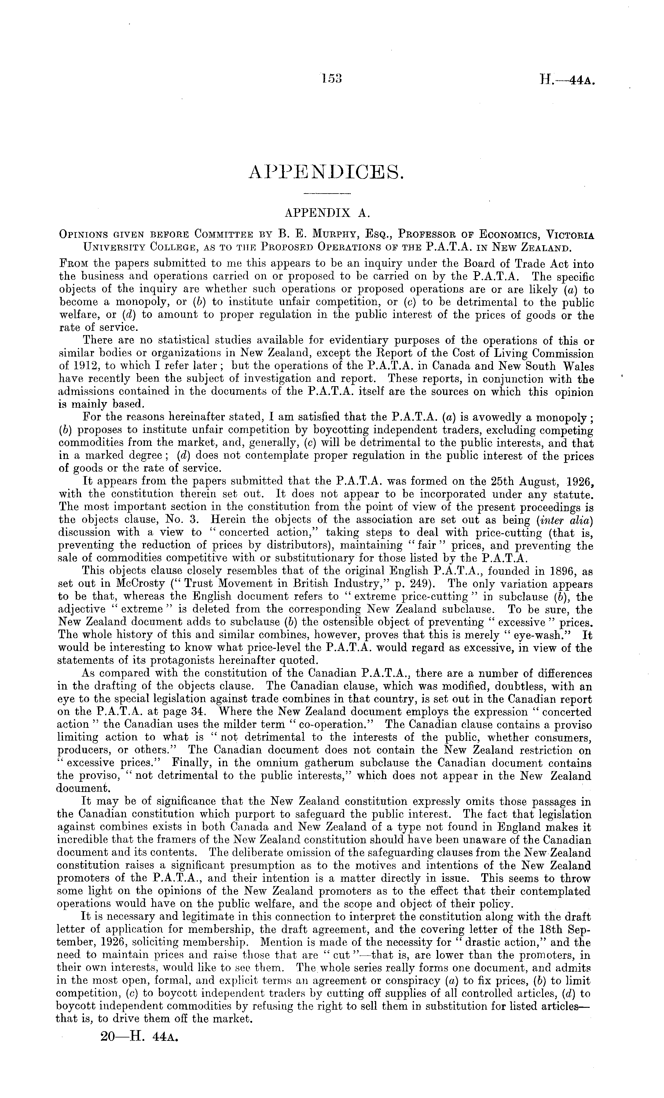 APPENDICES. APPENDIX A. Opinions given before Committee by B. E. Murphy, Esq., Professor of Economics, Victoria University College, as to the Proposed Operations of the P.A.T.A. in New Zealand. From the papers submitted to me this appears to be an inquiry under the Board of Trade Act into the business and operations carried on or proposed to be carried on by the P.A.T.A. The specific objects of the inquiry are whether such operations or proposed operations are or are likely (a) to become a monopoly, or (b) to institute unfair competition, or (c) to be detrimental to the public welfare, or (d) to amount to proper regulation in the public interest of the prices of goods or the rate of service. There are no statistical studies available for evidentiary purposes of the operations of this or similar bodies or organizations in New Zealand, except the Report of the Cost of Living Commission of 1912, to which I refer later; but the operations of the P.A.T.A. in Canada and New South Wales have recently been the subject of investigation and report. These reports, in conjunction with the admissions contained in the documents of the P.A.T.A. itself are the sources on which this opinion is mainly based. For the reasons hereinafter stated, I am satisfied that the P.A.T.A. (a) is avowedly a monopoly ; (b) proposes to institute unfair competition by boycotting independent traders, excluding competing commodities from the market, and, generally, (c) will be detrimental to the public interests, and that in a marked degree ; (d) does not contemplate proper regulation in the public interest of the prices of goods or the rate of service. It appears from the papers submitted that the P.A.T.A. was formed on the 25th August, 1926, with the constitution therein set out. It does not appear to be incorporated under any statute. The most important section in the constitution from the point of view of the present proceedings is the objects clause, No. 3. Herein the objects of the association are set out as being (inter alia) discussion with a view to " concerted action," taking steps to deal with price-cutting (that is, preventing the reduction of prices by distributors), maintaining " fair " prices, and preventing the sale of commodities competitive with or substitutionary for those listed by the P.A.T.A. This objects clause closely resembles that of the original English P.A.T.A., founded in 1896, as set out in McCrosty (" Trust Movement in British Industry," p. 249). The only variation appears to be that, whereas the English document refers to " extreme price-cutting " in subclause (5), the adjective " extreme "is deleted from the corresponding New Zealand subclause. To be sure, the New Zealand document adds to subclause (b) the ostensible object of preventing " excessive " prices. The whole history of this and similar combines, however, proves that this is merely " eye-wash." It would be interesting to know what price-level the P.A.T.A. would regard as excessive, in view of the statements of its protagonists hereinafter quoted. As compared with the constitution of the Canadian P.A.T.A., there are a number of differences in the drafting of the objects clause. The Canadian clause, which was modified, doubtless, with an eye to the special legislation against trade combines in that country, is set out in the Canadian report on the P.A.T.A. at page 34. Where the New Zealand document employs the expression " concerted action " the Canadian uses the milder term " co-operation." The Canadian clause contains a proviso limiting action to what is " not detrimental to the interests of the public, whether consumers, producers, or others." The Canadian document does not contain the New Zealand restriction on " excessive prices." Finally, in the omnium gatherum subclause the Canadian document contains the proviso, " not detrimental to the public interests," which does not appear in the New Zealand document. It may be of significance that the New Zealand constitution expressly omits those passages in the Canadian constitution which purport to safeguard the public interest. The fact that legislation against combines exists in both Canada and New Zealand of a type not found in England makes it incredible that the framers of the New Zealand constitution should have been unaware of the Canadian document and its contents. The deliberate omission of the safeguarding clauses from the New Zealand constitution raises a significant presumption as to the motives and intentions of the New Zealand promoters of the P.A.T.A., and their intention is a matter directly in issue. This seems to throw some light on the opinions of the New Zealand promoters as to the effect that their contemplated operations would have on the public welfare, and the scope and object of their policy. It is necessary and legitimate in this connection to interpret the constitution along with the draft letter of application for membership, the draft agreement, and the covering letter of the 18th September, 1926, soliciting membership. Mention is made of the necessity for " drastic action," and the need to maintain prices and raise those that are " cut" —that is, are lower than the promoters, in their own interests, would like to see them. The whole series really forms one document, and admits in the most open, formal, and explicit terms an agreement or conspiracy (a) to fix prices, (b) to limit competition, (c) to boycott independent traders by cutting off supplies of all controlled articles, (d) to boycott independent commodities by refusing the right to sell them in substitution for listed articles— that is, to drive them off the market.