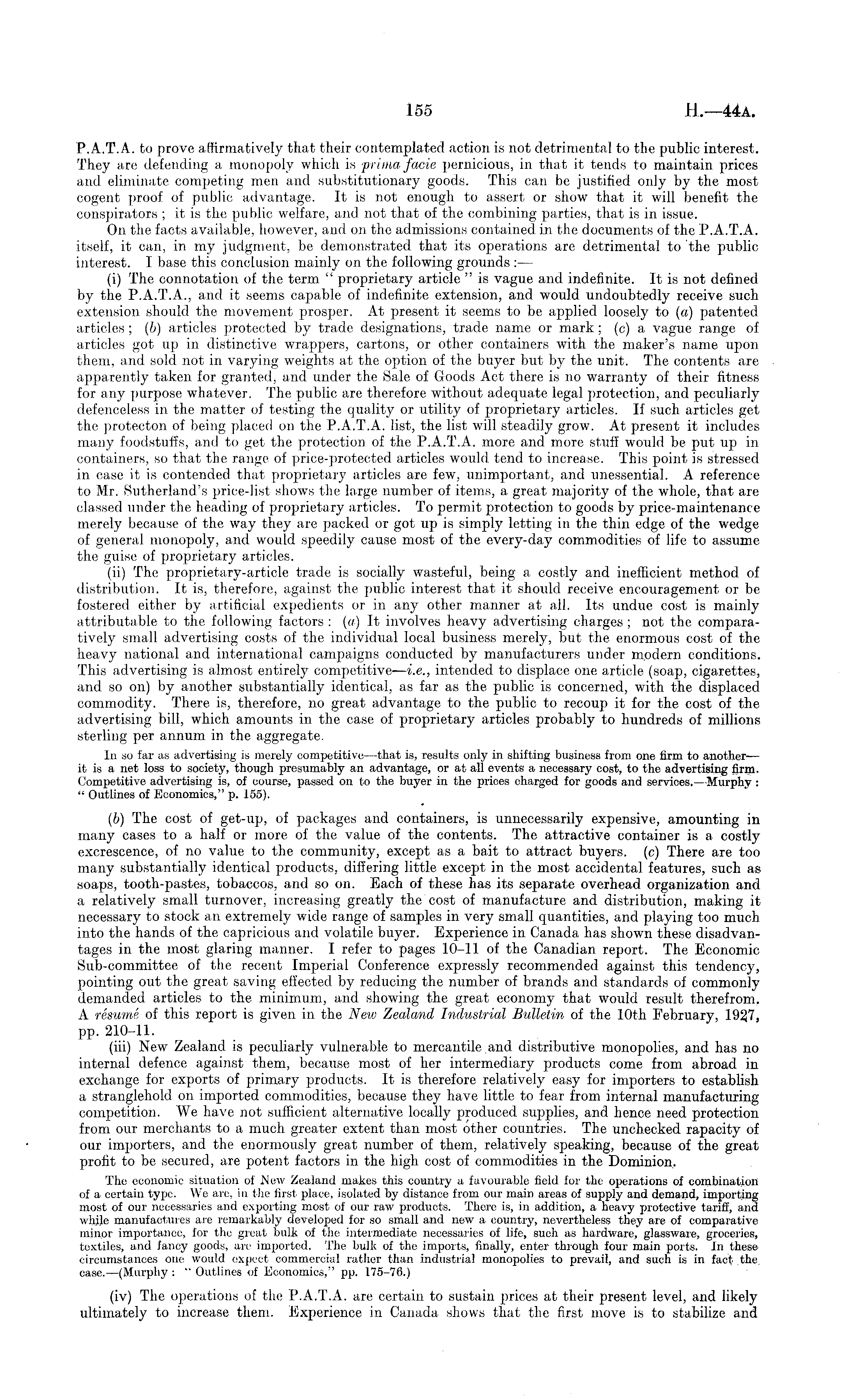 P.A.T.A. to prove affirmatively that their contemplated action is not detrimental to the public interest. They are defending a monopoly which is ■prima facie pernicious, in that it tends to maintain prices and eliminate competing men and substitutionary goods. This can be justified only by the most cogent proof of public advantage. It is not enough to assert or show that it will benefit the conspirators ; it is the public welfare, and not that of the combining parties, that is in issue. On the facts available, however, and on the admissions contained in the documents of the P.A.T.A. itself, it can, in my judgment, be demonstrated that its operations are detrimental to the public interest. I base this conclusion mainly on the following grounds : — (i) The connotation of the term " proprietary article "is vague and indefinite. It is not defined by the P.A.T.A., and it seems capable of indefinite extension, and would undoubtedly receive such extension should the movement prosper. At present it seems to be applied loosely to (a) patented articles ; (6) articles protected by trade designations, trade name or mark ; (c) a vague range of articles got up in distinctive wrappers, cartons, or other containers with the maker's name upon them, and sold not in varying weights at the option of the buyer but by the unit. The contents are apparently taken for granted, and under the Sale of Goods Act there is no warranty of their fitness for any purpose whatever. The public are therefore without adequate legal protection, and peculiarly defenceless in the matter of testing the quality or utility of proprietary articles. If such articles get the protecton of being placed on the P.A.T.A. list, the list will steadily grow. At present it includes many foodstuffs, and to get the protection of the P.A.T.A. more and more stuff would be put up in containers, so that the range of price-protected articles would tend to increase. This point is stressed in case it is contended that proprietary articles are few, unimportant, and unessential. A reference to Mr. Sutherland's price-list shows the large number of items, a great majority of the whole, that are classed under the heading of proprietary articles. To permit protection to goods by price-maintenance merely because of the way they are packed or got up is simply letting in the thin edge of the wedge of general monopoly, and would speedily cause most of the every-day commodities of life to assume the guise of proprietary articles. (ii) The proprietary-article trade is socially wasteful, being a costly and inefficient method of distribution. It is, therefore, against, the public interest that it should receive encouragement or be fostered either by artificial expedients or in any other manner at all. Its undue cost is mainly attributable to the following factors : (a) It involves heavy advertising charges; not the comparatively small advertising costs of the individual local business merely, but the enormous cost of the heavy national and international campaigns conducted by manufacturers under m.odern conditions. This advertising is almost entirely competitive—i.e., intended to displace one article (soap, cigarettes, and so on) by another substantially identical, as far as the public is concerned, with the displaced commodity. There is, therefore, no great advantage to the public to recoup it for the cost of the advertising bill, which amounts in the case of proprietary articles probably to hundreds of millions sterling per annum in the aggregate. In so far as advertising is merely competitive—that is, results only in shifting business from one firm to another— it is a net loss to society, though presumably an advantage, or at all events a necessary cost, to the advertising firm. Competitive advertising is, of course, passed on to the buyer in the prices charged for goods and services.—Murphy : " Outlines of Economics," p. 155). (b) The cost of get-up, of packages and containers, is unnecessarily expensive, amounting in many cases to a half or more of the value of the contents. The attractive container is a costly excrescence, of no value to the community, except as a bait to attract buyers, (c) There are too many substantially identical products, differing little except in the most accidental features, such as soaps, tooth-pastes, tobaccos, and so on. Each of these has its separate overhead organization and a relatively small turnover, increasing greatly the cost of manufacture and distribution, making it necessary to stock an extremely wide range of samples in very small quantities, and playing too much into the hands of the capricious and volatile buyer. Experience in Canada has shown these disadvantages in the most glaring manner. I refer to pages 10-11 of the Canadian report. The Economic Sub-committee of the recent Imperial Conference expressly recommended against this tendency, pointing out the great saving effected by reducing the number of brands and standards of commonly demanded articles to the minimum, and showing the great economy that would result therefrom. A resume of this report is given in the New Zealand Industrial Bulletin of the 10th February, 1927, pp. 210-11. (iii) New Zealand is peculiarly vulnerable to mercantile and distributive monopolies, and has no internal defence against them, because most of her intermediary products come from abroad in exchange for exports of primary products. It is therefore relatively easy for importers to establish a stranglehold on imported commodities, because they have little to fear from internal manufacturing competition. We have not sufficient alternative locally produced supplies, and hence need protection from our merchants to a much greater extent than most other countries. The unchecked rapacity of our importers, and the enormously great number of them, relatively speaking, because of the great profit to be secured, are potent factors in the high cost of commodities in the Dominion. The eco