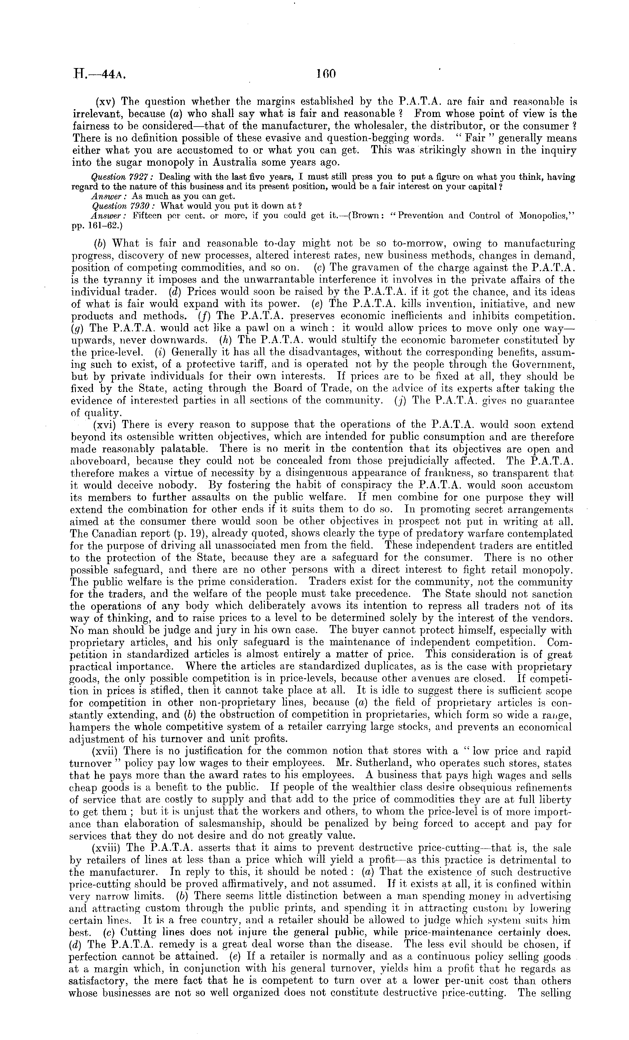 (xv) The question whether the margins established by the P.A.T.A. are fair and reasonable is irrelevant, because (a) who shall say what is fair and reasonable ? From whose point of view is the fairness to be considered —that of the manufacturer, the wholesaler, the distributor, or the consumer ? There is no definition possible of these evasive and question-begging words. " Fair " generally means either what you are accustomed to or what you can get. This was strikingly shown in the inquiry into the sugar monopoly in Australia some years ago. Question 7927: Dealing with the last five years, I must still press you to put a figure on what you think, having regard to the nature of this business and its present position, would be a fair interest on your capital 1 Answer : As much as you can get. Question 7930 : What would you put it down at ? Answer: Fifteen per cent, or more, if you could get it.—(Brown: "Prevention and Control of Monopolies," pp. 161-62.) (b) What is fair and reasonable to-day might not be so to-morrow, owing to manufacturing progress, discovery of new processes, altered interest rates, new business methods, changes in demand, position of competing commodities, and so on. (c) The gravamen of the charge against the P.A.T.A. is the tyranny it imposes and the unwarrantable interference it involves in the private affairs of the individual trader. (d) Prices would soon be raised by the P.A.T.A. if it got the chance, and its ideas of what is fair would expand with its power, (e) The P.A.T.A. kills invention, initiative, and new products and methods. (/) The P.A.T.A. preserves economic inefficients and inhibits competition. (g) The P.A.T.A. would act like a pawl on a winch : it would allow prices to move only one way — upwards, never downwards. (h) The P.A.T.A. would stultify the economic barometer constituted by the price-level. (i) Generally it has all the disadvantages, without the corresponding benefits, assuming such to exist, of a protective tariff, and is operated not by the people through the Government, but by private individuals for their own interests. If prices are to be fixed at all, they should be fixed by the State, acting through the Board of Trade, on the advice of its experts after taking the evidence of interested parties in all sections of the community, (j) The P.A.T.A. gives no guarantee of quality. (xvi) There is every reason to suppose that the operations of the P.A.T.A. would soon extend beyond its ostensible written objectives, which are intended for public consumption and are therefore made reasonably palatable. There is no merit in the contention that its objectives are open and aboveboard, because they could not be concealed from those prejudicially affected. The P.A.T.A. therefore makes a virtue of necessity by a disingenuous appearance of frankness, so transparent that it would deceive nobody. By fostering the habit of conspiracy the P.A.T.A. would soon accustom its members to further assaults on the public welfare. If men combine for one purpose they will extend the combination for other ends if it suits them to do so. In promoting secret arrangements aimed at the consumer there would soon be other objectives in prospect not put in writing at all. The Canadian report (p. 19), already quoted, shows clearly the type of predatory warfare contemplated for the purpose of driving all unassociated men from the field. These independent traders are entitled to the protection of the State, because they are a safeguard for the consumer. There is no other possible safeguard, and there are no other persons with a direct interest to fight retail monopoly. The public welfare is the prime consideration. Traders exist for the community, not the community for the traders, and the welfare of the people must take precedence. The State should not sanction the operations of any body which deliberately avows its intention to repress all traders not of its way of thinking, and to raise prices to a level to be determined solely by the interest of the vendors. No man should be judge and jury in his own case. The buyer cannot protect himself, especially with proprietary articles, and his only safeguard is the maintenance of independent competition. Competition in standardized articles is almost entirely a matter of price. This consideration is of great practical importance. Where the articles are standardized duplicates, as is the case with proprietary goods, the only possible competition is in price-levels, because other avenues are closed. If competition in prices is stifled, then it cannot take place at all. It is idle to suggest there is sufficient scope for competition in other non-proprietary lines, because (a) the field of proprietary articles is constantly extending, and (b) the obstruction of competition in proprietaries, which form so wide a range, hampers the whole competitive system of a retailer carrying large stocks, and prevents an economical adjustment of his turnover and unit profits. (xvii) There is no justification for the common notion that stores with a " low price and rapid turnover " policy pay low wages to their employees. Mr. Sutherland, who operates such stores, states that he pays more than the award rates to his employees. A business that pays high wages and sells cheap goods is a benefit to the public. If people of the wealthier class desire obsequious refinements of service that are costly to supply and that add to the price of commodities they are at full liberty to get them ; but it is unjust that the workers and others, to whom the price-level is of more importance than elaboration of salesmanship, should be penalized by being forced to accept and pay for services that they do not desire and do not greatly value. (xviii) The P.A.T.A. asserts that it aims to prevent destructive price-cutting—that is, the sale by retailers of lines at less than a price which will yield a profit—as this practice is detrimental to the manufacturer. In re