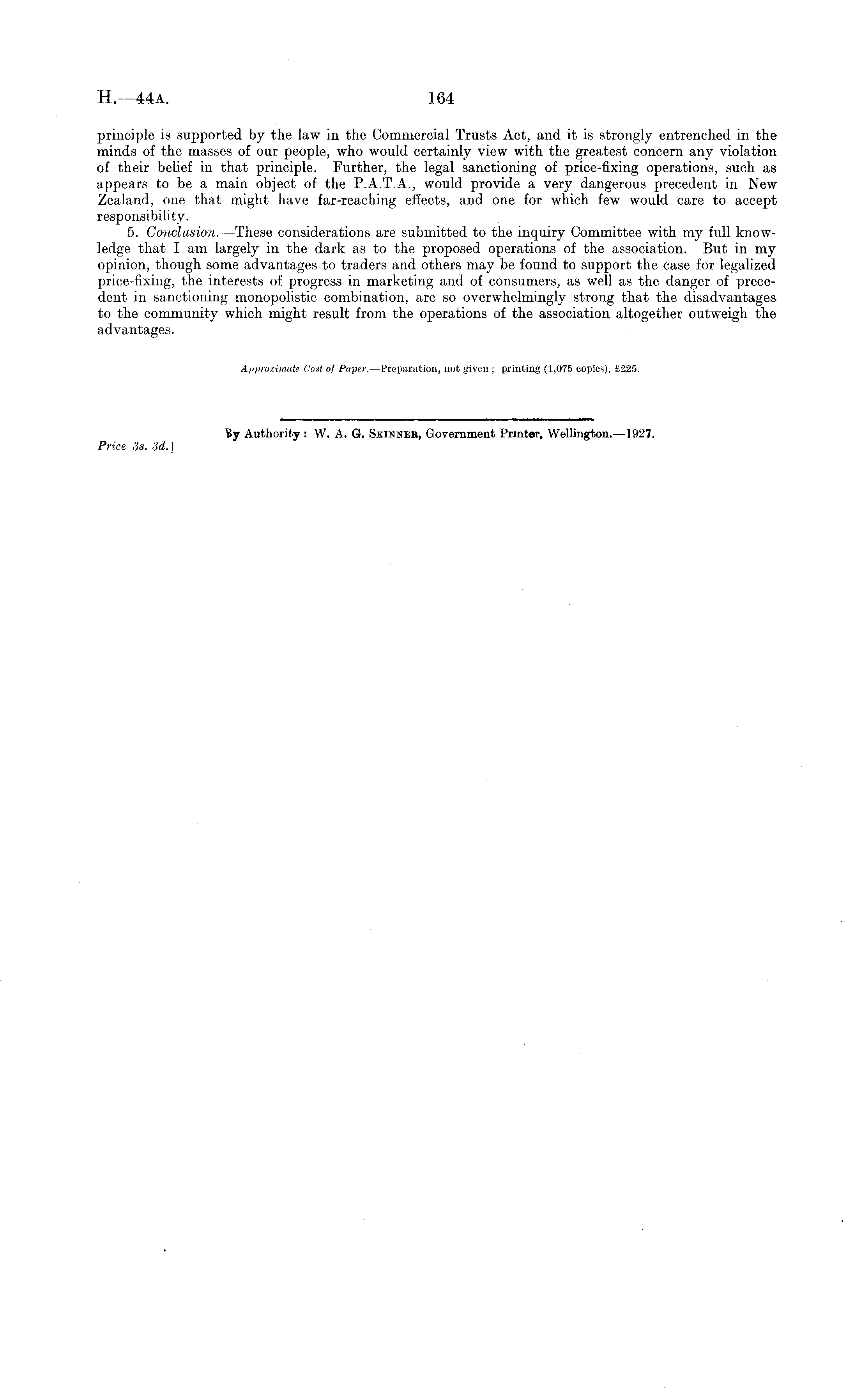 principle is supported by the law in the Commercial Trusts Act, and it is strongly entrenched in the minds of the masses of our people, who would certainly view with the greatest concern any violation of their belief in that principle. Further, the legal sanctioning of price-fixing operations, such as appears to be a main object of the P.A.T.A., would provide a very dangerous precedent in New Zealand, one that might have far-reaching effects, and one for which few would care to accept responsibility. 5. Conclusion. —These considerations are submitted to the inquiry Committee with my full knowledge that I am largely in the dark as to the proposed operations of the association. But in my opinion, though some advantages to traders and others may be found to support the case for legalized price-fixing, the interests of progress in marketing and of consumers, as well as the danger of precedent in sanctioning monopolistic combination, are so overwhelmingly strong that the disadvantages to the community which might result from the operations of the association altogether outweigh the advantages.