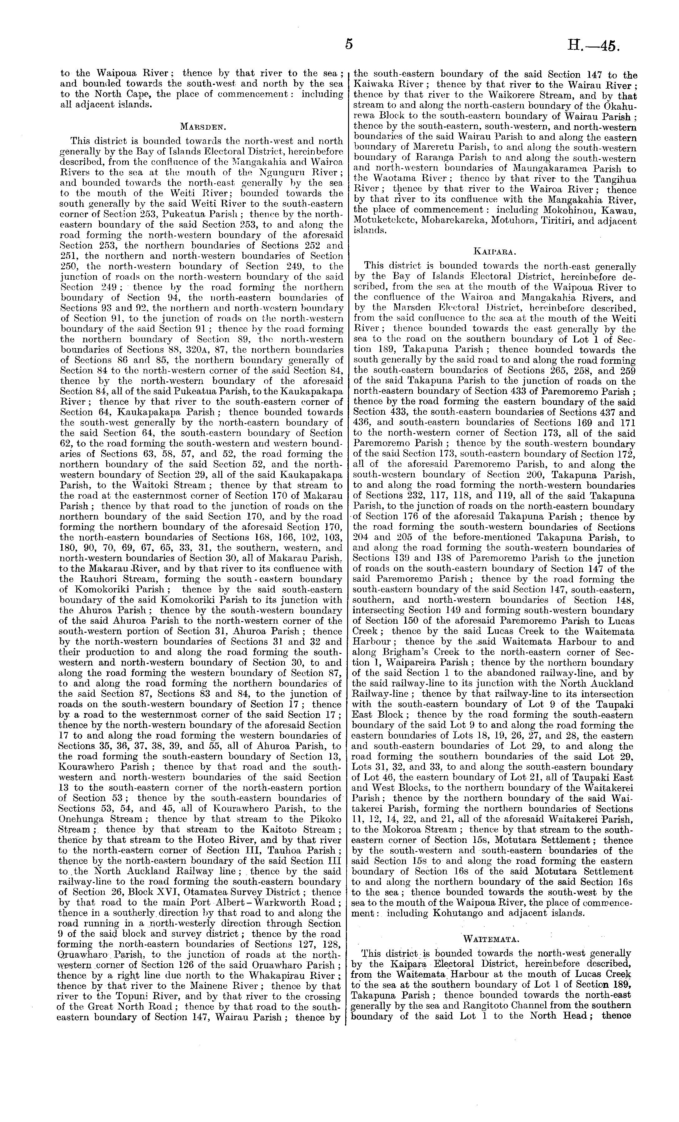 to the Waipoua River; thence by that river to the sea ; and bounded towards the south-west, and north by the sea to the North Cape, the place of commencement: including all adjacent islands. Marsden. This district is bounded towards the north-west and north generally by the Bay of Islands Electoral District, hereinbefore described, from the confluence of the Mangakahia and Wairoa Rivers to the sea at the mouth of the Ngunguru River; and bounded towards the north-east generally by the sea to the mouth of the Weiti River; bounded towards the south generally by the said Weiti River to the south-eastern corner of Section 253, Pukeatua Parish ; thence by the northeastern boundary of the said Section 253, to and along the road forming the north-western boundary of the aforesaid Section 253, the northern boundaries of Sections 252 and 251, the northern and north-western boundaries of Section 250, the north-western boundary of Section 249, to the junction of roads on the north-western boundary of the said Section 249; thence by the road forming the northern boundary of Section 94, the north-eastern boundaries of Sections 93 and 92, the northern and north-western boundary of Section 91, to the junction of roads on the north-western boundary of the said Section 91 ; thence by the road forming the northern boundary of Section 89, the north-western boundaries of Sections 88, 320 a, 87, the northern boundaries of Sections 86 and 85, the northern boundary generally of Section 84 to the north-western corner of the said Section 84, thence by the north-western boundary of the aforesaid Section 84, all of the said Pukeatua Parish, to the Kaukapakapa River ; thence by that river to the south-eastern corner of Section 64, Kaukapakapa Parish ; thence bounded towards the south-west generally by the north-eastern boundary of the said Section 64, the south-eastern boundary of Section 62, to the road forming the south-western and western boundaries of Sections 63, 58, 57, and 52, the road forming the northern boundary of the said Section 52, and the northwestern boundary of Section 29, all of the said Kaukapakapa Parish, to the Waitoki Stream ; thence by that stream to the road at the easternmost corner of Section 170 of Makarau Parish ; thence by that road to the junction of roads on the northern boundary of the said Section 170, and by the road forming the northern boundary of the aforesaid Section 170, the north-eastern boundaries of Sections 168, 166, 102, 103, 180, 90, 70, 69, 67, 65, 33, 31, the southern, western, and north-western boundaries of Section 30, all of Makarau Parish, to the Makarau -River, and by that river to its confluence with the Rauhori Stream, forming the south - eastern boundary of Komokoriki Parish ; thence by the said south-eastern boundary of the said Komokoriki Parish to its junction with the Ahuroa Parish ; thence by the south-western boundary of the said Ahuroa Parish to the north-western corner of the south-western portion of Section 31, Ahuroa Parish ; thence by the north-western boundaries of Sections 31 and 32 and their production to and along the road forming the southwestern and north-western boundary of Section 30, to and along the road forming the western boundary of Section 87, to and along the road forming the northern boundaries of the said Section 87, Sections 83 and 84, to the junction of roads on the south-western boundary of Section 17 ; thence by a road to the westernmost corner of the said Section 17 ; thence by the north-western boundary of the aforesaid Section 17 to and along the road forming the western boundaries of Sections 35, 36, 37, 38, 39, and 55, all of Ahuroa Parish, to the road forming the south-eastern boundary of Section 13, Kourawhero Parish ; thence by that road and the southwestern and north-western boundaries of the said Section 13 to the south-eastern corner of the north-eastern portion of Section 53 ; thence by the south-eastern boundaries of Sections 53, 54, and 45, all of Kourawhero Parish, to the Onehunga Stream ; thence by that stream to the Pikoko Stream ; thenpe by that stream to the Kaitoto Stream ; thence by that stream to the Hoteo River, and by that river to the north-eastern corner of Section 111, Tauhoa Parish ; thence by the north-eastern boundary of the said Section 111 to.the North Auckland Railway line; thence by the said railway-line to the road forming the south-eastern boundary of Section 26, Block XVI, Otamatea Survey District; thence by that road to the main Port Albert-Warkworth Road; thence in a southerly, direction by that road to and along the road running in a north-westerly direction through Section 9of the said block and survey district; thence by the road forming the north-eastern boundaries of Sections 127, 128, Qruawharo . Parish, to the junction of roads at the northwestern corner of Section 126 of the said Oruawharo Parish ; thence by a right line due north to the Whakapirau River; thence by that river to the Mainene River ; thence by that river to the Topuni River, and by that river to the crossing of the Great North Road; thence by that road to the southeastern boundary of Section 147, Wairau Parish ; thence by