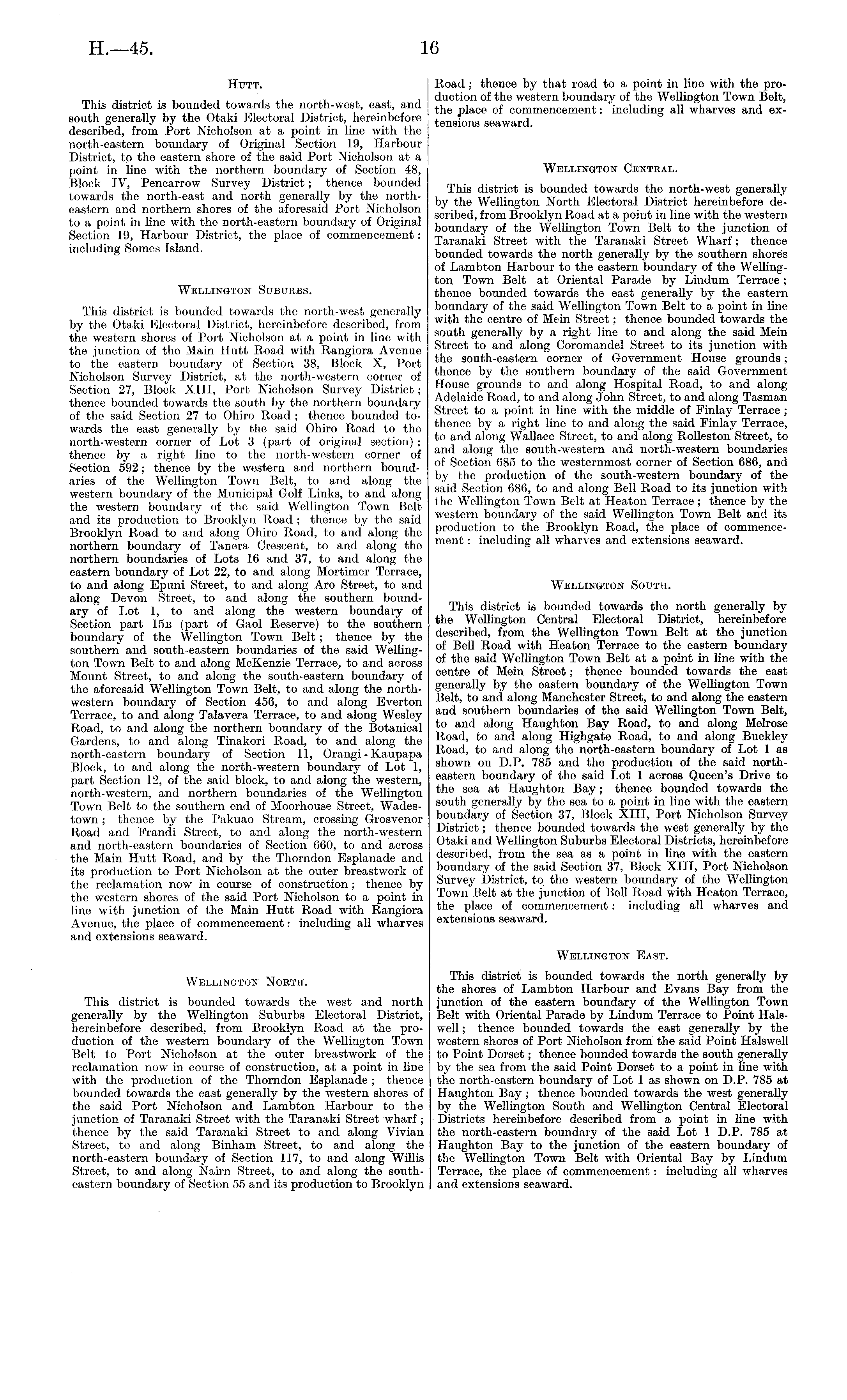 Road; thence by that road to a point in line with the production of the western boundary of the Wellington Town Belt, the place of commencement: including all wharves and extensions seaward. Wellington Central. This district is bounded towards the north-west generally by the Wellington North Electoral District hereinbefore described, from Brooklyn Road at a point in line with the western boundary of the Wellington Town Belt to the junction of Taranaki Street with the Taranaki Street Wharf; thence bounded towards the north generally by the southern shores of Lambton Harbour to the eastern boundary of the Wellington Town Belt at Oriental Parade by Lindum Terrace; thence bounded towards the east generally by the eastern boundary of the said Wellington Town Belt to a point in line with the centre of Mein Street; thence bounded towards the south generally by a right line to and along the said Mein Street to and along Coromandel Street to its junction with the south-eastern corner of Government House grounds; thence by the southern boundary of the said Government House grounds to and along Hospital Road, to and along Adelaide Road, to and along John Street, to and along Tasman Street to a point in line with the middle of Finlay Terrace ; thence by a right line to and along the said Finlay Terrace, to and along Wallace Street, to and along Rolleston Street, to and along the south-western and north-western boundaries of Section 685 to the westernmost corner of Section 686, and by the production of the south-western boundary of the said Section 686, to and along Bell Road to its junction with the Wellington Town Belt at Heaton Terrace; thence by the western boundary of the said Wellington Town Belt and its production to the Brooklyn Road, the place of commencement : including all wharves and extensions seaward. Wellington South. This district is bounded towards the north generally by the Wellington Central Electoral District, hereinbefore described, from the Wellington Town Belt at the junction of Bell Road with Heaton Terrace to the eastern boundary of the said Wellington Town Belt at a point in line with the centre of Mein Street; thence bounded towards the east generally by the eastern boundary of the Wellington Town Belt, to and along Manchester Street, to and along the eastern and southern boundaries of the said Wellington Town Belt, to and along Haughton Bay Road, to and along Melrose Road, to and along Highgate Road, to and along Buckley Road, to and along the north-eastern boundary of Lot 1 as shown on D.P. 785 and the production of the said northeastern boundary of the said Lot 1 across Queen's Drive to the sea at Haughton Bay; thence bounded towards the south generally by the sea to a point in line with the eastern boundary of Section 37, Block XIII, Port Nicholson Survey District; thence bounded towards the west generally by the Otaki and Wellington Suburbs Electoral Districts, hereinbefore described, from the sea as a point in line with the eastern boundary of the said Section 37, Block XIII, Port Nicholson Survey District, to the western boundary of the Wellington Town Belt at the junction of Bell Road with Heaton Terrace, the place of commencement: including all wharves and extensions seaward. Wellington East. This district is bounded towards the north generally by the shores of Lambton Harbour and Evans Bay from the junction of the eastern boundary of the Wellington Town Belt with Oriental Parade by Lindum Terrace to Point Halswell ; thence bounded towards the east generally by the western shores of Port Nicholson from the said Point Halswell to Point Dorset; thence bounded towards the south generally by the sea from the said Point Dorset to a point in line with the north-eastern boundary of Lot 1 as shown on D.P. 785 at Haughton Bay ; thence bounded towards the west generally by the Wellington South and Wellington Central Electoral Districts hereinbefore described from a point in line with the north-eastern boundary of the said Lot 1 D.P. 785 at Haughton Bay to the junction of the eastern boundary of the Wellington Town Belt with Oriental Bay by Lindum Terrace, the place of commencement: including all wharves and extensions seaward.