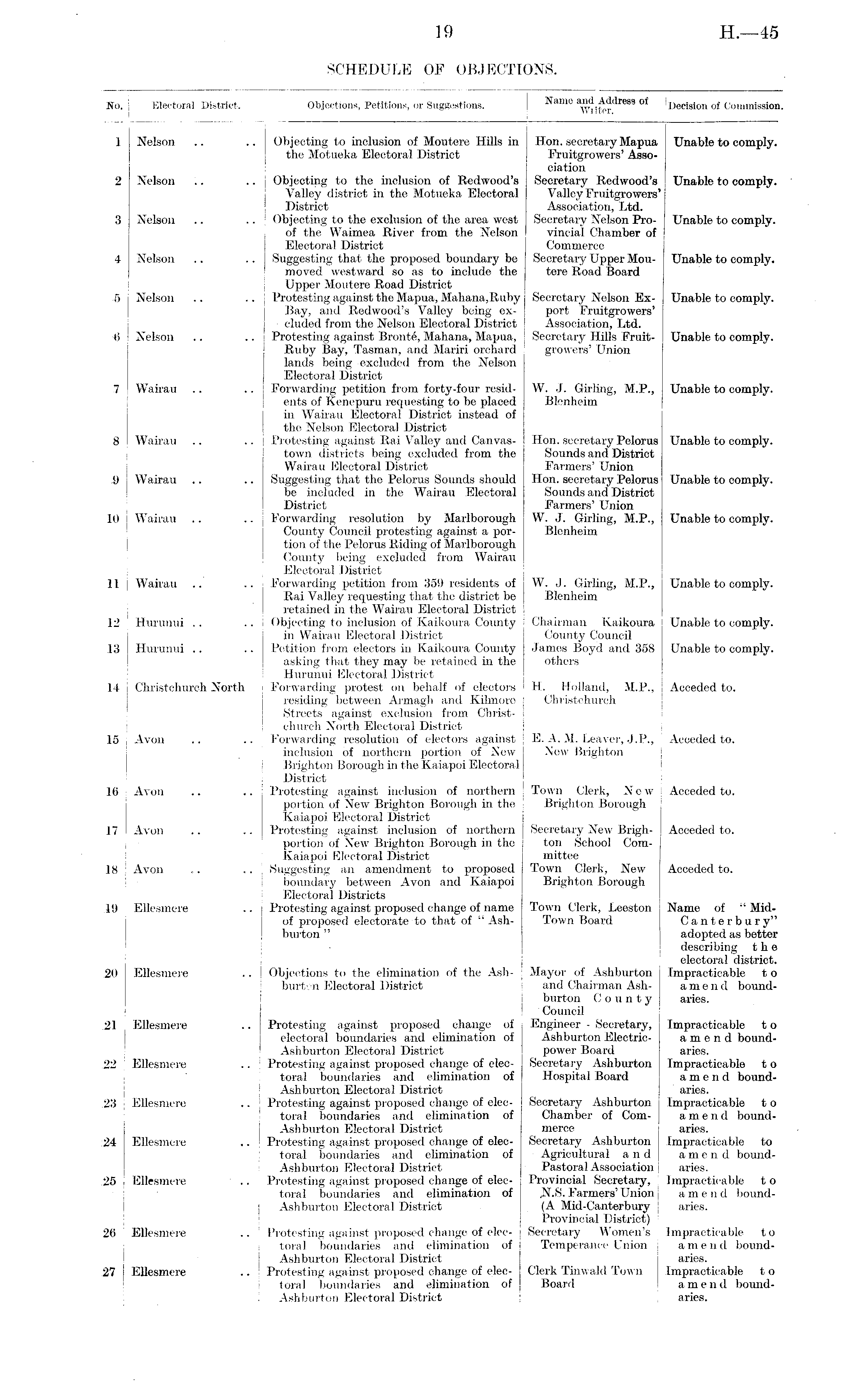 No. | Electoral District. Objections, Petitions, or Suggestions. ! Name Address of Decision of Commission. 1 Nelson .. .. | Objecting to inclusion of Moutere Hills in Hon. secretary Mapua Unable to comply. the Motueka Electoral District Fruitgrowers' Association 2 Nelson .. .. j Objecting to the inclusion of Redwood's Secretary Redwood's Unable to comply. Valley district in the Motueka Electoral Valley Fruitgrowers' District Association, Ltd. 3 Nelson .. .. 1 Objecting to the exclusion of the area west Secretary Nelson Pro- Unable to comply. of the Waimea River from the Nelson vincial Chamber of Electoral District Commerce 4 Nelson .. .. Suggesting that the proposed boundary be Secretary Upper Mou- Unable to comply. moved westward so as to include the tere Road Board Upper Moutere Road District 5 j Nelson .. .. Protesting against the Mapua, Mahana,Ruby Secretary Nelson Ex- Unable to comply. | Bay, and Redwood's Valley being ex- port Fruitgrowers' eluded from the Nelson Electoral District Association, Ltd. -6 Nelson .. .. Protesting against Bronte, Mahana, Mapua, Secretary Hills Fruit- Unable to comply. Ruby Bay, Tasman, and Mariri orchard growers' Union lands being excluded from the Nelson Electoral District 7 Wairau .. .. Forwarding petition from forty-four resid- W. J. Girling, M.P., Unable to comply. ents of Kenepuru requesting to be placed Blenheim in Wairau Electoral District instead of the Nelson Electoral District 8 Wairau .. .. Protesting against Rai Valley and Canvas- Hon. secretary Pelorus Unable to comply. town districts being excluded from the Sounds and District Wairau Electoral District Farmers' Union 9 Wairau .. .. Suggesting that the Pelorus Sounds should Hon. secretary Pelorus Unable to comply. be included in the Wairau Electoral Sounds and District District Farmers' Union 10 i Wairau .. .. Forwarding resolution by Marlborough W. .J. Girling, M.P., Unable to comply. County Council protesting against a por- Blenheim tion of the Pelorus Riding of Marlborough County being excluded from Wairau Electoral District 11 i Wairau .. .. Forwarding petition from 359 residents of W. J. Girling, M.P., Unable to comply. Rai Valley requesting that the district be Blenheim retained in the Wairau Electoral District 12 Hurunui .. .. Objecting to inclusion of Kaikoura County Chairman Kaikoura Unable to comply. in Wairau Electoral District County Council 13 Hurunui .. .. Petition from electors in Kaikoura County James Boyd and 358 Unable to comply. asking that they may be retained in the others Hurunui Electoral District 14 j Christchurch North Forwarding protest on behalf of electors H. Holland, M.P., Acceded to. residing between Armagh and Kilmore Christchurch Streets against exclusion from Christchurch North Electoral District 15 ; Avon .. .. j Forwarding resolution of electors against E. A. M. Leaver, J.P., Acceded to. j inclusion of northern portion of New New Brighton ! Brighton Borough in the Kaiapoi Electoral I District 16 Avon .. .. Protesting against inclusion of northern ! Town Clerk, New Acceded to. portion of New Brighton Borough in the I Brighton Borough Kaiapoi Electoral District 17 Avon .. .. Protesting against inclusion of northern Secretary New Brigh- Acceded to. portion of New Brighton Borough in the ton School ComKaiapoi Electoral District mittee 18 ; Avon .. .. j Suggesting an amendment to proposed Town Clerk, New Acceded to. boundary between Avon and Kaiapoi Brighton Borough Electoral Districts 19 Ellesmere .. Protesting against proposed change of name Town Clerk, Leeston Name of " Mid- | of proposed electorate to that of "Ash- Town Board Canterbury" | burton " adopted as better describing the electoral district. 20 Ellesmere .. i Objections to the elimination of the Ash- Mayor of Ashburton Impracticable t o burt- n Electoral District and Chairman Ash- amend boundi burton County aries. Council 21 Ellesmere .. Protesting against proposed change of Engineer - Secretary, Impracticable t o electoral boundaries and elimination of Ashburton Electric- amend boundAshburton Electoral District power Board aries. 22 Ellesmere .. Protesting against proposed change of elec- Secretary Ashburton Impracticable t o toral boundaries and elimination of Hospital Board amend boundAshburton Electoral District I aries. .23 Ellesmere .. Protesting against proposed change of elec- Secretary Ashburton j Impracticable t o toral boundaries and elimination of Chamber of Com- amend boundAshburton Electoral District merce aries. 24 Ellesmere .. Protesting against proposed change of elec- Secretary Ashburton Impracticable to toral boundaries and elimination of Agricultural and) amend boundAsh burton Electoral District Pastoral Association aries. 25 Ellesmere .. Protesting against proposed change of elec- Provincial Secretary, Impracticable to toral boundaries and elimination of .N.S. Farmers' Union amend boundj Ashburton Electoral District (A Mid-Canterbury aries. Provincial District) 26 Ellesmere .. Protesting against proposed change of elec- j Secretary Women's impracticable to toral boundaries and elimination of ! Temperance Union amend bound- | Ashburton Electoral District j aries. 27 Ellesmere .. Protesting against proposed change of elec- Clerk Tinwald Town I Impracticable t o toral boundaries and elimination of Board amend boundAshburton Electoral District i aries.