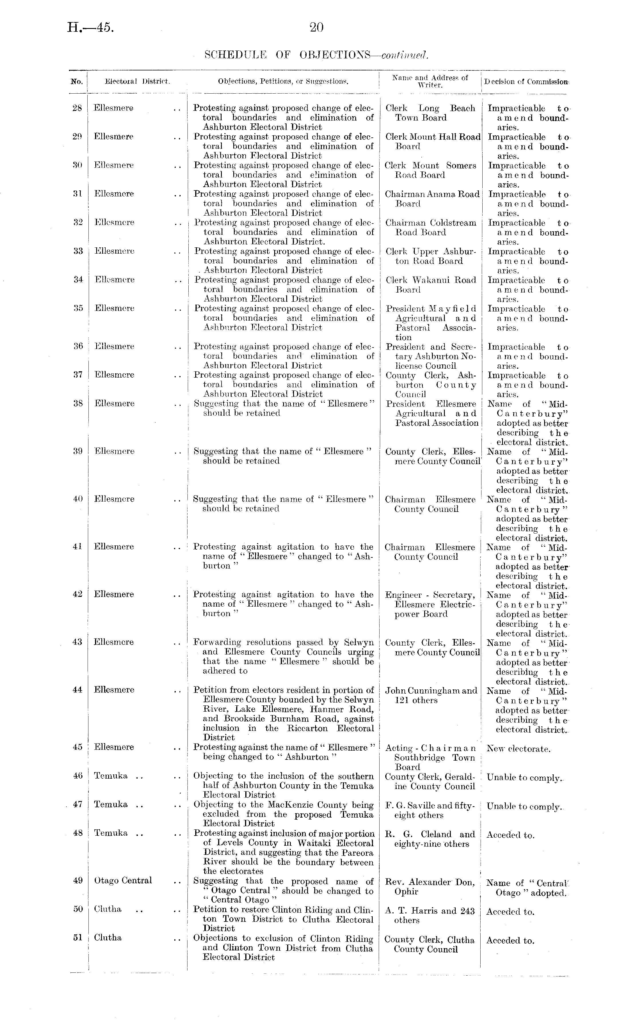 No. Electoral District. Objections, Petitions, or | N an if of i D ecision of Commissions 28 Ellesmere . . Protesting against proposed change of elec- Clerk Long Beach Impracticable t o toral boundaries and elimination of Town Board amend boundAshburton Electoral District aries, 20 Ellesmere .. Protesting against proposed change of elec- Clerk Mount Hall Road Impracticable to toral boundaries and elimination of Board amend boundAshburton Electoral District aries. 30 Ellesmere .. Protesting against proposed change of elec- Clerk Mount Somers Impracticable t o toral boundaries and elimination of Road Board amend boimdAshburton Electoral District aries. 31 j Ellesmere .. Protesting against proposed change of elec- Chairman Anama Road Impracticable to toral boundaries and elimination of Board amen d boundAshburton Electoral District aries. 32 Ellesmere .. Protesting against proposed change of elec- Chairman Coldstream Impracticable t o toral boundaries and elimination of Road Board amend boundAsliburton Electoral District. aries. 33 Ellesmere .. Protesting against proposed change of elec- Clerk Upper Ashbur- Impracticable t o toral boundaries and elimination of ton Road Board amend bound- . Ashburton Electoral District aries. 34 Ellesmere .. Protesting against proposed change of elec- Clerk Wakanui Road Impracticable to toral boundaries and elimination of Board amend boundAshburton Electoral District aries. 35 Ellesmere .. Protesting against proposed change of elec- President Mayfield Impracticable to toral boundaries and elimination of Agricultural and amend boundAshburton Electoral District Pastoral Associa- aries. tion 36 Ellesmere .. Protesting against proposed, change of elec- President and Secre- Impracticable t o toral boundaries and elimination of tary Ashburton No- amend boundAshburton Electoral District license Council aries. 37 Ellesmere .. Protesting against proposed change of elec- County Clerk, Ash- Impracticable t o toral boundaries and elimination of burton County amend boundAshburton Electoral District Council aries. 38 Ellesmere .. Suggesting that the name of " Ellesmere" President Ellesmere Name of " Midshould be retained Agricultural and Canterbury" Pastoral Association adopted as better describing the electoral district. 39 Ellesmere .. Suggesting that the name of " Ellesmere " County Clerk, Elles- Name of " Midshould be retained mere County Council Canterbury" adopted as better describing the electoral district. 40 Ellesmere .. Suggesting that the name of " Ellesmere" Chairman Ellesmere Name of " Midshould be retained County Council Canterbury" adopted as better describing the electoral district. 41 Ellesmere .. Protesting against agitation to have the Chairman Ellesmere Name of " Midname of " Ellesmere" changed to " Ash- County Council Canterbury" burton " adopted as better 1 describing the electoral district. 42 Ellesmere .. Protesting against agitation to have the Engineer - Secretary, Name of " Midname of " Ellesmere" changed to " Ash- Ellesmere Electric- Canterbury" burton" power Board adopted as better describing the electoral district. 43 Ellesmere .. Forwarding resolutions passed by Selwyn County Clerk, Elles- Name of " Midand Ellesmere County Councils urging mere County Council Canterbury" that the name "Ellesmere" should be adopted as better adhered to describing the electoral district. 44 Ellesmere .. Petition from electors resident in portion of John Cunningham and Name of " MidEllesmere County bounded by the Selwyn 121 others Canterbury" River, Lake Ellesmere, Hanmer Road, adopted as better and Brookside Burnham Road, against describing the inclusion in the Riccarton Electoral electoral district. District 45 Ellesmere .. Protesting against the name of " Ellesmere " Acting - Chairman New electorate, being changed to " Ashburton " Soutlibridge Town Board 46 Temuka .. .. Objecting to the inclusion of the southern County Clerk, Gerald- ! Unable to comply. half of Ashburton County in the Temuka ine County Council Electoral District 47 Temuka .. .. Objecting to the Mac-Kenzie County being F. G. Saville and fifty- Unable to comply.. excluded from the proposed Temuka eight others Electoral District 48 Temuka .. .. Protesting against inclusion of major portion R. G. Cleland and Acceded to. of Levels County in Waitaki Electoral eighty-nine others District, and suggesting that the Pareora River should be the boundary between the electorates 49 Otago Central .. Suggesting that the proposed name of Rev. Alexander Don, Name of " Central' " Otago Central " should be changed to Ophir Otago " adopted. " Central Otago " 50 Clutha .. .. Petition to restore Clinton Riding and Clin- A. T. Harris and 243 Acceded to. ton Town District to Clutha Electoral others District 51 Clutha .. Objections to exclusion of Clinton Riding County Clerk, Clutha Acceded to. and Clinton Town District from Clutha County Council Electoral District