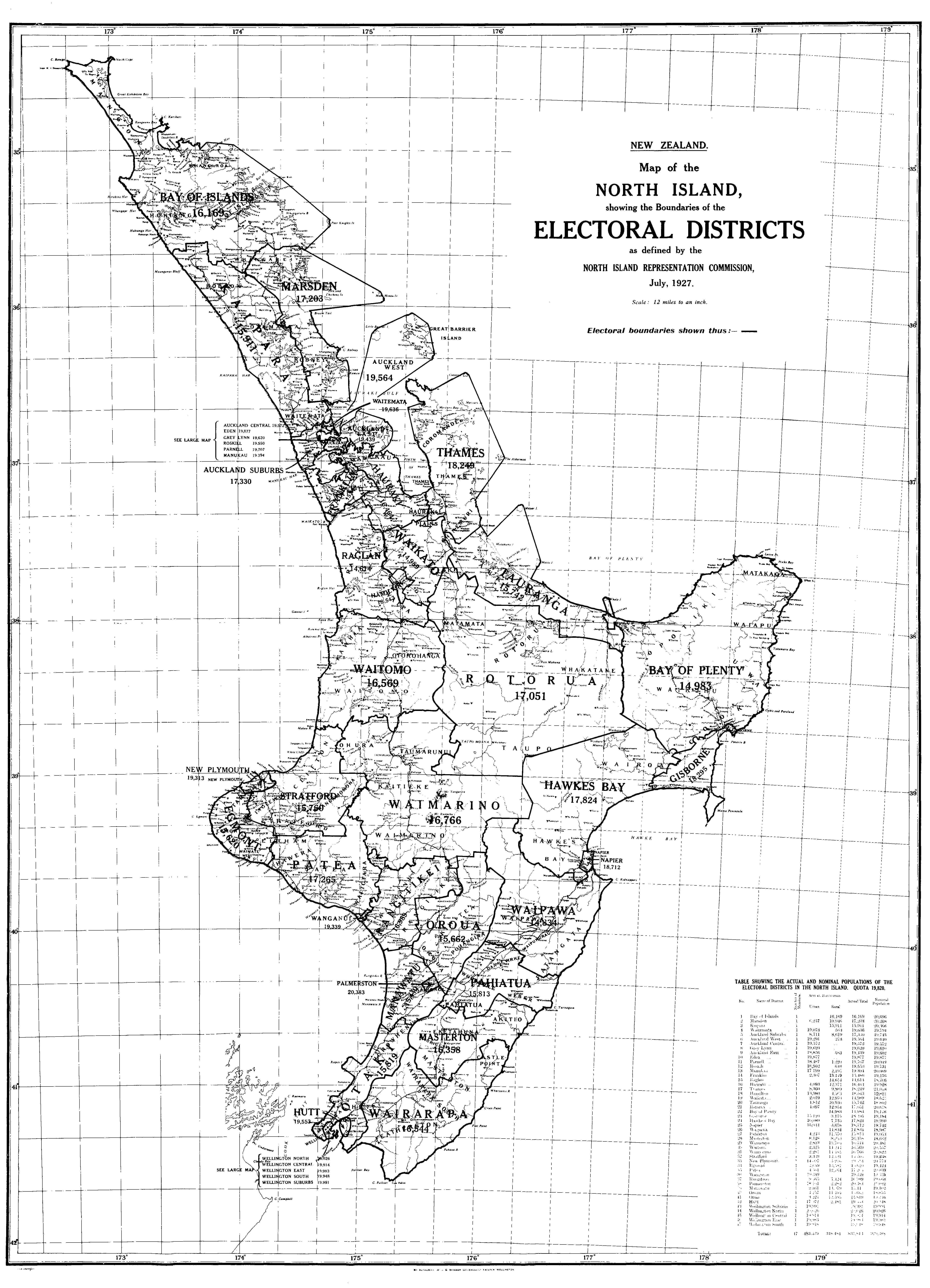 NEW ZEALAND. Map of the NORTH ISLAND, showing the Boundaries of the ELECTORAL DISTRICTS as defined by the NORTH ISLAND REPRESENTATION COMMISSION, July, 1927.