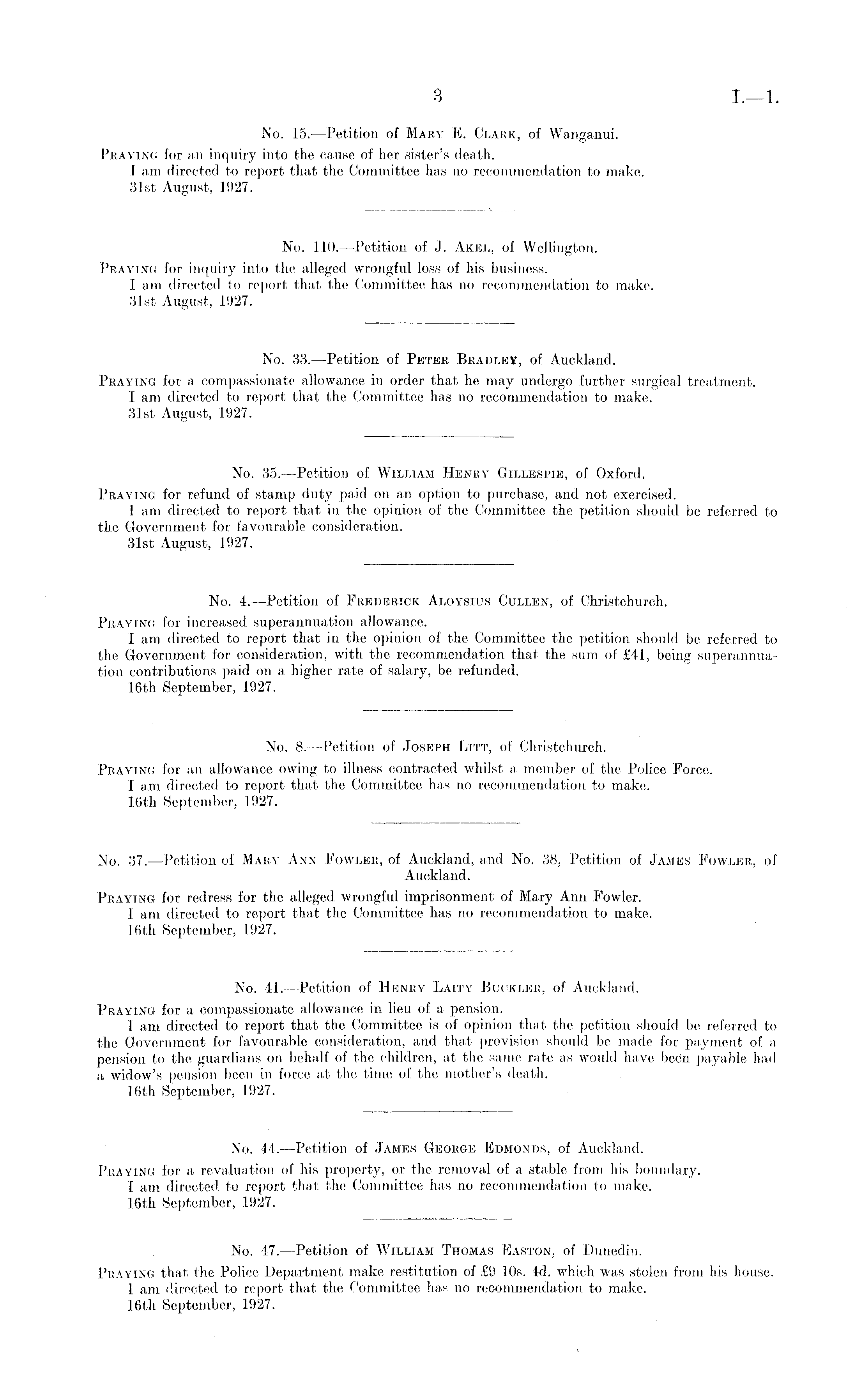 No. B.—Petition of Joseph Litt, of Christchurch. Praying for an allowance owing to illness contracted whilst a member of the Police Force. I am directed to report that the Committee has no recommendation to make. 16th September, 1927.