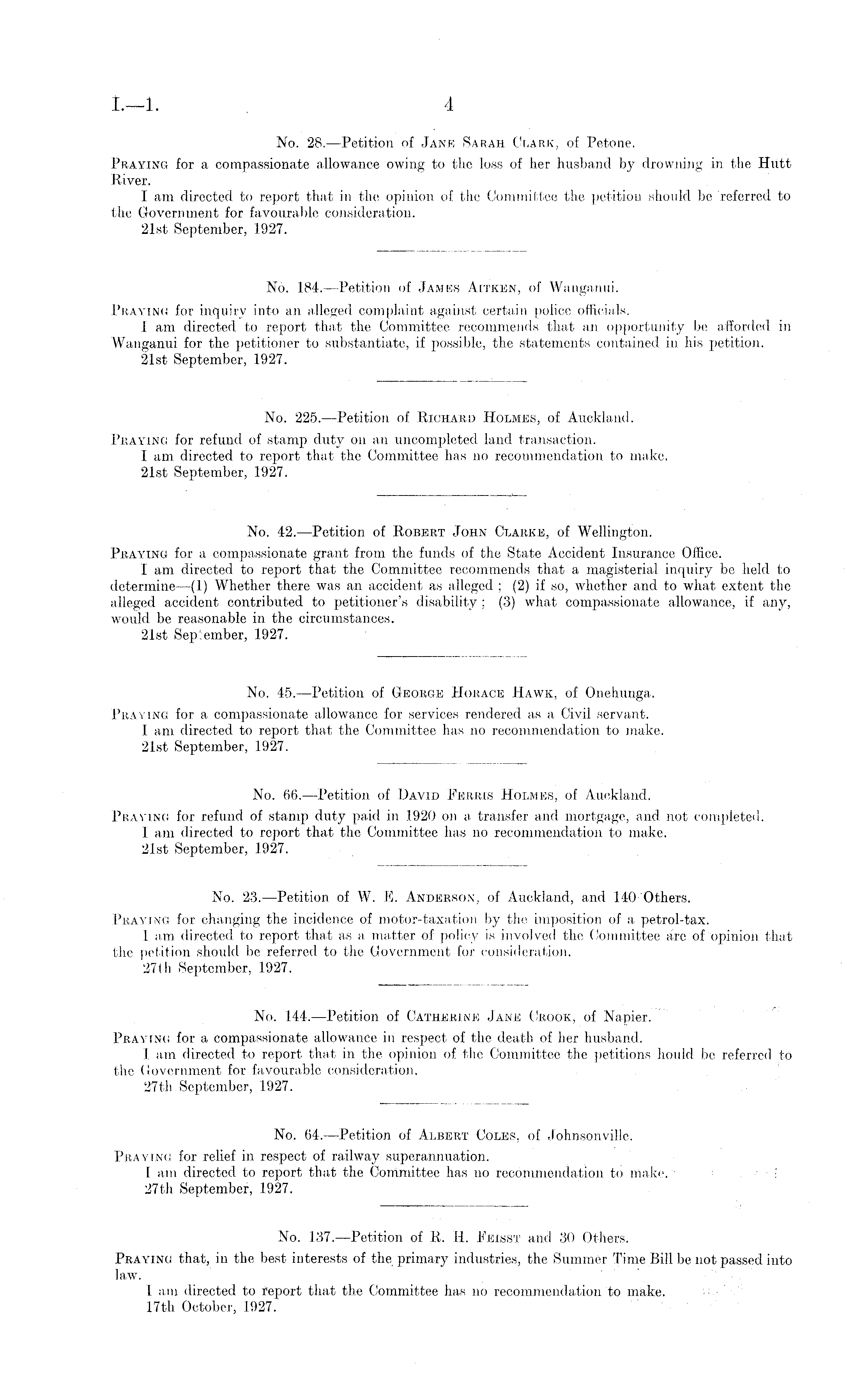 No. 42. —Petition of Robert John Clarke, of Wellington. Praying for a compassionate grant from the funds of the State Accident Insurance Office. I am. directed to report that the Committee recommends that a magisterial inquiry be held to determine —(1) Whether there was an accident as alleged ; (2) if so, whether and to what extent the alleged accident contributed to petitioner's disability ; (3) what compassionate allowance, if any, would be reasonable in the circumstances. 21st September, 1927.