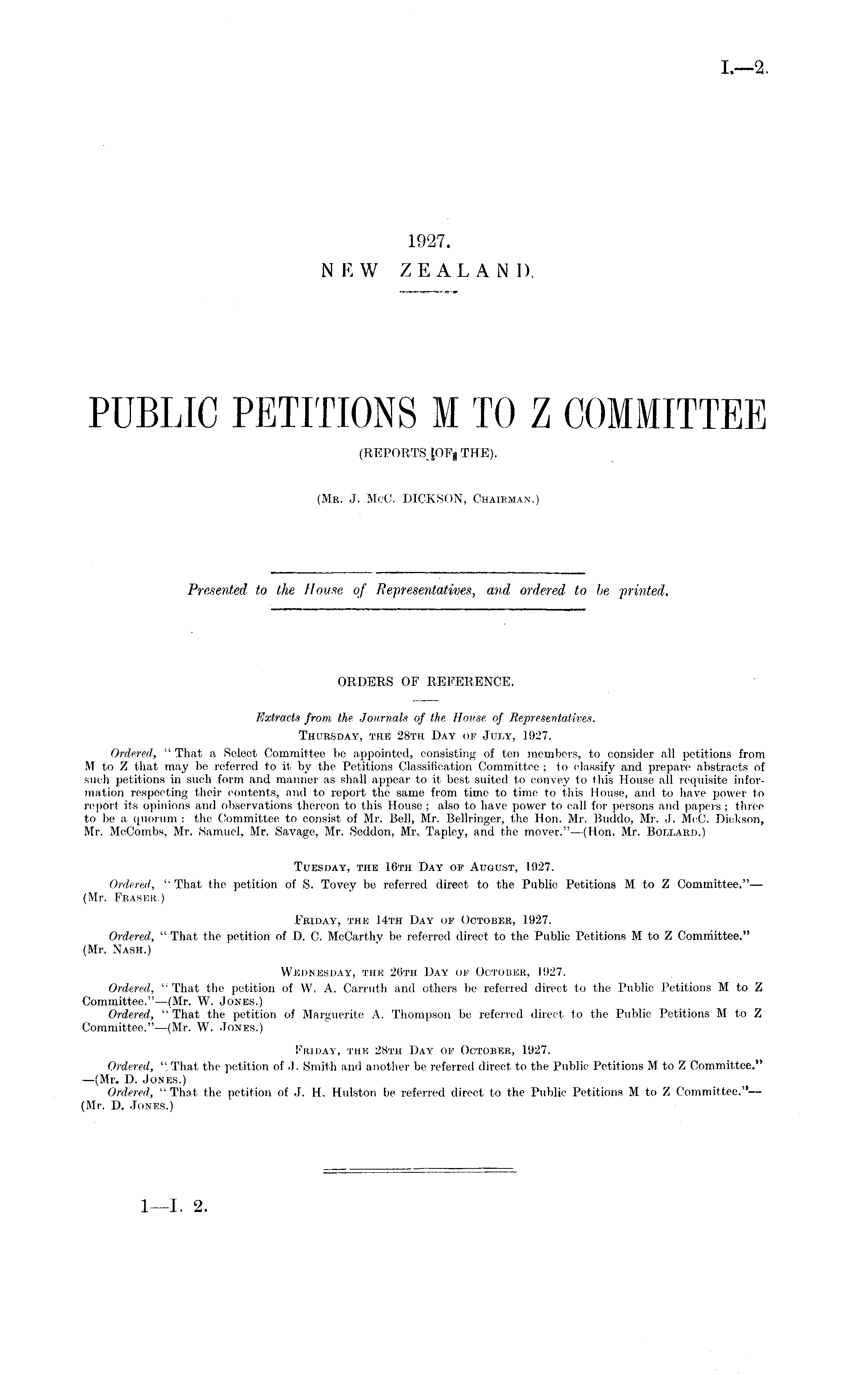 ORDERS OF REFERENCE. Extracts from the Journals of the House of Representatives. Thubsday, the 28th Day of July, 1927. Ordered, " That a Select Committee be appointed, consisting of ten members, to consider all petitions from Mto Z that may be referred to it by the Petitions Classification Committee; to classify and prepare abstracts of such petitions in such form and manner as shall appear to it best suited to convey to this House all requisite information respecting their contents, and to report the same from time to time to this House, and to have power to report its opinions and observations thereon to this House ; also to have power to call for persons and papers ; three to be a quorum : the Committee to consist of Mr. Bell, Mr. Bellringer, the Hon. Mr. Buddo, Mr. J. McC. Dickson, Mr. McCombs, Mr. Samuel, Mr. Savage, Mr. Seddon, Mr. Tapley, and the mover."—(Hon. Mr. Bollard.) Tuesday, the 16th Day or August, 1927. Ordered, " That the petition of S. Tovey be referred direct to the Public Petitions M to Z Committee." — (Mr. Fraser.) Friday, the 14th Day oe October, 1927. Ordered; " That the petition of D. C. McCarthy be referred direct to the Public Petitions M to Z Committee." (Mr. Nash.) Wednesday, the 26th Day oe October, 1927. Ordered, " That the petition of W. A. Carruth and others be referred direct to the Public Petitions M to Z Committee."—(Mr. W. Jones.) Ordered, " That the petition of Marguerite A. Thompson be referred direct to the Public Petitions M to Z Committee."—(Mr. W. Jones.) Friday, the 28th Day oe October, 1927. Ordered, " That the petition of J. Smith and another be referred direct to the Public Petitions M to Z Committee." —(Mr. D. Jones.) Ordered, " That the petition of J. H. Hulston be referred direct to the Public Petitions M to Z Committee."— (Mr. D. Jones.)