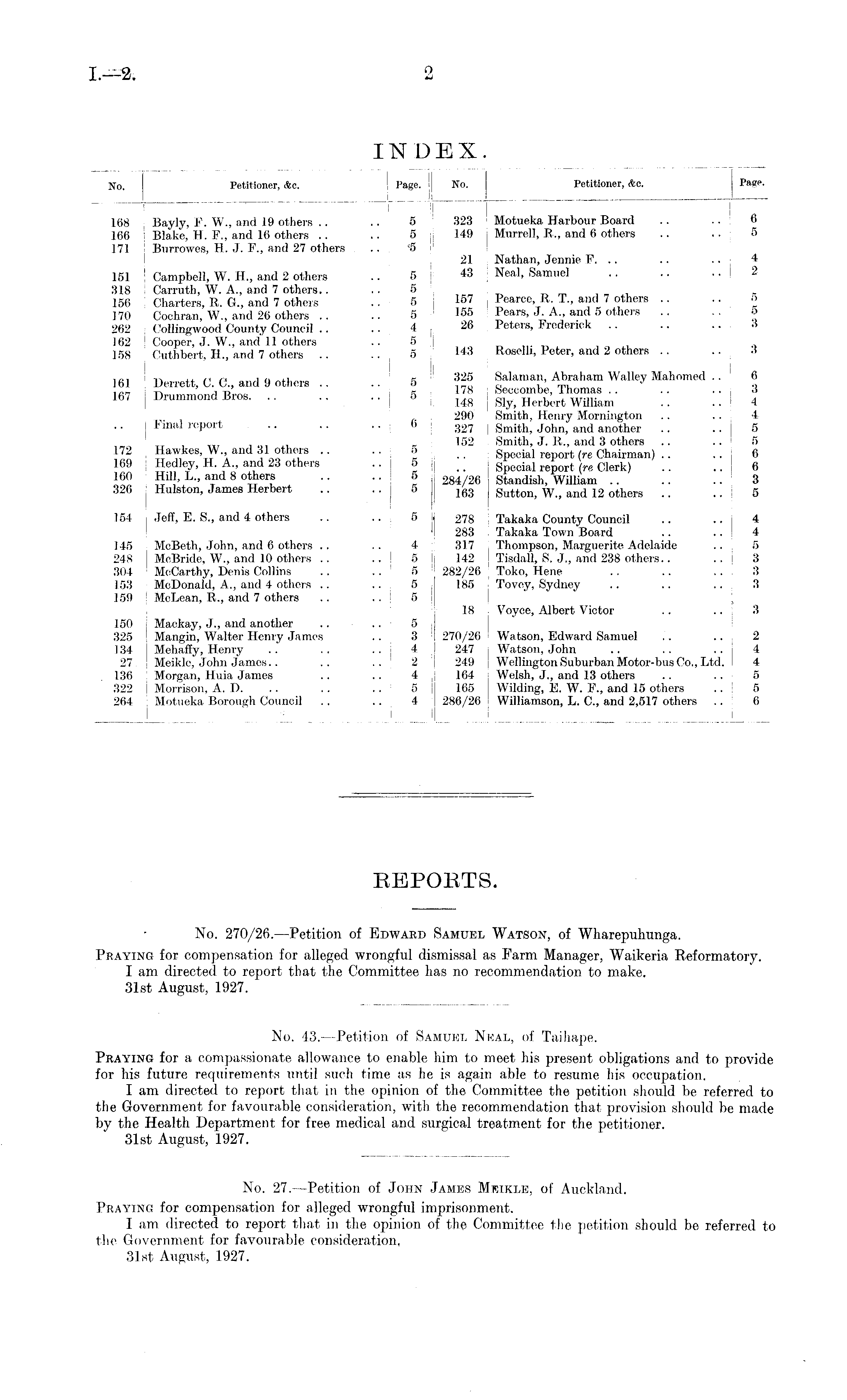 REPORTS. No. 270/26. —Petition of Edward Samuel Watson, of Wharepuhunga. Praying for compensation for alleged wrongful dismissal as Farm Manager, Waikeria Reformatory. I am directed to report that the Committee has no recommendation to make. 31st August, 1927.