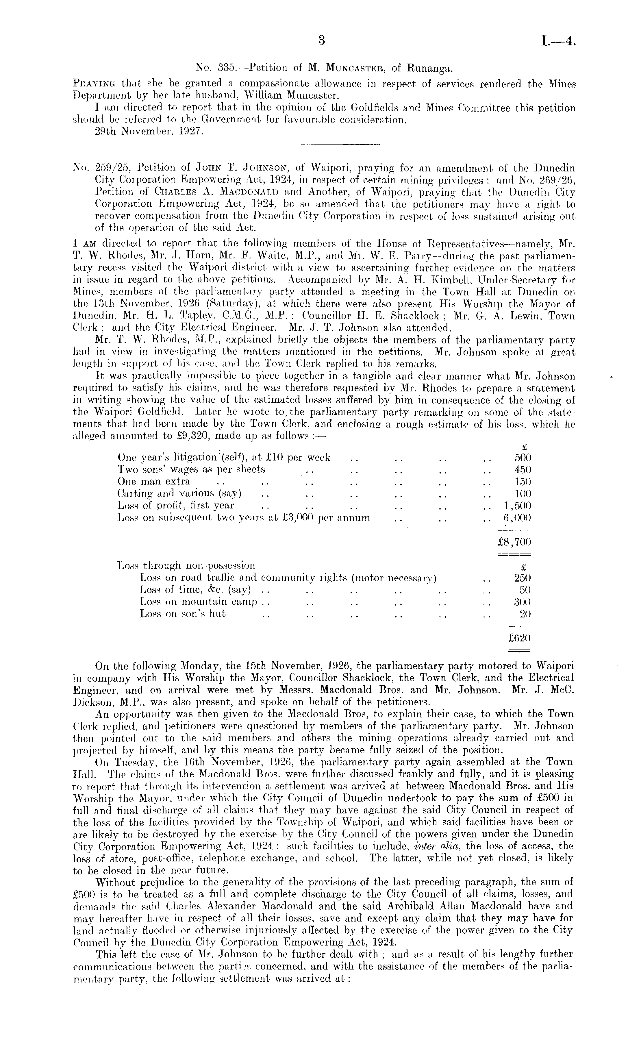 No. 259/25, Petition of John T. Johnson, of Waipori, praying for an amendment of the Punedin City Corporation Empowering Act, 1924, in respect of certain mining privileges ; and No. 269/26, Petition of Charles A. Macdonald and Another, of Waipori, praying that the Dunedin City Corporation Empowering Act, 1924, be so amended that the petitioners may have a right to recover compensation from the Dunedin City Corporation in respect of loss sustained arising out of the operation of the said Act. I am directed to report that the following members of the House of Representatives—namely, Mr. T. W. Rhodes, Mr. J. Horn, Mr. F. Waite, M.P., and Mr. W. E. Parry—during the past parliamentary recess visited the Waipori district with a view to ascertaining further evidence on the matters in issue in regard to the above petitions. Accompanied by Mr. A. H. Kimbell, Under-Secretary for Mines, members of the parliamentary party attended a meeting in the Town Hall at Dunedin on the 13th November, 1926 (Saturday), at which there were also present His Worship the Mayor of Dunedin, Mr. H. L. Tap lev, C.M.G., M.P. ; Councillor H. E. iShacklock : Mr. G. A. Lewin, Town Clerk ; and the City Electrical Engineer. Mr. J. T. Johnson also attended. Mr. T. W. Rhodes, M.P., explained briefly the objects the members of the parliamentary party had in view in investigating the matters mentioned in the petitions. Mr. Johnson spoke at great length in support of his case, and the Town Clerk replied to his remarks. It was practically impossible to piece together in a tangible and clear manner what Mr. Johnson required to satisfy his claims, and he was therefore requested by Mr. Rhodes to prepare a statement in writing showing the value of the estimated losses suffered by him in consequence of the closing of the Waipori Goldfield. Later he wrote to the parliamentary party remarking on some of the statements that had been made by the Town Clerk, and enclosing a rough estimate of his loss, which he alleged amounted to £9,320, made up as follows : — £ One year's litigation (self), at £10 per week . . .. .. .. 500 Two sons' wages as per sheets .. .. .. .. .. 450 One man extra . . .. .. .. .. ~ .. 150 Carting and various (say) .. .. .. .. .. . . 100 Loss of profit, first year .. .. .. . . . . 1,500 Loss on subsequent two years at £3,000 per annum .. . . .. 6,000 £8,700 Loss through non-possession— £ Loss on road traffic and community rights (motor necessary) .. 250 Loss of time, &c. (say) .. .. .. .. .. .. 50 Loss on mountain camp .. .. .. .. .. .. 300 Loss on son's hut .. .. .. .. ~ .. 20 £620 On the following Monday, the 15th November, 1926, the parliamentary party motored to Waipori in company with His Worship the Mayor, Councillor Shacklock, the Town Clerk, and the Electrical Engineer, and on arrival were met by Messrs. Macdonald Eros, and Mr. Johnson. Mr. J. McC. Dickson, M.P., was also present, and spoke on behalf of the petitioners. An opportunity was then given to the Macdonald Bros, to explain their case, to which the Town Clerk replied, and petitioners were questioned by members of the parliamentary party. Mr. Johnson then pointed out to the said members and others the mining operations already carried out and projected by himself, and by this means the party became fully seized of the position. On Tuesday, the 16th November, 1926, the parliamentary party again assembled at the Town Hall. The claims of the Macdonald Bros, were further discussed frankly and fully, and it is pleasing to report that through its intervention a settlement was arrived at between Macdonald Bros, and His Worship the Mayor, under which the City Council of Dunedin undertook to pay the sum of £500 in full and final discharge of all claims that they may have against the said City Council in respect of the loss of the facilities provided by the Township of Waipori, and which said facilities have been or are likely to be destroyed by the exercise by the City Council of the powers given under the Dunedin City Corporation Empowering Act, 1924 ; such facilities to include, inter alia, the loss of access, the loss of store, post-office, telephone exchange, and school. The latter, while not yet closed, is likely to be closed in the near future. Without prejudice to the generality of the provisions of the last preceding paragraph, the sum of £500 is to be treated as a full and complete discharge to the City Council of all claims, losses, and demands the said Charles Alexander Macdonald and the said Archibald Allan Macdonald have and may hereafter have in respect of all their losses, save and except any claim that they may have for land actually flooded or otherwise injuriously affected by the exercise of the power given to the City Council by the Dunedin City Corporation Empowering Act, 1924. This left the case of Mr. Johnson to be further dealt with ; and as a result of his lengthy further communications between the parties concerned, and with the assistance of the members of the parliamentary party, the following settlement was arrived at: —