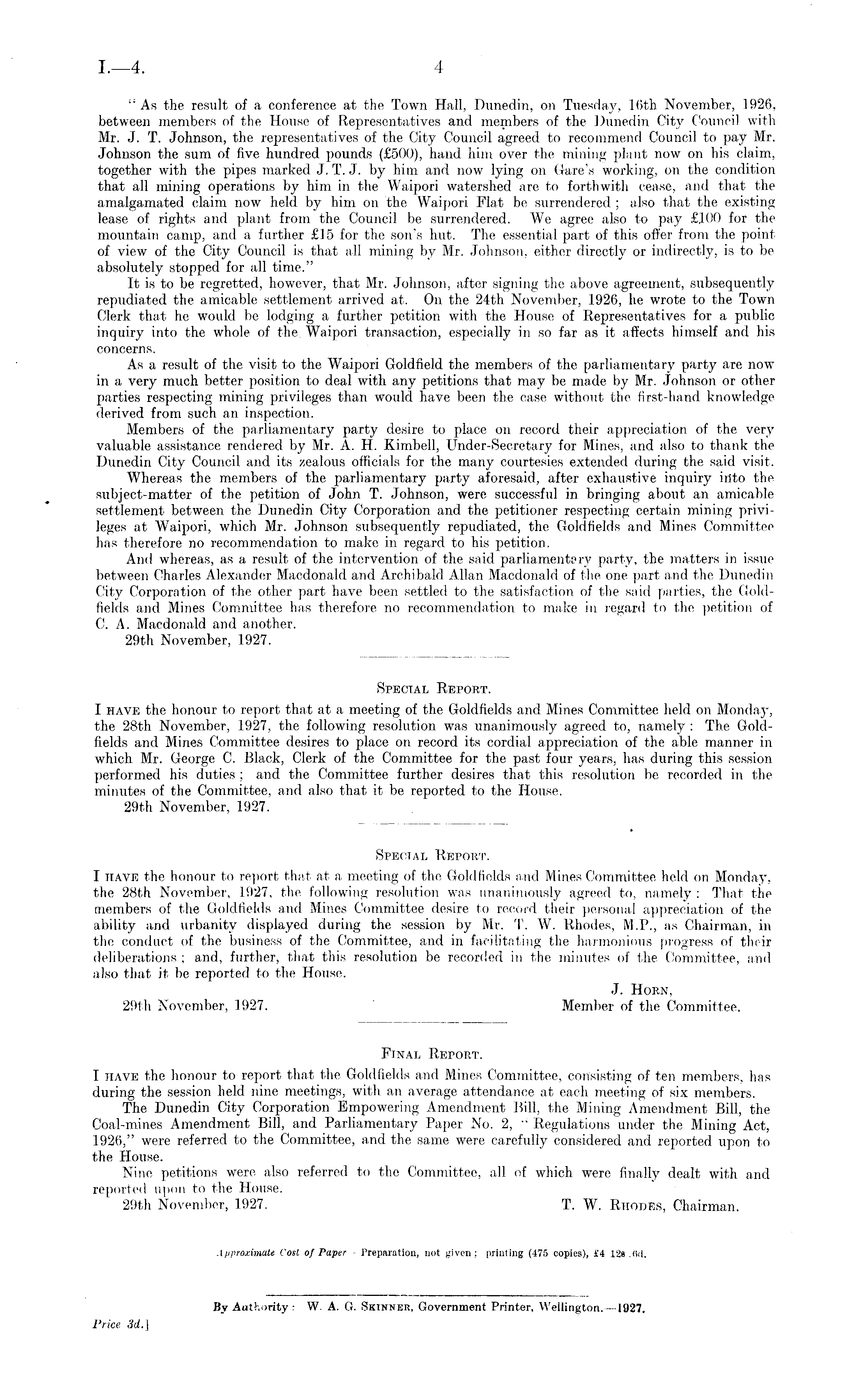 "As the result of a conference at the Town Hall, Dunedin, on Tuesday, 16th November, 1926, between members of the House of Representatives and members of the Dunedin City Council with Mr. J. T. Johnson, the representatives of the City Council agreed to recommend Council to pay Mr. Johnson the sum of five hundred pounds (£500), hand him over the mining plant now on his claim, together with the pipes marked J. T. J. by him and now lying on Gare's working, on the condition that all mining operations by him in the Waipori watershed are to forthwith cease, and that the amalgamated claim now held by him on the Waipori Flat be surrendered ; also that the existing lease of rights and plant from the Council be surrendered. We agree also to pay £100 for the mountain camp, and a further £15 for the son's hut. The essential part of this offer from the point of view of the City Council is that all mining by Mr. Johnson, either directly or indirectly, is to be absolutely stopped for all time." It is to be regretted, however, that Mr. Johnson, after signing the above agreement, subsequently repudiated the amicable settlement arrived at. On the 24th November, 1926, he wrote to the Town Clerk that he would be lodging a further petition with the House of Representatives for a public inquiry into the whole of the, Waipori transaction, especially in so far as it affects himself and his concerns. As a result of the visit to the Waipori Goldfield the members of the parliamentary party are now in a very much better position to deal with any petitions that may be made by Mr. Johnson or other parties respecting mining privileges than would have been the case without the first-hand knowledge derived from such an inspection. Members of the parliamentary party desire to place on record their appreciation of the very valuable assistance rendered by Mr. A. H. Kimbell, Under-Secretary for Mines, and also to thank the Dunedin City Council and its zealous officials for the many courtesies extended during the said visit. Whereas the members of the parliamentary party aforesaid, after exhaustive inquiry iilto the subject-matter of the petition of John T. Johnson, were successful in bringing about an amicable settlement between the Dunedin City Corporation and the petitioner respecting certain mining privileges at Waipori, which Mr. Johnson subsequently repudiated, the Goldfields and Mines Committee has therefore no recommendation to make in regard to his petition. And whereas, as a result of the intervention of the said parliaments ry party, the matters in issue between Charles Alexander Macdonald and Archibald Allan Macdonald of the one part and the Dunedin City Corporation of the other part have been settled to the satisfaction of the said parties, the Goldfields and Mines Committee has therefore no recommendation to make in regard to the petition of C. A. Macdonald and another. 29th November, 1927.