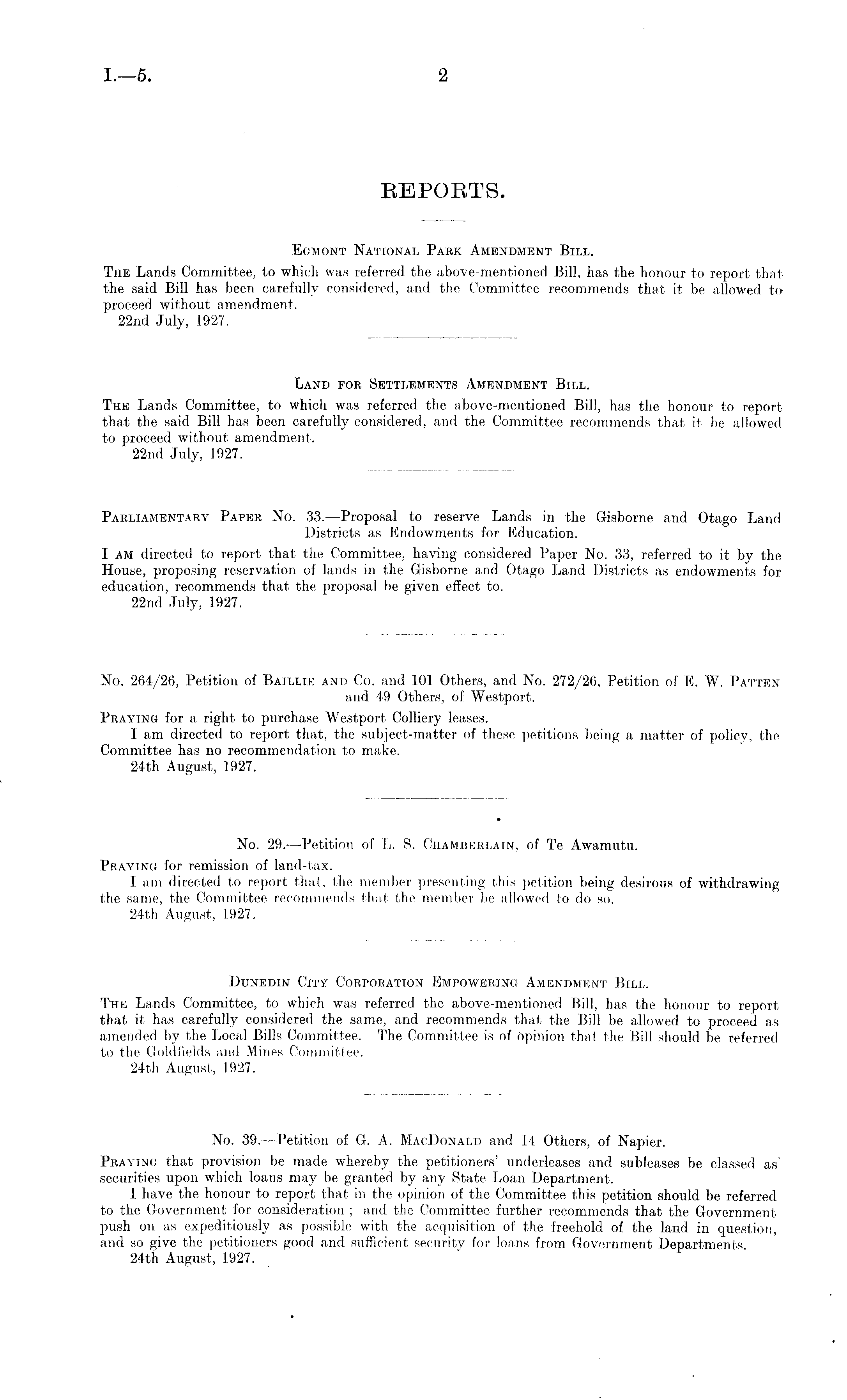 Parliamentary Paper No. 33.—Proposal to reserve Lands in the Gisborne and Otago Land Districts as Endowments for Education. I am directed to report that the Committee, having considered Paper No. 33, referred to it by the House, proposing reservation of lands in the Gisborne and Otago Land Districts as endowments for education, recommends that the proposal be given effect to. 22nd July, 1927. No. 264/26, Petition of Baillik and Co. and 101 Others, and No. 272/26, Petition of E. W. Patten and 49 Others, of Westport. Praying for a right to purchase Westport Colliery leases. I am directed to report that, the subject-matter of these petitions being a matter of policy, the Committee has no recommendation to make. 24th August, 1927.