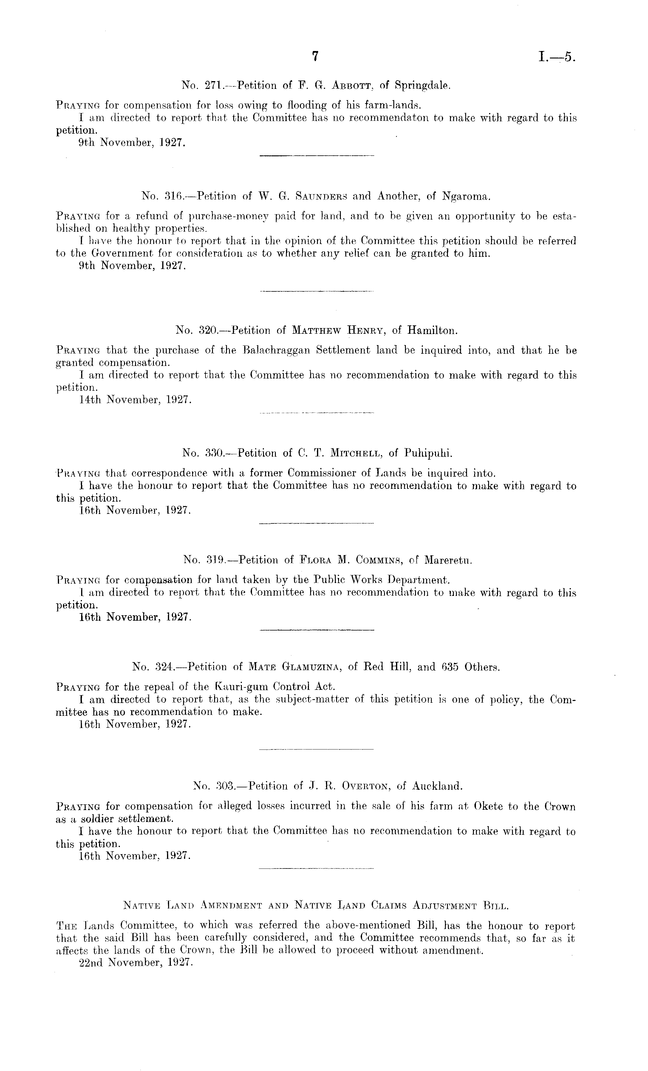 No. 303. —Petition of J. R. Overton, of Auckland. Praying for compensation for alleged losses incurred in the sale of his farm at Okete to the Crown as a soldier settlement. I have the honour to report that the Committee has no recommendation to make with regard to this petition. 16th November, 1927.