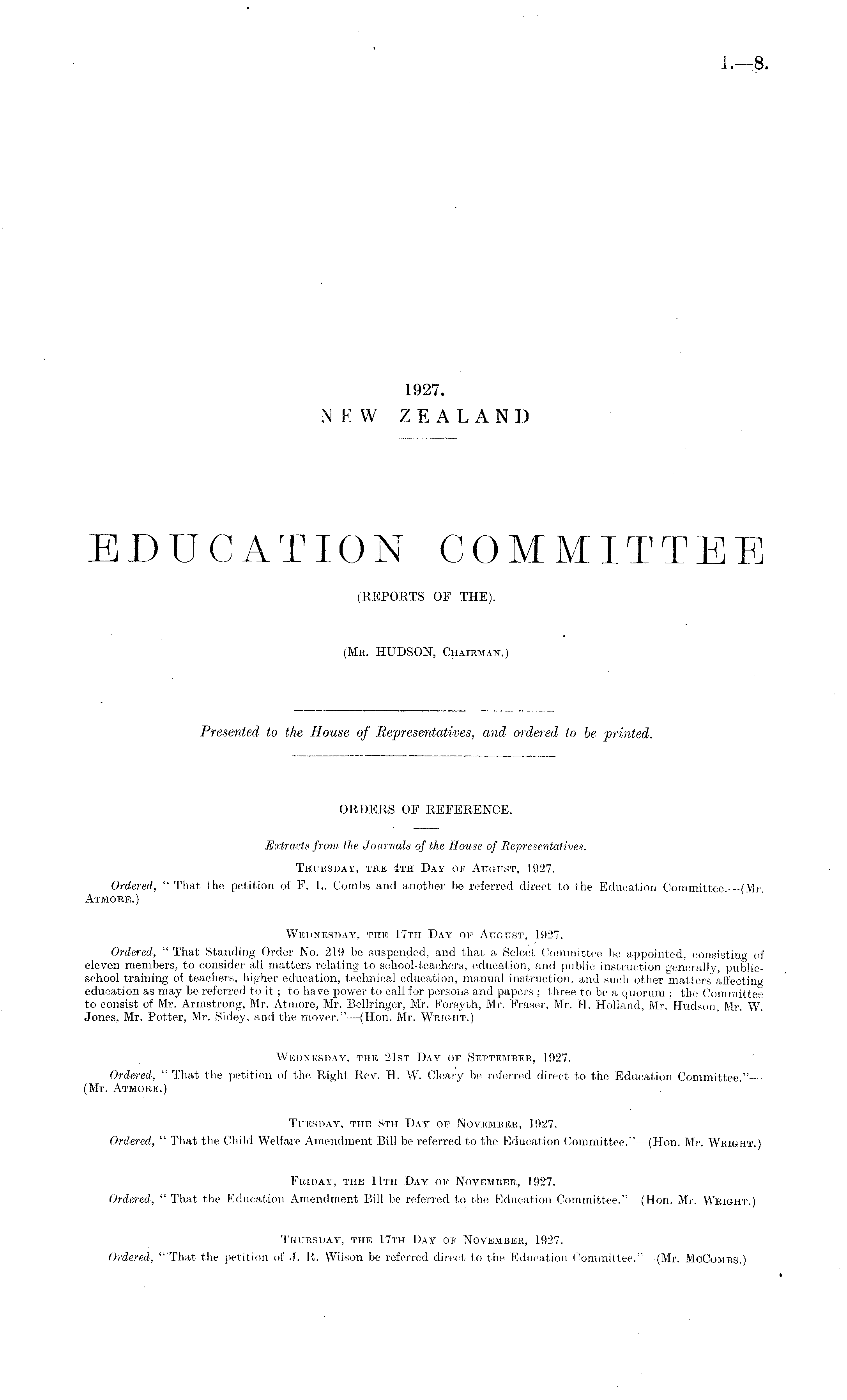 ORDERS OP REFERENCE. Extracts from the Journals of the House of Representatives. Thursday, the 4th Day of August, 1927. Ordered, " That the petition of F. L. Combs and another be referred direct to the Education Committee.-—(Mr. Atmore.) Wednesday, the 17th Day of August, 1927. Ordered, "That Standing Order No. 219 be suspended, and that a Select Committee be appointed, consisting of eleven members, to consider all matters relating to school-teachers, education, and public instruction generally, publicschool training of teachers, higher education, technical education, manual instruction, and such other matters affecting education as may be referred to it; to have power to call for persons and papers ; three to be a quorum ; the Committee to consist of Mr. Armstrong, Mr. Atmore, Mr. Bellringer, Mr. Forsyth, Mr. Eraser, Mr. H. Holland, Mr. Hudson, Mr. W. Jones, Mr. Potter, Mr. Sidey, and the mover." —(Hon. Mr. Wright.) Wednesday, the 21st Day of September, 1927. Ordered, " That the petition of the Right Rev. H. W. Cleary be referred direct to the Education Committee." (Mr. Atmore.) Tuesday, the Bth Day of November, 1927. Ordered, " That the Child Welfare Amendment Bill be referred to the Education Committee."—(Hon. Mr. Wright.) Friday, the 11th Day of November, 1927. Ordered, " That the Education Amendment Bill be referred to the Education Committee." —(Hon. Mr. Wright.) Thursday, the 17th Day of November, 1927. Ordered, "'That the petition of J. R. Wilson be referred direct to the Education Committee."—(Mr. McCombs.)