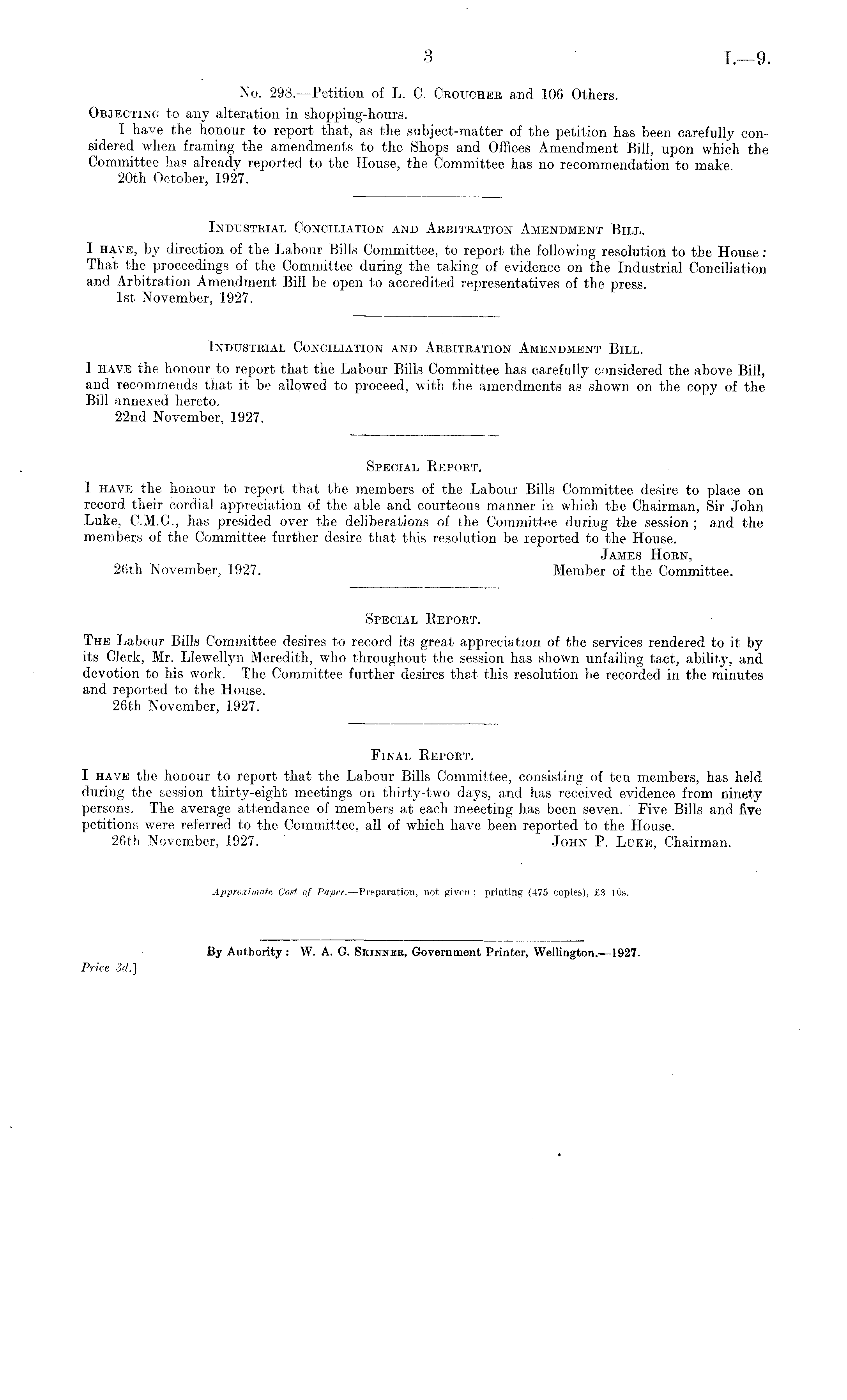 Special Report. I have the honour to report that the members of the Labour Bills Committee desire to place on record their cordial appreciation of the able and courteous manner in which the Chairman, Sir John Luke, C.M.G., has presided over the deliberations of the Committee during the session ; and the members of the Committee further desire that this resolution be reported to the House. James Horn, 26th November, 1927. Member of the Committee.