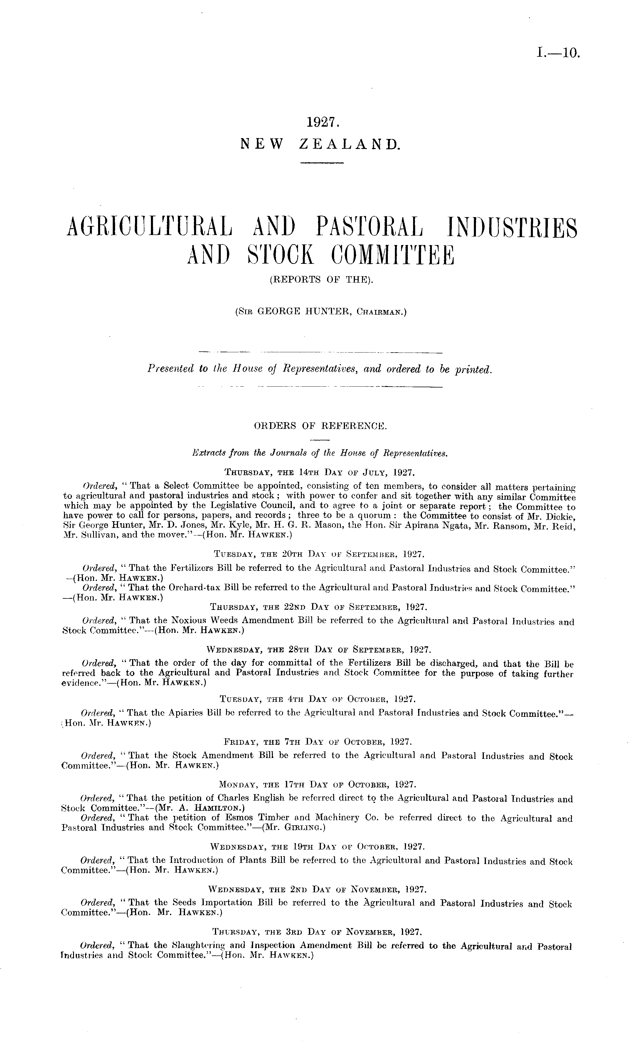ORDERS OF REFERENCE. Extracts from the Journals of the House of Representatives. Thursday, the 14th Day or July, 1927. Ordered, " That a Select Committee be appointed, consisting of ten members, to consider ail matters pertaining to agricultural and pastoral industries and stock; with power to confer and sit together with any similar Committee which may be appointed by the Legislative Council, and to agree to a joint or separate report; the Committee to have power to call for persons, papers, and records ; three to be a quorum : the Committee to consist of Mr. Dickie, Sir George Hunter, Mr. D. Jones, Mr. Kyle, Mr. H. G. R. Mason, the Hon. Sir Apirana Ngata, Mr. Ransom, Mr. Reid, Mr. Sullivan, and the mover."—(Hon. Mr. Hawken.) Tuesday, the 20th Day of September, 1927. Ordered, " That the Fertilizers Bill be referred to the Agricultural and Pastoral Industries and Stock Committee." —(Hon. Mr. Hawken.) Ordered, " That the Orchard-tax Bill be referred to the Agricultural and Pastoral Industries and Stock Committee." —(Hon. Mr. Hawken.) Thursday, the 22nd Day of September, 1927. Ordered, " That the Noxious Weeds Amendment Bill be referred to the Agricultural and Pastoral Industries and Stock Committee."—(Hon. Mr. Hawken.) Wednesday, the 28th Day of September, 1927. Ordered, " That the order of the day for committal of the Fertilizers Bill be discharged, and that the Bill be referred back to the Agricultural and Pastoral Industries and Stock Committee for the purpose of taking further evidence." —(Hon. Mr. Hawken.) Tuesday, the 4th Day of October, 1927. Ordered, " That the Apiaries Bill be referred to the Agricultural and Pastoral Industries and Stock Committee."— (Hon. Mr. Hawken.) Friday, the 7th Day of October, 1927. Ordered, " That the Stock Amendment Bill be referred to the Agricultural and Pastoral Industries and Stock Committee."—(Hon. Mr. Hawken.) Monday, the 17th Day of October, 1927. Ordered, " That the petition of Charles English be referred direct to the Agricultural and Pastoral Industries and Stock Committee."—(Mr. A. Hamilton.) Ordered, " That the petition of Esmos Timber and Machinery Co. be referred direct to the Agricultural and Pastoral Industries and Stock Committee."—(Mr. Girling.) Wednesday, the 19th Day of October, 1927. Ordered, " That the Introduction of Plants Bill be referred to the Agricultural and Pastoral Industries and Stock Committee."—(Hon. Mr. Hawken.) Wednesday, the 2nd Day of November, 1927. Ordered, " That the Seeds Importation Bill be referred to the Agricultural and Pastoral Industries and Stock Committee."—(Hon. Mr. Hawken.) Thursday, the 3rd Day of November, 1927. Ordered, " That the Slaughtering and Inspection Amendment Bill be referred to the Agricultural and Pastoral Industries and Stock Committee." —(Hon. Mr. Hawken.)