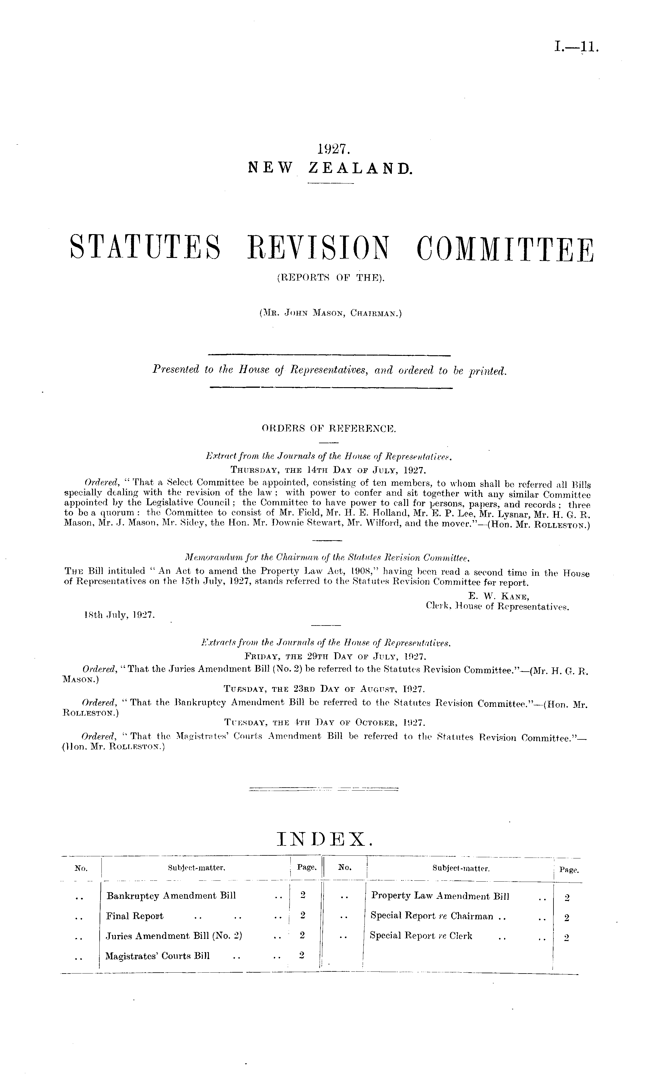 Extract from the Journals of the House of Representatives. Thursday, the ]4tii Day of July, 1927. Ordered, " That a Select Committee be appointed, consisting of ten members, to whom shall be referred all Bills specially dealing with the revision of the law ; with power to confer and sit together with any similar Committee appointed by the Legislative Council; the Committee to have power to call for persons, papers, and records ; three to be a quorum : the Committee to consist of Mr. Field, Mr. H. E. Holland, Mr. E. P. Lee, Mr. Lvsnar Mr. H. G. R. Mason, Mr. J. Mason, Mr. Sidey, the Hon. Mr. Downie Stewart, Mr. Wilford, and the mover."—(Hon. Mr. Rolleston.) Memorandum for the Chairman of the, Statutes Revision Committee. The Bill intituled " An Act to amend the Property Law Act, .1908," having been read a second time in the House ■of Representatives on the 15th July, 1927, stands referred to the Statutes Revision Committee for report. E. W. Kane, Clerk, House of Representatives. 18th July, 1927. Extracts from the Journals of the House of Representatives. Friday, the 29th Pay of July, 1927. Ordered, "That the Juries Amendment Bill (No. 2) be referred to the Statutes Revision Committee." (Mr. H. G. R. Mason.) Tuesday, the 23rd Day of August, 1927. Ordered, " That the Bankruptcy Amendment Bill be referred to the Statutes Revision Committee." (Hon. Mr. Rolleston.) Tuesday, the 4th Day of October, 1927. Ordered, " That the Magistrates' Courts Amendment Bill be referred to the Statutes Revision Committee." {Hon. Mr. Roli.eston.)