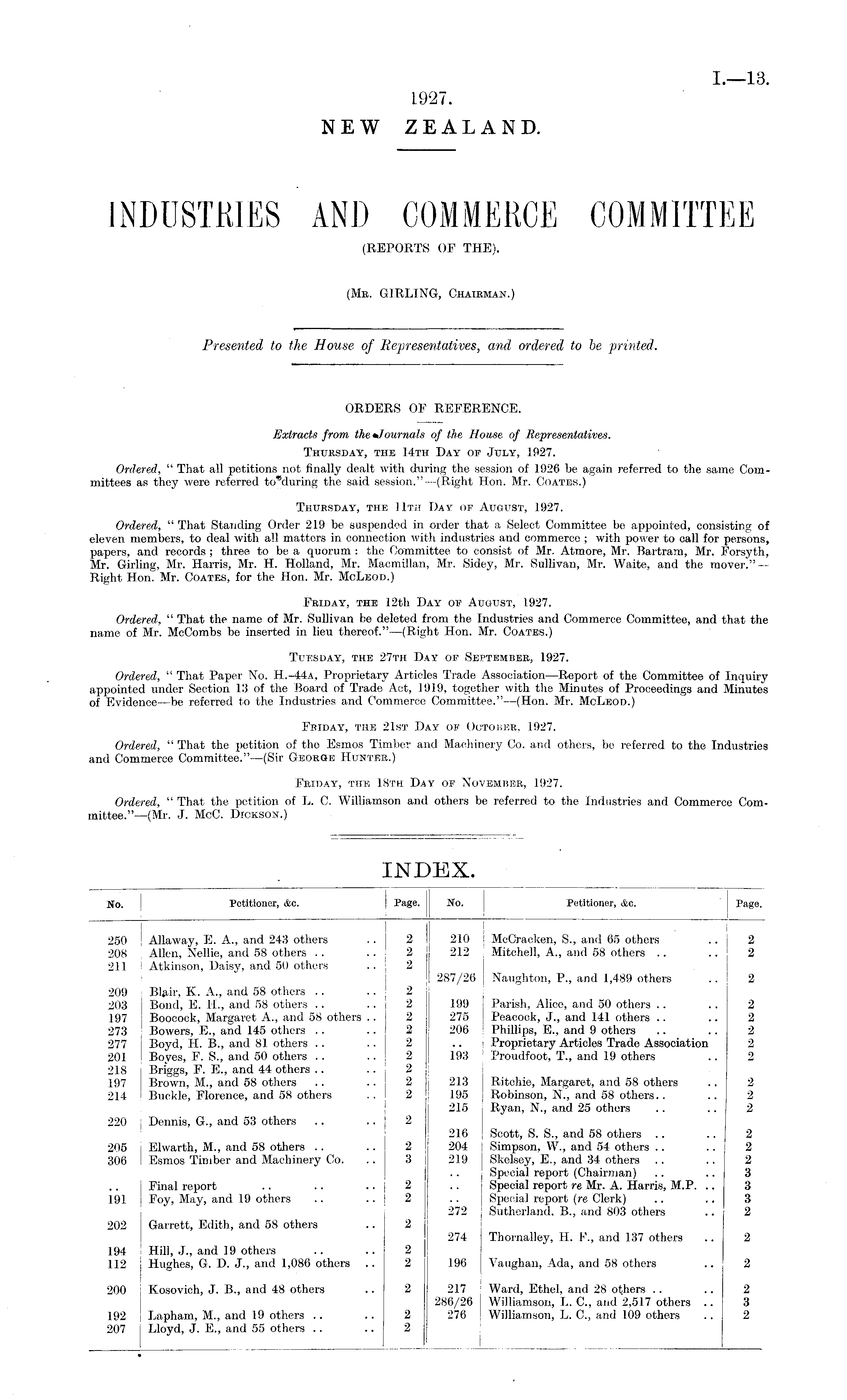 ORDERS OF REFERENCE. Extracts from the of the House of Representatives. Thursday, the 14th Bay of July, 1927. Ordered, " That all petitions not finally dealt with during the session of 1926 be again referred to the same Committees as they were referred to'during the said session." —(Right Hon. Mr. Coates.) Thursday, the 11th Day of August, 1927. Ordered, " That Standing Order 219 be suspended in order that a Select Committee be appointed, consisting of eleven members, to deal with all matters in connection with industries and commerce ; with power to call for persons, papers, and records ; three to be a quorum : the Committee to consist of Mr. Atmore, Mr. Bartram, Mr. Forsyth, Mr. Girling, Mr. Harris, Mr. H. Holland, Mr. Macmillan, Mr. Sidey, Mr. Sullivan, Mr. Waite, and the mover." — Right Hon. Mr. Coates, for the Hon. Mr. McLeod.) Friday, the 12th Day of August, 1927. Ordered, " That the name of Mr. Sullivan be deleted from the Industries and Commerce Committee, and that the name of Mr. McCombs be inserted in lieu thereof."—(Right Hon. Mr. Coates.) Tuesday, the 27th Day oe September, 1927. Ordered, " That Paper No. H.-44a, Proprietary Articles Trade Association—Report of the Committee of Inquiry appointed under Section 13 of the Board of Trade Act, 1919, together with the Minutes of Proceedings and Minutes of Evidence —be referred to the Industries and Commerce Committee." —(Hon. Mr. McLeod.) Friday, the 21st Day of October, 1927. Ordered, " That the petition of the Esmos Timber and Machinery Co. and others, be referred to the Industries and Commerce Committee." —(Sir Georqe Hunter.) Friday, the 18th Day of November, 1927. Ordered, " That the petition of L. C. Williamson and others be referred to the Industries and Commerce Committee." —(Mr. J. McC. Dickson.)