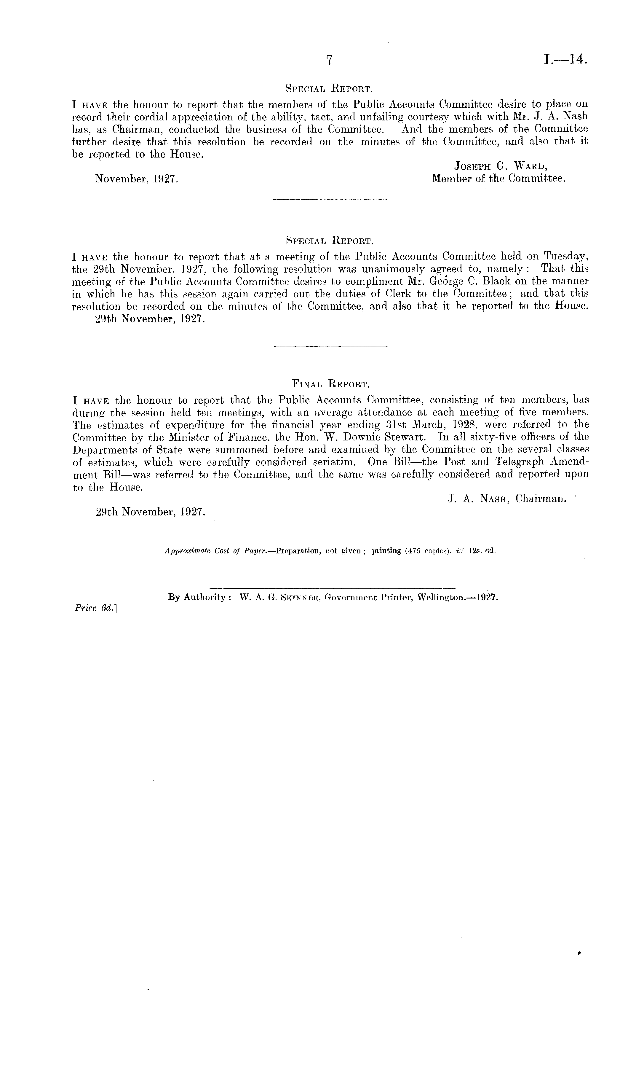 Special Report. I have the honour to report that the members of the Public Accounts Committee desire to place on record their cordial appreciation of the ability, tact, and unfailing courtesy which with Mr. J. A. Nash has, as Chairman, conducted the business of the Committee. And the members of the Committee further desire that this resolution be recorded on the minutes of the Committee, and also that it be reported to the House. Joseph G. Ward, November, 1927. Member of the Committee.
