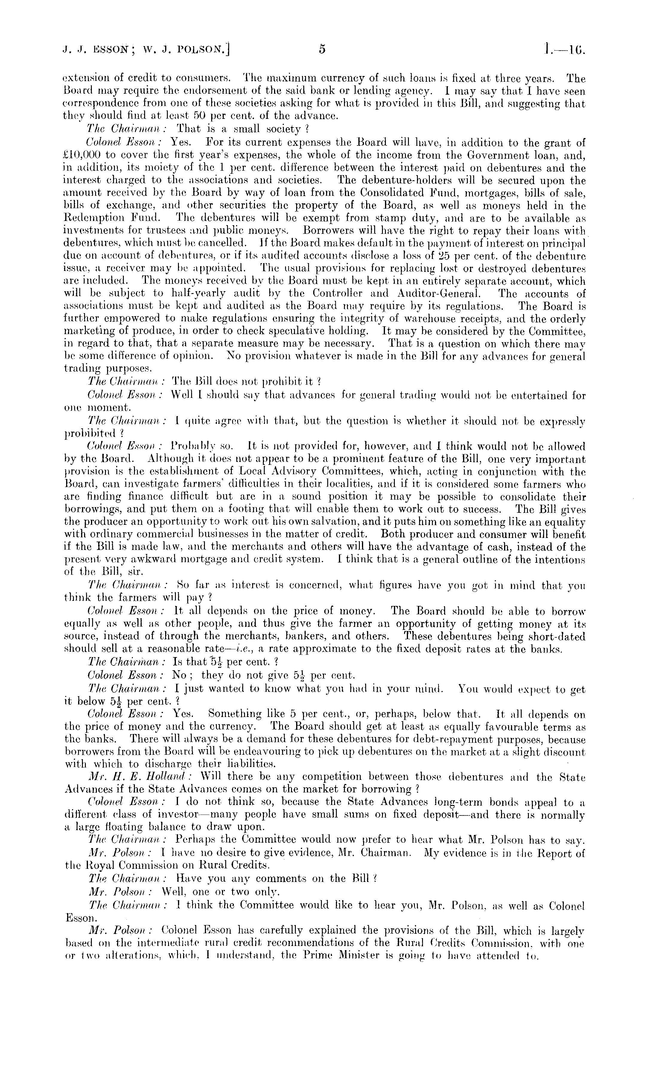 extension of credit to consumers. The maximum currency of such loans is fixed at three years. The Board may require the endorsement of the said bank or lending agency. I may say that I have seen correspondence from one of these societies asking for what is provided in this Bill, and suggesting that they should find at least 50 per cent, of the advance. The Chairman: That is a small society ? Colonel Esson : Yes. For its current expenses the Board will have, in addition to the grant of £10,000 to cover the first year's expenses, the whole of the income from the Government loan, and, in addition, its moiety of the 1 per cent, difference between the interest paid on debentures and the interest charged to the associations and societies. The debenture-holders will be secured upon the amount received by the Board by way of loan from the Consolidated Fund, mortgages, bills of sale, bills of exchange, and other securities the property of the Board, as well as moneys held in the Redemption Fund. The debentures will be exempt from stamp duty, and are to be available as investments for trustees and public moneys. Borrowers will have the right to repay their loans with debentures, which must be cancelled. If the Board makes default in the payment of interest on principal due on account of debentures, or if its audited accounts disclose a loss of 25 per cent, of the debenture issue, a receiver may be appointed. The usual provisions for replacing lost or destroyed debentures are included. The moneys received by the Board must be kept in an entirely separate account, which will be subject to half-yearly audit by the Controller and Auditor-General. The accounts of associations must be kept and audited as the Board may require by its regulations. The Board is further empowered to make regulations ensuring the integrity of warehouse receipts, and the orderly marketing of produce, in order to check speculative holding. It may be considered by the Committee, in regard to that, that a separate measure may be necessary. That is a question on which there may be some difference of opinion. No provision whatever is made in the Bill for any advances for general trading purposes. The Chairman : The Bill does not prohibit it ? Colonel Esson : Well I should say that advances for general trading would not be entertained for one moment. The Chairman: I quite agree with that, but the question is whether it should not be expressly prohibited ? Colonel Esson : Probably so. It is not provided for, however, and I think would not be allowed by the Board. Although it does not appear to be a prominent feature of the Bill, one very important provision is the establishment of Local Advisory Committees, which, acting in conjunction with the Board, can investigate farmers' difficulties in their localities, and if it is considered some farmers who are finding finance difficult but are in a sound position it may be possible to consolidate their borrowings, and put them on a footing that will enable them to work out to success. The Bill gives the producer an opportunity to work out his own salvation, and it puts him on something like an equality with ordinary commercial businesses in the matter of credit. Both producer and consumer will benefit if the Bill is made law, and the merchants and others will have the advantage of cash, instead of the present very awkward mortgage and credit system. I think that is a general outline of the intentions of the Bill, sir. The Chairman : So far as interest is concerned, what figures have you got in mind that you think the farmers will pay ? Colonel Esson : It all depends on the price of money. The Board should be able to borrow equally as well as other people, and thus give the farmer an opportunity of getting money at its source, instead of through the merchants, bankers, and others. These debentures being short-dated should sell at a reasonable rate —i.e., a rate approximate to the fixed deposit rates at the banks. The Chairman : Is thatl>|- per cent. ? Colonel Esson: No ; they do not give 5-|- per cent. The Chairman : I just wanted to know what you had in your mind. You would expect to get it below 5| per cent. ? Colonel Esson : Yes. Something like 5 per cent., or, perhaps, below that. It all depends on the price of money and the currency. The Board should get at least as equally favourable terms as the banks. There will always be a demand for these debentures for debt-repayment purposes, because borrowers from the Board will be endeavouring to pick up debentures on the market at a slight discount with which to discharge their liabilities. Mr. H. E. Holland,: Will there be any competition between those debentures and the State Advances if the State Advances comes on the market for borrowing ? Colonel Esson : I do not think so, because the State Advances long-term bonds appeal to a different class of investor —many people have small sums on fixed deposit—and there is normally a large floating balance to draw upon. The Chairman : Perhaps the Committee would now prefer to hear what Mr. Poison has to say. Mr. Poison : I have no desire to give evidence, Mr. Chairman. My evidence is in the Report of the Royal Commission on Rural Credits. The Chairman : Have you any comments on the Bill ? Mr. Poison : Well, one or two only. The Chairman: I think the Committee would like to hear you, Mr. Poison, as well as Colonel Esson. Mr. Poison : Colonel Esson has carefully explained the provisions of the Bill, which is largelv based on the intermediate rural credit recommendations of the Rural Credits Commission, with one or two alterations, which, 1 understand, the Prime Minister is going to have attended to.