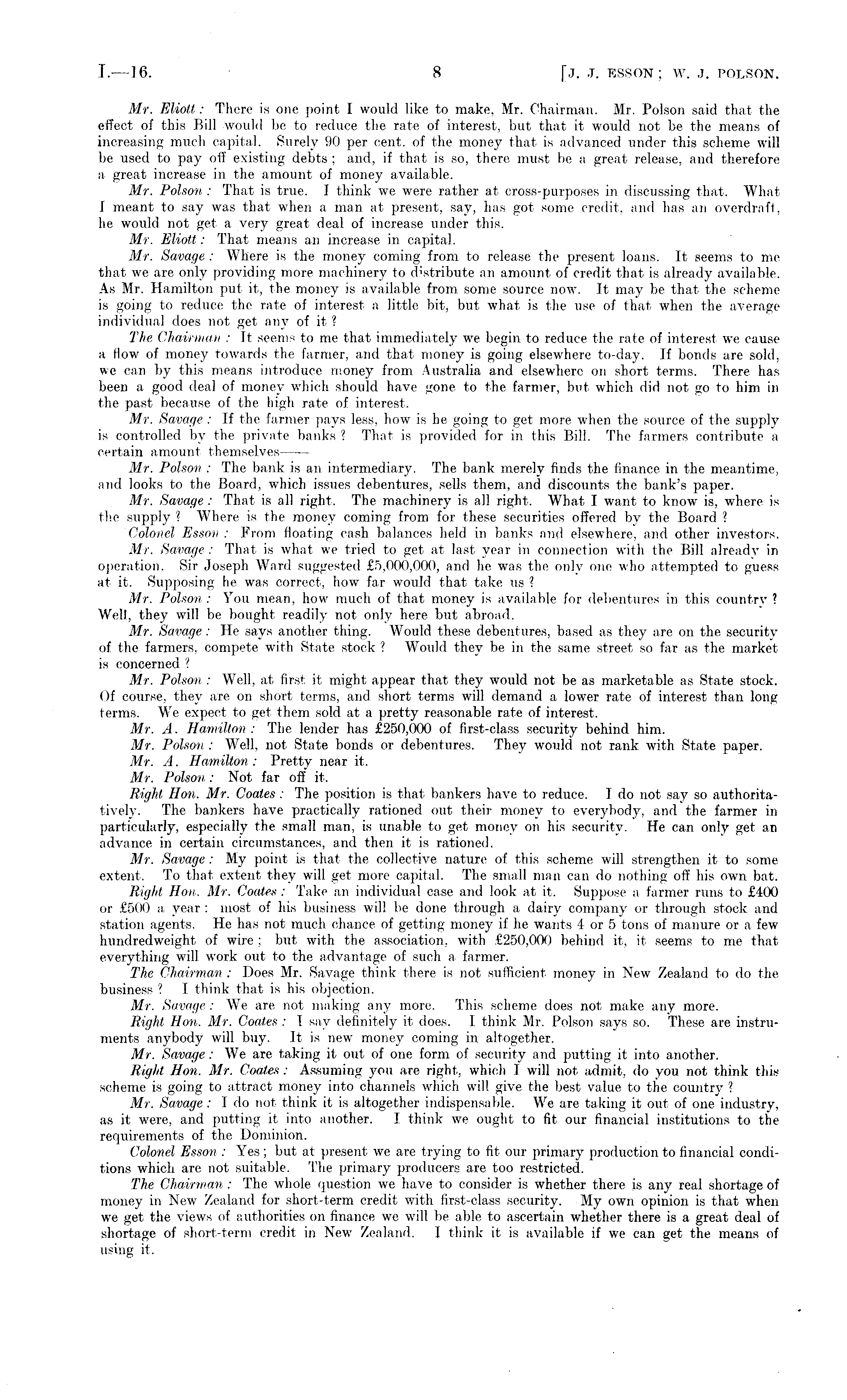 Mr. Eliott: There is one point I would like to make, Mr. Chairman. Mr. Poison said that the effect of this Bill would be to reduce the rate of interest, but that it would not be the means of increasing much capital. Surely 90 per cent, of the money that is advanced under this scheme will be used to pay off existing debts ; and, if that is so, there must be a great release, and therefore a great increase in the amount of money available. Mr. Poison : That is true. I think we were rather at cross-purposes in discussing that. What I meant to say was that when a man at present, say, has got some credit, and has an overdraft, he would not get a very great deal of increase under this. Mr. Eliott: That means an increase in capital. Mr. Savage : Where is the money coming from to release the present loans. It seems to me that we are only providing more machinery to distribute an amount of credit that is already available. As Mr. Hamilton put it, the money is available from some source now. It may be that the scheme is going to reduce the rate of interest a little bit, but what is the use of that when the average individual does not get any of it ? The Chairman : It seems to me that immediately we begin to reduce the rate of interest we cause a flow of money towards the farmer, and that money is going elsewhere to-day. If bonds are sold, we can by this means introduce money from Australia and elsewhere on short terms. There has been a good deal of money which should have gone to the farmer, but which did not go to him in the past because of the high rate of interest. Mr. Savage : If the farmer pays less, how is he going to get more when the source of the supply is controlled by the private banks ? That is provided for in this Bill. The farmers contribute a certain amount themselves Mr. Poison : The bank is an intermediary. The bank merely finds the finance in the meantime, and looks to the Board, which issues debentures, sells them, and discounts the bank's paper. Mr. Savage : That is all right. The machinery is all right. What I want to know is, where is the supply ? Where is the money coming from for these securities offered by the Board ? Colonel Esson : From floating cash balances held in banks and elsewhere, and other investors. Mr. Savage : That is what we tried to get at last year in connection with the Bill already in operation. Sir Joseph Ward suggested £5,000,000, and he was the only one who attempted to guess at it. Supposing he was correct, how far would that take us ? Mr. Poison : You mean, how much of that money is available for debentures in this countrv ? Well, they will be bought readily not only here but abroad. Mr. Savage: He says another thing. Would these debentures, based as they are on the security of the farmers, compete with State stock ? Would they be in the same street so far as the market is concerned ? Mr. Poison : Well, at first it might appear that they would not be as marketable as State stock. Of course, they are on short terms, and short terms will demand a lower rate of interest than long terms. We expect to get them sold at a pretty reasonable rate of interest. Mr. A. Hamilton : The lender has £250,000 of first-class security behind him. Mr. Poison : Well, not State bonds or debentures. They would not rank with State paper. Mr. A. Hamilton : Pretty near it. Mr. Poison: Not far off it. Right Hon. Mr. Coates : The position is that bankers have to reduce. Ido not say so authoritatively. The bankers have practically rationed out their money to everybody, and the farmer in particularly, especially the small man, is unable to get money on his security. He can only get an advance in certain circumstances, and then it is rationed. Mr. Savage : My point is that the collective nature of this scheme will strengthen it to some extent. To that extent they will get more capital. The small man can do nothing off his own bat. Right Hon. Mr. Coates : Take an individual case and look at it. Suppose a farmer runs to £400 or £500 a year : most of his business will be done through a dairy company or through stock and station agents. He has not much chance of getting money if he wants 4or 5 tons of manure or a few hundredweight of wire ; but with the association, with £250,000 behind it, it seems to me that everything will work out to the advantage of such a farmer. The Chairman : Does Mr. Savage think there is not sufficient money in New Zealand to do the business ? I think that is his objection. Mr. Savage : We are not making any more. This scheme does not make any more. Right Hon. Mr. Coates : I say definitely it does. I think Mr. Poison says so. These are instruments anybody will buy. It is new money coming in altogether. Mr. Savage: We are taking it out of one form of security and putting it into another. Right Hon. Mr. Coates: Assuming you are right, which I will not admit, do you not think this scheme is going to attract money into channels which will give the best value to the country ? Mr. Savage: Ido not think it is altogether indispensable. We are taking it out of one industry, as it were, and putting it into another. I think we ought to fit our financial institutions to the requirements of the Dominion. Colonel Esson : Yes; but at present we are trying to fit our primary production to financial conditions which are not suitable. The primary producers are too restricted. The Chairman : The whole question we have to consider is whether there is any real shortage of money in New Zealand for short-term credit with first-class security. My own opinion is that when we get the views of authorities on finance we will be able to ascertain whether there is a great deal of shortage of short-term credit in New Zealand. I think it is available if we can get the means of using it.