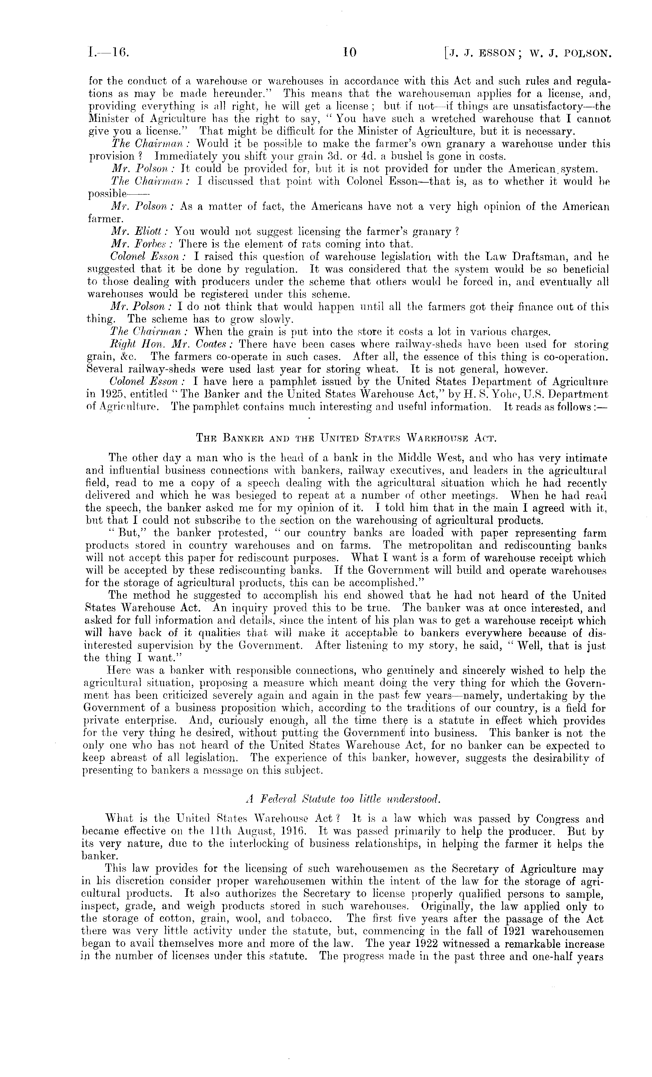 for the conduct of a warehouse or warehouses in accordance with this Act and such rules and regulations as may be made hereunder." This means that the warehouseman applies for a license, and, providing everything is all right, he will get a license ; but if not—if things are unsatisfactory—the Minister of Agriculture has the right to say, "You have such a wretched warehouse that I cannot give you a license." That might be difficult for the Minister of Agriculture, but it is necessary. The Chairman : Would it be possible to make the farmer's own granary a warehouse under this provision ? Immediately you shift your grain 3d. or 4d. a bushel is gone in costs. Mr. Poison: It could be provided for, but it is not provided for under the American.system. The Chairman: I discussed that point with Colonel Esson—that is, as to whether it would be possible Mr. Poison : As a matter of fact, the Americans have not a very high opinion of the American farmer. Mr. Eliott: You would not suggest licensing the farmer's granary ? Mr. Forbes : There is the element of rats coming into that. Colonel Esson : I raised this question of warehouse legislation with the Law Draftsman, and he suggested that it be done by regulation. It was considered that the system would be so beneficial to those dealing with producers under the scheme that others would be forced in, and eventually all warehouses would be registered under this scheme. Mr. Poison : I do not think that would happen until all the farmers got theif finance out of this thing. The scheme has to grow slowly. The Chairman : When the grain is put into the store it costs a lot in various charges. Right Hon. Mr. Coates: There have been cases where railway-sheds have been used for storing grain, &c. The farmers co-operate in such cases. After all, the essence of this thing is co-operation. Several railway-sheds were used last year for storing wheat. It is not general, however. Colonel Esson : I have here a pamphlet issued by the United States Department of Agriculture in 1925, entitled " The Banker and the United States Warehouse Act," by H. S. Yohe, U.S. Department of Agriculture. The pamphlet contains much interesting and useful information. It reads as follows :— The Banker and the United States Warehouse Act. The other day a man who is the head of a bank in the Middle West, and who has very intimate and influential business connections with bankers, railway executives, and leaders in the agricultural field, read to me a copy of a speech dealing with the agricultural situation which he had recently delivered and which he was besieged to repeat at a number of other meetings. When he had read the speech, the banker asked me for my opinion of it. I told him that in the main I agreed with it, but that I could not subscribe to the section on the warehousing of agricultural products. " But," the banker protested, " our country banks are loaded with paper representing farm products stored in country warehouses and on farms. The metropolitan and rediscounting banks will not accept this paper for rediscount purposes. What I want is a form of warehouse receipt which will be accepted by these rediscounting banks. If the Government will build and operate warehouses for the storage of agricultural products, this can be accomplished." The method he suggested to accomplish his end showed that he had not heard of the United States Warehouse Act. An inquiry proved this to be true. The banker was at once interested, and asked for full information and details, since the intent of his plan was to get a warehouse receipt which will have back of it qualities that will make it acceptable to bankers everywhere because of disinterested supervision by the Government. After listening to my story, he said, " Well, that is just the thing I want." Here was a banker with responsible connections, who genuinely and sincerely wished to help the agricultural situation, proposing a measure which meant doing the very thing for which the Government has been criticized severely again and again in the past few years —namely, undertaking by the Government of a business proposition which, according to the traditions of our country, is a field for private enterprise. And, curiously enough, all the time is a statute in effect which provides for the very thing he desired, without putting the Government into business. This banker is not the only one who has not heard of the United States Warehouse Act, for no banker can be expected to keep abreast of all legislation. The experience of this banker, however, suggests the desirability of presenting to bankers a message on this subject. A Federal Statute too little understood. What is tlie United States Warehouse Act ? It is a law which was passed by Congress and became effective 011 the 11th August, 1916. It was passed primarily to help the producer. But by its very nature, due to the interlocking of business relationships, in helping the farmer it helps the banker. This law provides for the licensing of such warehousemen as the Secretary of Agriculture may in his discretion consider proper warehousemen within the intent of the law for the storage of agricultural products. It also authorizes the Secretary to license properly qualified persons to sample, inspect, grade, and weigh products stored in such warehouses. Originally, the law applied only to the storage of cotton, grain, wool, and tobacco. The first five years after the passage of the Act there was very little activity under the statute, but, commencing in the fall of 1921 warehousemen began to avail themselves more and more of the law. The year 1922 witnessed a remarkable increase in the number of licenses under this statute. The progress made in the past three and one-half years