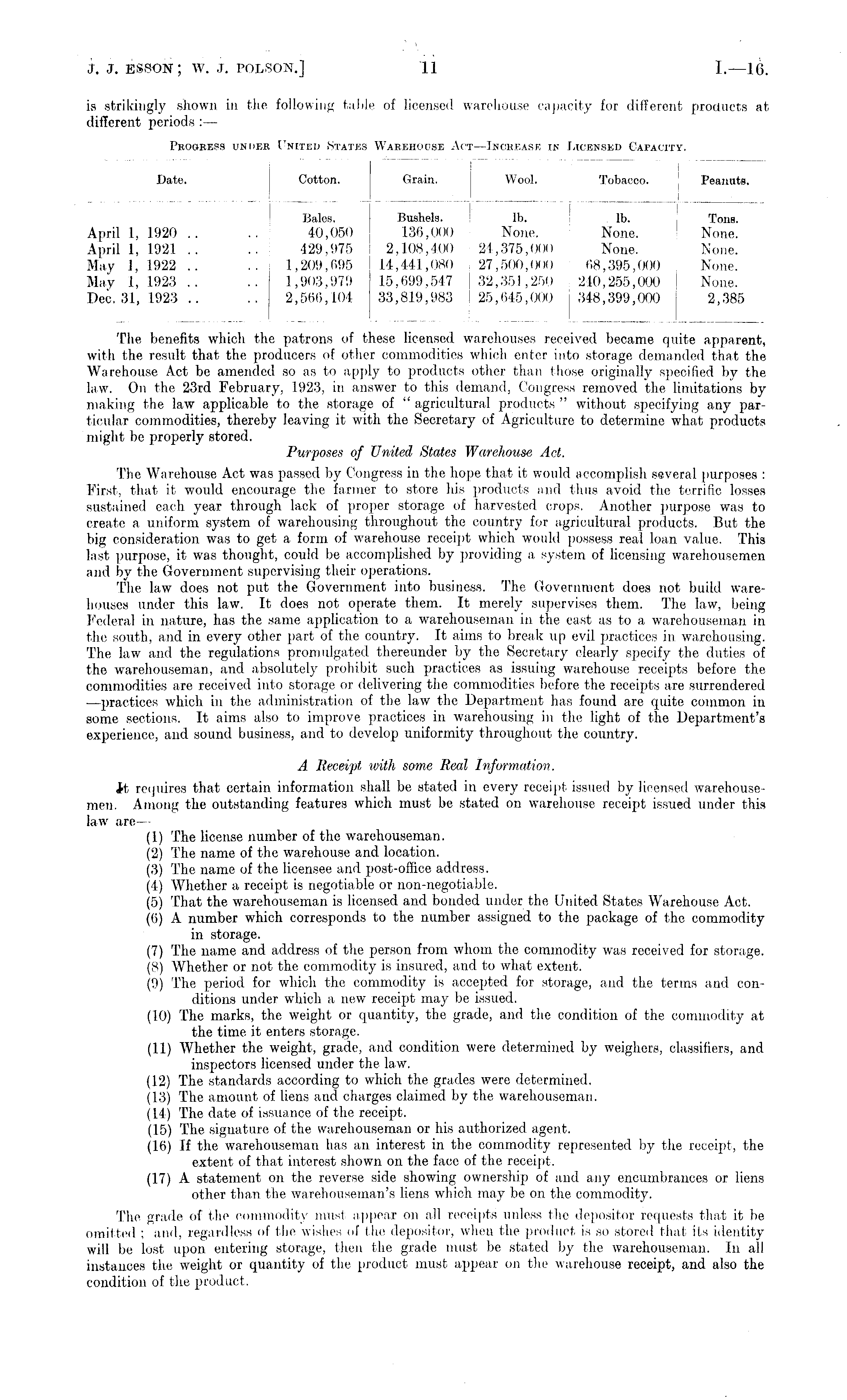 The benefits which the patrons of these licensed warehouses received became quite apparent, with the result that the producers of other commodities which enter into storage demanded that the Warehouse Act be amended so as to apply to products other than those originally specified by the law. On the 23rd February, 1923, in answer to this demand, Congress removed "the limitations by making the law applicable to the storage of " agricultural products " without specifying any particular commodities, thereby leaving it with the Secretary of Agriculture to determine what products might be properly stored. Purposes of United States Warehouse Act. The Warehouse Act was passed by Congress in the hope that it would accomplish several purposes : First, that it would encourage the farmer to store his products and thus avoid the terrific losses sustained each year through lack of proper storage of harvested crops. Another purpose was to create a uniform system of warehousing throughout the country for agricultural products. But the big consideration was to get a form of warehouse receipt which would possess real loan value. This last purpose, it was thought, could be accomplished by providing a system of licensing warehousemen and by the Government supervising their operations. The law does not put the Government into business. The Government does not build warehouses under this law. It does not operate them. It merely supervises them. The law, being Federal in nature, has the same application to a warehouseman in the east as to a warehouseman in the south, and in every other part of the country. It aims to break up evil practices in warehousing. The law and the regulations promulgated thereunder by the Secretary clearly specify the duties of the warehouseman, and absolutely prohibit such practices as issuing warehouse receipts before the commodities are received into storage or delivering the commodities before the receipts are surrendered —practices which in the administration of the law the Department has found are quite common in some sections. It aims also to improve practices in warehousing in the light of the Department's experience, and sound business, and to develop uniformity throughout the country. A Receipt, with some Real Information. it requires that certain information shall be stated in every receipt issued by licensed warehousemen. Among the outstanding features which must be stated on warehouse receipt issued under this law are — (1) The license number of the warehouseman. (2) The name of the warehouse and location. (3) The name of the licensee and post-office address. (4) Whether a receipt is negotiable or non-negotiable. (5) That the warehouseman is licensed and bonded under the United States Warehouse Act. (6) A number which corresponds to the number assigned to the package of the commodity in storage. (7) The name and address of the person from whom the commodity was received for storage. (8) Whether or not the commodity is insured, and to what extent. (9) The period for which the commodity is accepted for storage, and the terms and conditions under which a new receipt may be issued. (10) The marks, the weight or quantity, the grade, and the condition of the commodity at the time it enters storage. (11) Whether the weight, grade, and condition were determined by weighers, classifiers, and inspectors licensed under the law. (12) The standards according to which the grades were determined. (13) The amount of liens and charges claimed by the warehouseman. (14) The date of issuance of the receipt. (15) The signature of the warehouseman or his authorized agent. (16) If the warehouseman has an interest in the commodity represented by the receipt, the extent of that interest shown on the face of the receipt. (17) A statement on the reverse side showing ownership of and any encumbrances or liens other than the warehouseman's liens which may be on the commodity. The grade of the commodity must appear on all receipts unless the depositor requests that it be omitted ; and, regardless of the wishes of the depositor, when the product is so stored that its identity will be lost upon entering storage, then the grade must be stated by the warehouseman. In all instances the weight or quantity of the product must appear on the warehouse receipt, and also the condition of the product.