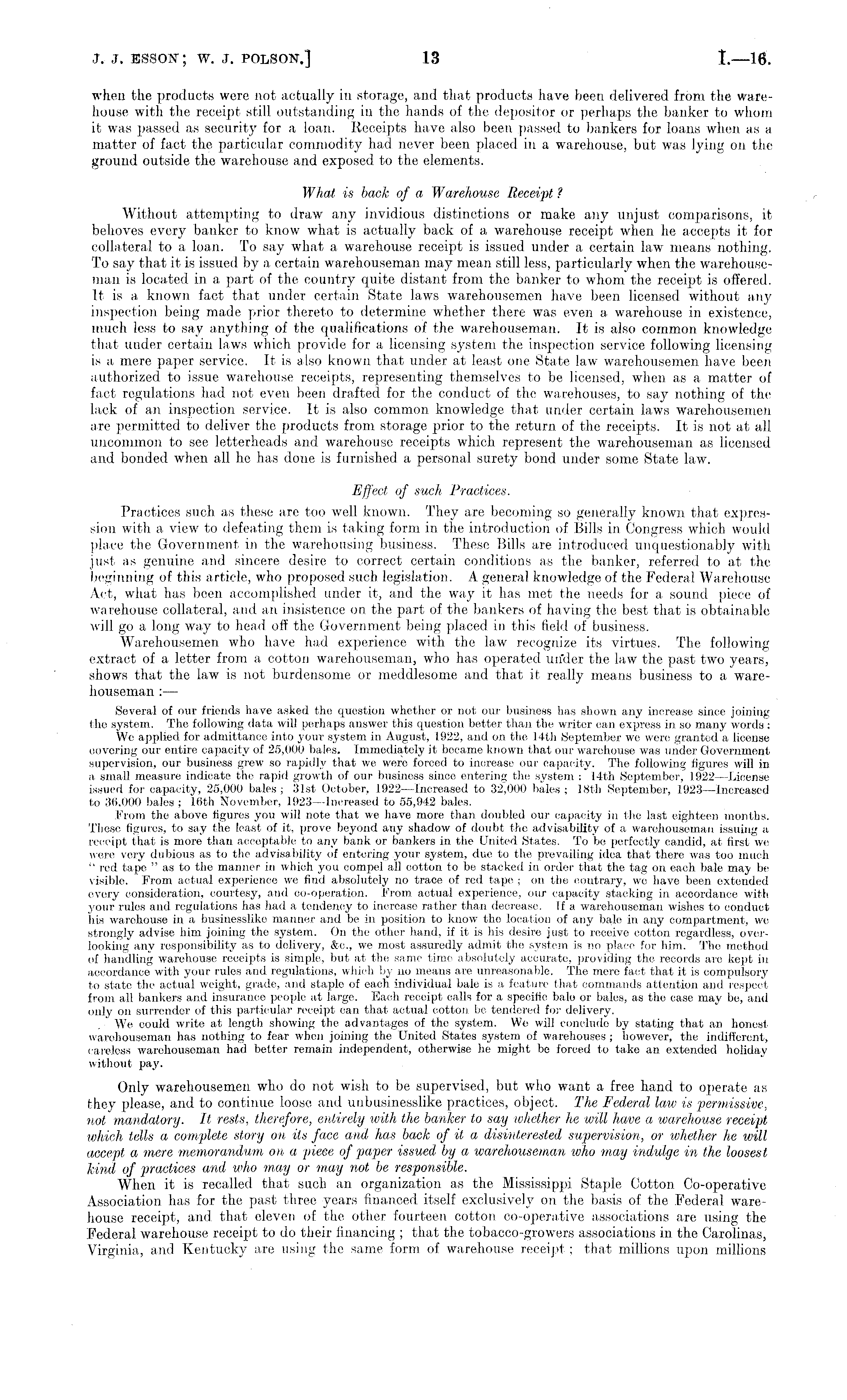 when the products were not actually in storage, and that products have been delivered from the warehouse with the receipt still outstanding in the hands of the depositor or perhaps the banker to whom it was passed as security for a loan. Receipts have also been passed to bankers for loans when as a matter of fact the particular commodity had never been placed in a warehouse, but was lying on the ground outside the warehouse and exposed to the elements. What is back of a Warehouse Receipt ? Without attempting to draw any invidious distinctions or make any unjust comparisons, it behoves every banker to know what is actually back of a warehouse receipt when he accepts it for collateral to a loan. To say what a warehouse receipt is issued under a certain law means nothing. To say that it is issued by a certain warehouseman may mean still less, particularly when the warehouseman is located in a part of the country quite distant from the banker to whom the receipt is offered. It is a known fact that under certain State laws warehousemen have been licensed without any inspection being made prior thereto to determine whether there was even a warehouse in existence, much less to say anything of the qualifications of the warehouseman. It is also common knowledge that under certain laws which provide for a licensing system the inspection service following licensing is a mere paper service. It is also known that under at least one State law warehousemen have been authorized to issue warehouse receipts, representing themselves to be licensed, when as a matter of fact regulations had not even been drafted for the conduct of the warehouses, to say nothing of the lack of an inspection service. It is also common knowledge that under certain laws warehousemen are permitted to deliver the products from storage prior to the return of the receipts. It is not at all uncommon to see letterheads and warehouse receipts which represent the warehouseman as licensed and bonded when all he has done is furnished a personal surety bond under some State law. Effect of such Practices. Practices such as these are too well known. They are becoming so generally known that expression with a view to defeating them is taking form in the introduction of Bills in Congress which would place the Government in the warehousing business. These Bills are introduced unquestionably with just as genuine and sincere desire to correct certain conditions as the banker, referred to at the beginning of this article, who proposed such legislation. A general knowledge of the Federal Warehouse Act, what has been accomplished under it, and the way it has met the needs for a sound piece of warehouse collateral, and an insistence on the part of the bankers of having the best that is obtainable will go a long way to head off the Government being placed in this field of business. Warehousemen who have had experience with the law recognize its virtues. The following extract of a letter from a cotton warehouseman, who has operated un'der the law the past two years, shows that the law is not burdensome or meddlesome and that it really means business to a warehouseman :— Several of our friends have asked the question whether or not our business has shown any increase since joining the system. The following data will perhaps answer this question better than the writer can express in so many words: We applied for admittance into your system in August, 1922, and on the 14th September we were granted a license oovering our entire capacity of 25,000 bales. Immediately it became known that our warehouse was under Government supervision, our business grew so rapidly that we were forced to increase our capacity. The following figures will in a small measure indicate the rapid growth of our business since entering the system : 14th September, 1922—License issued for capacity, 25,000 bales ; 31st October, 1922—Increased to 32,000 bales ; 18th September, 1923—Increased to 36,000 bales ; 16th November, 1923 —Increased to 55,942 bales. From the above figures you will note that we have more than doubled our capacity in the last eighteen months. These figures, to say the least of it, prove beyond any shadow of doubt the advisability of a warehouseman issuing a receipt that is more than acceptable to any bank or bankers in the United States. To be perfectly candid, at first we were very dubious as to the advisability of entering your system, due to the prevailing idea that there was too much " red tape " as to the manner in which you compel all cotton to be stacked in order that the tag on each bale may be visible. From actual experience we find absolutely no trace of red tape ; on the contrary, we have been extended every consideration, courtesy, and co-operation. From actual experience, our capacity stacking in accordance with your rules and regulations has had a tendency to increase rather than decrease. If a warehouseman wishes to conduct his warehouse in a businesslike manner and be in position to know the location of any ba,le in any compartment, we strongly advise him joining the system. On the other hand, if it is his desire just to receive cotton regardless, overlooking any responsibility as to delivery, &e., we most assuredly admit the system is no place for him. The method of handling warehouse receipts is simple, but at the same time absolutely accurate, providing the records are kept in accordance with your rules and regulations, which by no means are unreasonable. The mere fact that it is compulsory to state the actual weight, grade, and staple of each individual bale is a feature that commands attention and respect from all bankers and insurance people at large. Each receipt calls for a specific balo or bales, as the case may be, and only on surrender of this particular receipt can that actual cotton be tendered for delivery. We eould write at length showing the advantages of the system. We will conclude by stating that an honest warehouseman h