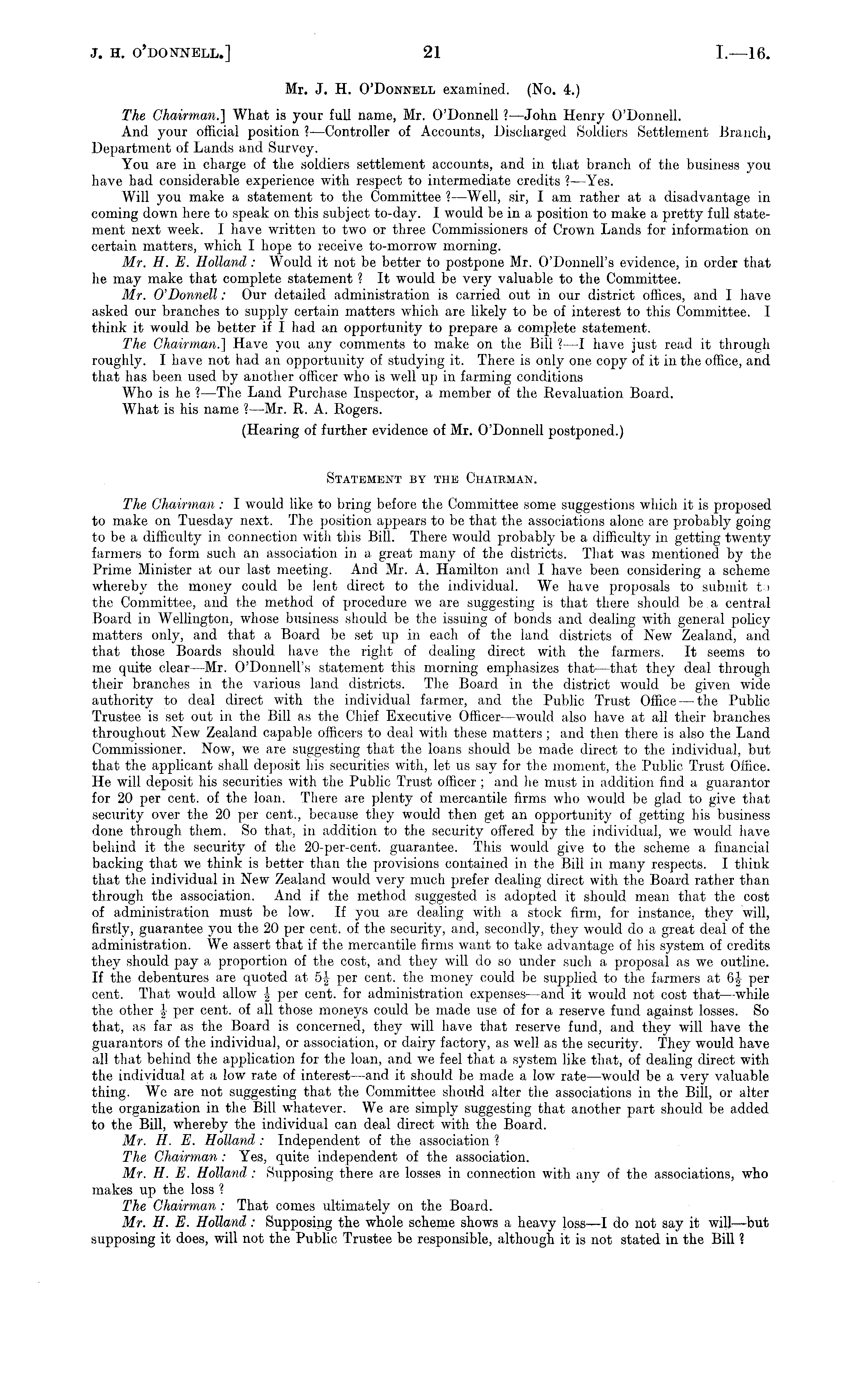 Mr. J. H. O'Donnell examined. (No. 4.) The Chairman.'] What is your full name, Mr. O'Donnell ? —John Henry O'Donnell. And your official position ?—Controller of Accounts, Discharged Soldiers Settlement Branch, Department of Lands and Survey. You are in charge of the soldiers settlement accounts, and in that branch of the business you have had considerable experience with respect to intermediate credits ?—Yes. Will you make a statement to the Committee ? —Well, sir, 1 am rather at a disadvantage in coming down here to speak on this subject to-day. I would be in a position to make a pretty full statement next week. I have written to two or three Commissioners of Crown Lands for information on certain matters, which I hope to receive to-morrow morning. Mr. H. E. Holland : Would it not be better to postpone Mr. O'Donnell's evidence, in order that he may make that complete statement ? It would be very valuable to the Committee. Mr. O'Donnell: Our detailed administration is carried out in our district offices, and I have asked our branches to supply certain matters which are likely to be of interest to this Committee. I think it would be better if I had an opportunity to prepare a complete statement. The Chairman.'] Have you any comments to make on the Bill ? —I have just read it through roughly. I have not had an opportunity of studying it. There is only one copy of it in the office, and that has been used by another officer who is well up in farming conditions Who is he ? —The Land Purchase Inspector, a member of the Revaluation Board. What is his name ; Mr. R. A. Rogers. (Hearing of further evidence of Mr. O'Donnell postponed.) Statement by the Chairman. The Chairman : I would like to bring before the Committee some suggestions which it is proposed to make on Tuesday next. The position appears to be that the associations alone are probably going to be a difficulty in connection with this Bill. There would probably be a difficulty in getting twenty farmers to form such an association in a great many of the districts. That was mentioned by the Prime Minister at our last meeting. And Mr. A. Hamilton and I have been considering a scheme whereby the money could be lent direct to the individual. We have proposals to submit to the Committee, and the method of procedure we are suggesting is that there should be a central Board in Wellington, whose business should be the issuing of bonds and dealing with general policy matters only, and that a Board be set up in each of the land districts of New Zealand, and that those Boards should have the right of dealing direct with the farmers. It seems to me quite clear —Mr. O'Donnell's statement this morning emphasizes that —that they deal through their branches in the various land districts. The Board in the district would be given wide authority to deal direct with the individual farmer, and the Public Trust Office — the Public Trustee is set out in the Bill as the Chief Executive Officer —would also have at all their branches throughout New Zealand capable officers to deal with these matters ; and then there is also the Land Commissioner. Now, we are suggesting that the loans should be made direct to the individual, but that the applicant shall deposit his securities with, let us say for the moment, the Public Trust Office. He will deposit his securities with the Public Trust officer ; and he must in addition find a guarantor for 20 per cent, of the loan. There are plenty of mercantile firms who would be glad to give that security over the 20 per cent., because they would then get an opportunity of getting his business done through them. So that, in addition to the security offered by the individual, we would have behind it the security of the 20-per-cent. guarantee. This would give to the scheme a financial backing that we think is better than the provisions contained in the Bill in many respects. I think that the individual in New Zealand would very much prefer dealing direct with the Board rather than through the association. And if the method suggested is adopted it should mean that the cost of administration must be low. If you are dealing with a stock firm, for instance, they will, firstly, guarantee you the 20 per cent, of the security, and, secondly, they would do a great deal of the administration. We assert that if the mercantile firms want to take advantage of his system of credits they should pay a proportion of the cost, and they will do so under such a proposal as we outline. If the debentures are quoted at 5-| per cent, the money could be supplied to the farmers at 6|- per cent. That would allow \ per cent, for administration expenses—and it would not cost that —while the other per cent, of all those moneys could be made use of for a reserve fund against losses. So that, as far as the Board is concerned, they will have that reserve fund, and they will have the guarantors of the individual, or association, or dairy factory, as well as the security. They would have all that behind the application for the loan, and we feel that a system like that, of dealing direct with the individual at a low rate of interest —and it should be made a low rate —would be a very valuable thing. We are not suggesting that the Committee should alter the associations in the Bill, or alter the organization in the Bill whatever. We are simply suggesting that another part should be added to the Bill, whereby the individual can deal direct with the Board. Mr. H. E. Holland: Independent of the association ? The Chairman: Yes, quite independent of the association. Mr. H. E. Holland : Supposing there are losses in connection with any of the associations, who makes up the loss ? The Chairman: That comes ultimately on the Board. Mr. H. E. Holland: Supposing the whole scheme shows a heavy loss—l do not say it will —but supposing it does, will not the Public Trustee be responsible, although it is not stated in the Bill 1