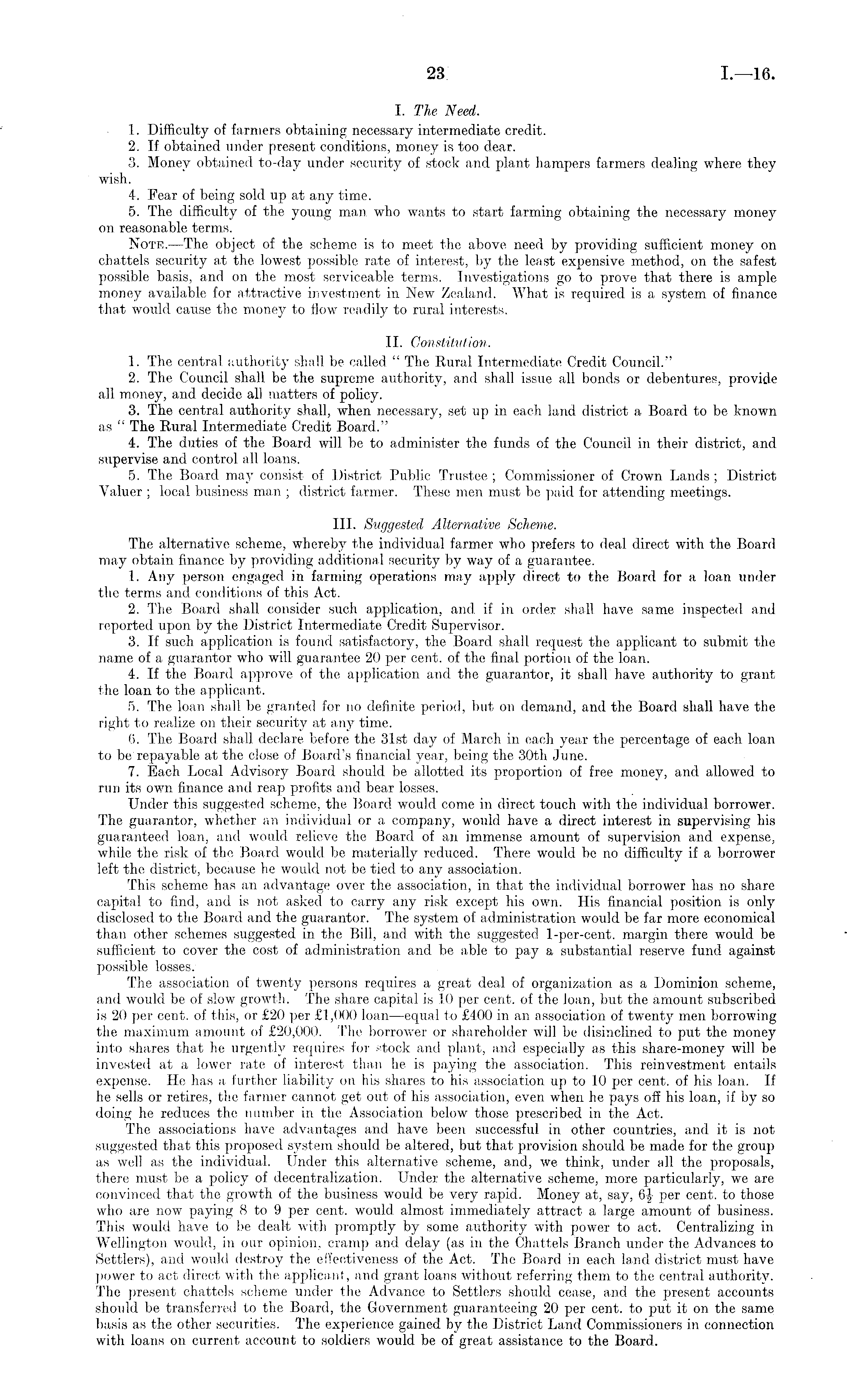 I. The Need. 1. Difficulty of farmers obtaining necessary intermediate credit. 2. If obtained under present conditions, money is too dear. 3. Money obtained to-day under security of stock and plant hampers farmers dealing where they wish. 4. Fear of being sold up at any time. 5. The difficulty of the young man who wants to start farming obtaining the necessary money on reasonable terms. Note. —The object of the scheme is to meet the above need by providing sufficient money on chattels security at the lowest possible rate of interest, by the least expensive method, on the safest possible basis, and on the most serviceable terms. Investigations go to prove that there is ample money available for attractive investment in New Zealand. What is required is a system of finance that would cause the money to flow readily to rural interests. 11. Constitution. 1. The central authority shall be called " The Rural Intermediate Credit Council." 2. The Council shall be the supreme authority, and shall issue all bonds or debentures, provide all money, and decide all matters of policy. 3. The central authority shall, when necessary, set up in each land district a Board to be known as " The Rural Intermediate Credit Board." 4. The duties of the Board will be to administer the funds of the Council in their district, and supervise and control all loans. 5. The Board may consist of District Public Trustee ; Commissioner of Crown Lands ; District Valuer ; local business man ; district farmer. These men must be paid for attending meetings. 111. Suggested Alternative Scheme. The alternative scheme, whereby the individual farmer who prefers to deal direct with the Board may obtain finance by providing additional security by way of a guarantee. 1. Any person engaged in farming operations may apply direct to the Board for a loan under the terms and conditions of this Act. 2. The Board shall consider such application, and if in order shall have same inspected and reported upon by the District Intermediate Credit Supervisor. 3. If such application is found satisfactory, the Board shall request the applicant to submit the name of a guarantor who will guarantee 20 per cent, of the final portion of the loan. 4. If the Board approve of the application and the guarantor, it shall have authority to grant the loan to the applicant. 5. The loan shall be granted for no definite period, but on demand, and the Board shall have the right to realize on their security at any time. 6. The Board shall declare before the 31st day of March in each year the percentage of each loan to be repayable at the close of Board's financial year, being the 30th June. 7. Each Local Advisory Board should be allotted its proportion of free money, and allowed to run its own finance and reap profits and bear losses. Under this suggested scheme, the Board would come in direct touch with the individual borrower. The guarantor, whether an individual or a company, would have a direct interest in supervising his guaranteed loan, and would relieve the Board of an immense amount of supervision and expense, while the risk of the Board would be materially reduced. There would be no difficulty if a borrower left the district, because he would not be tied to any association. This scheme has an advantage over the association, in that the individual borrower has no share capital to find, and is not asked to carry any risk except his own. His financial position is only disclosed to the Board and the guarantor. The system of administration would be far more economical than other schemes suggested in the Bill, and with the suggested 1-per-cent. margin there would be sufficient to cover the cost of administration and be able to pay a substantial reserve fund against possible losses. The association of twenty persons requires a great deal of organization as a Dominion scheme, and would be of slow growth. The share capital is 10 per cent, of the loan, but the amount subscribed is 20 per cent, of this, or £20 per £1,000 loan —equal to £400 in an association of twenty men borrowing the maximum amount of £20,000. The borrower or shareholder will be disinclined to put the money into shares that he urgently requires for *tock and plant, and especially as this share-money will be invested at a lower rate of interest than he is paying the association. This reinvestment entails expense. He has a further liability on his shares to his association up to 10 per cent, of his loan. If he sells or retires, the farmer cannot get out of his association, even when he pays off his loan, if by so doing he reduces the number in the Association below those prescribed in the Act. The associations have advantages and have been successful in other countries, and it is not suggested that this proposed system should be altered, but that provision should be made for the group as well as the individual. Under this alternative scheme, and, we think, under all the proposals, there must be a policy of decentralization. Under the alternative scheme, more particularly, we are convinced that the growth of the business would be very rapid. Money at, say, 6f per cent, to those who are now paying 8 to 9 per cent, would almost immediately attract a large amount of business. This would have to be dealt with promptly by some authority with power to act. Centralizing in Wellington would, in our opinion, cramp and delay (as in the Chattels Branch under the Advances to Settlers), and would destroy the effectiveness of the Act. The Board in each land district must have power to act direct with the applicant, and grant loans without referring them to the central authority. The present chattels scheme under the Advance to Settlers should cease, and the present accounts should be transferred to the Board, the Government guaranteeing 20 per cent, to put it on the same basis as the other securities. The experience gained by the District Land Commissioners in connection with loans on current account to soldier