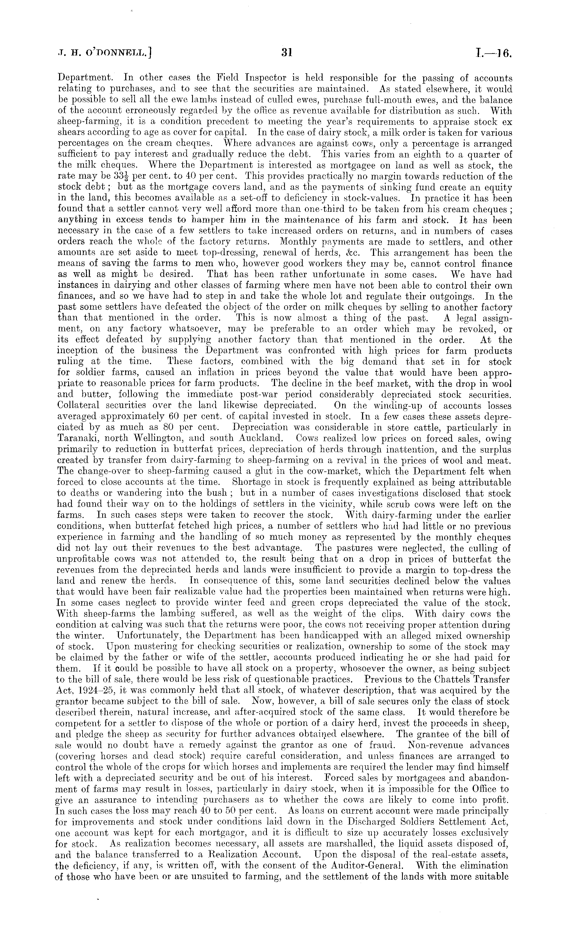 Department. In other cases the Field Inspector is held responsible for the passing of accounts relating to purchases, and to see that the securities are maintained. As stated elsewhere, it would be possible to sell all the ewe lambs instead of culled ewes, purchase full-mouth ewes, and the balance of the account erroneously regarded by the office as revenue available for distribution as such. With slieep-farming, it is a condition precedent to meeting the year's requirements to appraise stock ex shears according to age as cover for capital. In the case of dairy stock, a milk order is taken for various percentages on the cream cheques. Where advances are against cows, only a percentage is arranged sufficient to pay interest and gradually reduce the debt. This varies from an eighth to a quarter of the milk cheques. Where the Department is interested as mortgagee on land as well as stock, the rate may be 33| per cent, to 40 per cent. This provides practically no margin towards reduction of the stock debt; but as the mortgage covers land, and as the payments of sinking fund create an equity in the land, this becomes available as a set-off to deficiency in stock-values. In practice it has been found that a settler cannot very well afford more than one-third to be taken from his cream cheques ; anything in excess tends to hamper him in the maintenance of his farm and stock. It has been necessary in the case of a few settlers to take increased orders on returns, and in numbers of cases orders reach the whole of the factory returns. Monthly payments are made to settlers, and other amounts are set aside to meet top-dressing, renewal of herds, &c. This arrangement has been the means of saving the farms to men who, however good workers they may be, cannot control finance as well as might be desired. That has been rather unfortunate in some cases. We have had instances in dairying and other classes of farming where men have not been able to control their own finances, and so we have had to step in and take the whole lot and regulate their outgoings. In the past some settlers have defeated the object of the order on milk cheques by selling to another factory than that mentioned in the order. This is now almost a thing of the past. A legal assignment, on any factory whatsoever, may be preferable to an order which may be revoked, or its effect defeated by supplying another factory than that mentioned in the order. At the inception of the business the Department was confronted with high prices for farm products ruling at the time. These factors, combined with the big demand that set in for stock for soldier farms, caused an inflation in prices beyond the value that would have been appropriate to reasonable prices for farm products. The decline in the beef market, with the drop in wool and butter, following the immediate post-war period considerably depreciated stock securities. Collateral securities over the land likewise depreciated. On the winding-up of accounts losses averaged approximately 60 per cent, of capital invested in stock. In a few cases these assets depreciated by as much as 80 per cent. Depreciation was considerable in store cattle, particularly in Taranaki, north Wellington, and south Auckland. Cows realized low prices on forced sales, owing primarily to reduction in butterfat prices, depreciation of herds through inattention, and the surplus created by transfer from dairy-farming to sheep-farming on a revival in the prices of wool and meat. The change-over to sheep-farming caused a glut in the cow-market, which the Department felt when forced to close accounts at the time. Shortage in stock is frequently explained as being attributable to deaths or wandering into the bush ; but in a number of cases investigations disclosed that stock had found their way on to the holdings of settlers in the vicinity, while scrub cows were left on the farms. In such cases steps were taken to recover the stock. With dairy-farming under the earlier conditions, when butterfat fetched high prices, a number of settlers who had had little or no previous experience in farming and the handling of so much money as represented by the monthly cheques did not lay out their revenues to the best advantage. The pastures were neglected, the culling of unprofitable cows was not attended to, the result being that on a drop in prices of butterfat the revenues from the depreciated herds and lands were insufficient to provide a margin to top-dress the land and renew the herds. In consequence of this, some land securities declined below the values that would have been fair realizable value had the properties been maintained when returns were high. In some cases neglect to provide winter feed and green crops depreciated the value of the stock. With sheep-farms the lambing suffered, as well as the weight of the clips. With dairy cows the condition at calving was such that the returns were poor, the cows not receiving proper attention during the winter. Unfortunately, the Department has been handicapped with an alleged mixed ownership of stock. Upon mustering for checking securities or realization, ownership to some of the stock may be claimed by the father or wife of the settler, accounts produced indicating he or she had paid for them. If it could be possible to have all stock on a property, whosoever the owner, as being subject to the bill of sale, there would be less risk of questionable practices. Previous to the Chattels Transfer Act, 1924-25, it was commonly held that all stock, of whatever description, that was acquired by the grantor became subject to the bill of sale. Now, however, a bill of sale secures only the class of stock described therein, natural increase, and after-acquired stock of the same class. It would therefore be competent for a settler to dispose of the whole or portion of a dairy herd, invest the proceeds in sheep, and pledge the sheep as security for further advances obtained elsewhere. The grantee o