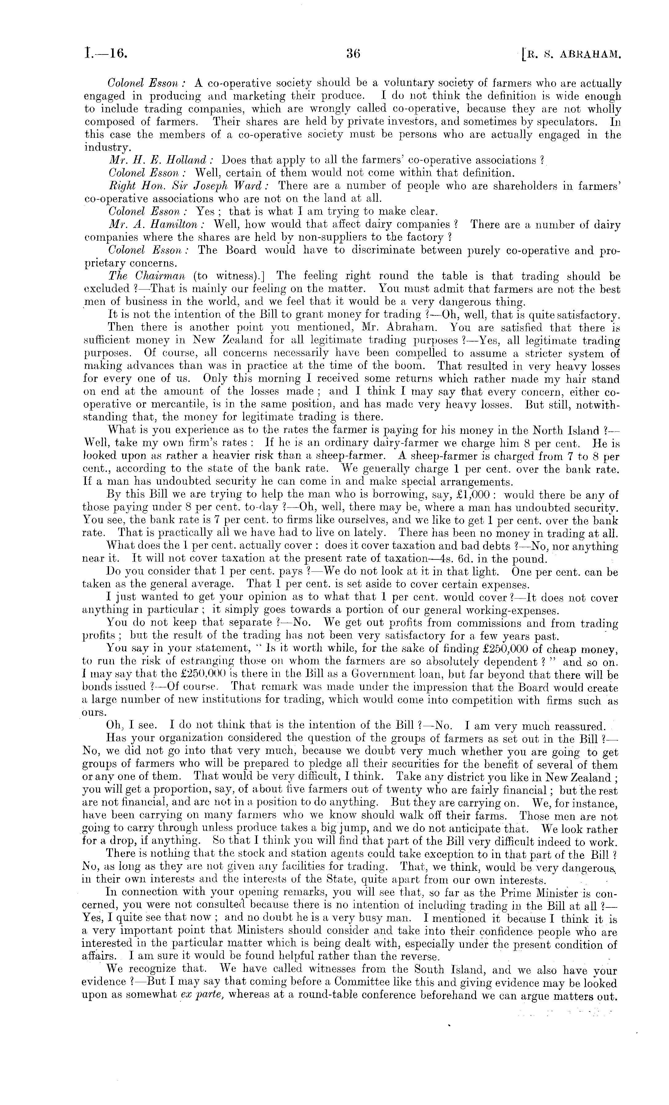 Colonel Esson : A co-operative society should be a voluntary society of farmers who are actually engaged in producing and marketing their produce. Ido not think the definition is wide enough to include trading companies, which are wrongly called co-operative, because they are not wholly composed of farmers. Their shares are held by private investors, and sometimes by speculators. In this case the members of a co-operative society must be persons who are actually engaged in the industry. Mr. H. E. Holland : Does that apply to all the farmers' co-operative associations ? Colonel Esson : Well, certain of them would not come within that definition. Bight Hon. Sir Joseph Ward : There are a number of people who are shareholders in farmers' co-operative associations who are not on the land at all. Colonel Esson : Yes ; that is what I am trying to make clear. Mr. A. Hamilton : Well, how would that affect dairy companies ? There are a number of dairy companies where the shares are held by non-suppliers to the factory ? Colonel Esson : The Board would have to discriminate between purely co-operative and proprietary concerns. The Chairman (to witness).] The feeling right round the table is that trading should be excluded ? —That is mainly our feeling on the matter. You must admit that farmers are not the best men of business in the world, and we feel that it would be a very dangerous thing. It is not the intention of the Bill to grant money for trading ? —Oh, well, that is quite satisfactory. Then there is another point you mentioned, Mr. Abraham. You are satisfied that there is sufficient money in New Zealand for all legitimate trading purposes ? —Yes, all legitimate trading purposes. Of course, all concerns necessarily have been compelled to assume a stricter system of making advances than was in practice at the time of the boom. That resulted in very heavy losses for every one of us. Only this morning I received some returns which rather made my hair stand on end at the amount of the losses made ; and I think I may say that every concern, either cooperative or mercantile, is in the same position, and has made very heavy losses. But still, notwithstanding that, the money for legitimate trading is there. What is you experience as to the rates the farmer is paying for his money in the North Island ?— Well, take my own firm's rates : If he is an ordinary dairy-farmer we charge him 8 per cent. He is looked upon as rather a heavier risk than a sheep-farmer. A sheep-farmer is charged from 7to 8 per cent., according to the state of the bank rate. We generally charge 1 per cent, over the bank rate. If a man has undoubted security he can come in and make special arrangements. By this Bill we are trying to help the man who is borrowing, say, £1,000 : would there be any of those paying under 8 per cent, to-day ? —Oh, well, there may be, where a man has undoubted security. You see, the bank rate is 7 per cent, to firms like ourselves, and we like to get 1 per cent, over the bank rate. That is practically all we have had to live on lately. There has been no money in trading at all. What does the 1 per cent, actually cover : does it cover taxation and bad debts ?—No, nor anything near it. It will not cover taxation at the present rate of taxation —4s. 6d. in the pound. Do you consider that 1 per cent, pays ? —We do not look at it in that light. One per cent, can be taken as the general average. That 1 per cent, is set aside to cover certain expenses. I just wanted to get your opinion as to what that 1 per cent, would cover ? —lt does not cover anything in particular ; it simply goes towards a portion of our general working-expenses. You do not keep that separate ?—No. We get out profits from commissions and from trading profits ; but the result of the trading has not been very satisfactory for a few years past. You say in your statement, " Is it worth while, for the sake of finding £250,000 of cheap money, to run the risk of estranging those on whom the farmers are so absolutely dependent ? " and so on. I may say that the £250,000 is there in the Bill as a Government loan, but far beyond that there will be bonds issued ?—Of course. That remark was made under the impression that the Board would create a large number of new institutions for trading, which would come into competition with firms such as ours. Oh, I see. Ido not think that is the intention of the Bill ? —No. lam very much reassured. Has your organization considered the question of the groups of farmers as set out in the Bill ? — No, we did not go into that very much, because we doubt very much whether you are going to get groups of farmers who will be prepared to pledge all their securities for the benefit of several of them or any one of them. That would be very difficult, I think. Take any district you like in New Zealand ; you will get a proportion, say, of about five farmers out of twenty who are fairly financial; but the rest are not financial, and are not in a position to do anything. But they are carrying on. We, for instance, have been carrying on many farmers who we know should walk off their farms. Those men are not going to carry through unless produce takes a big jump, and we do not anticipate that. We look rather for a drop, if anything. So that I think you will find that part of the Bill very difficult indeed to work. There is nothing that the stock and station agents could take exception to in that part of the Bill ? No, as long as they are not given any facilities for trading. That, we think, would be very dangerous, in their own interests and the interests of the State, quite apart from our own interests. In connection with your opening remarks, you will see that, so far as the Prime Minister is concerned, you were not consulted because there is no intention of including trading in the Bill at all ? — Yes, I quite see that now ; and no doubt he is a very busy man. I mentioned it because I think it is 