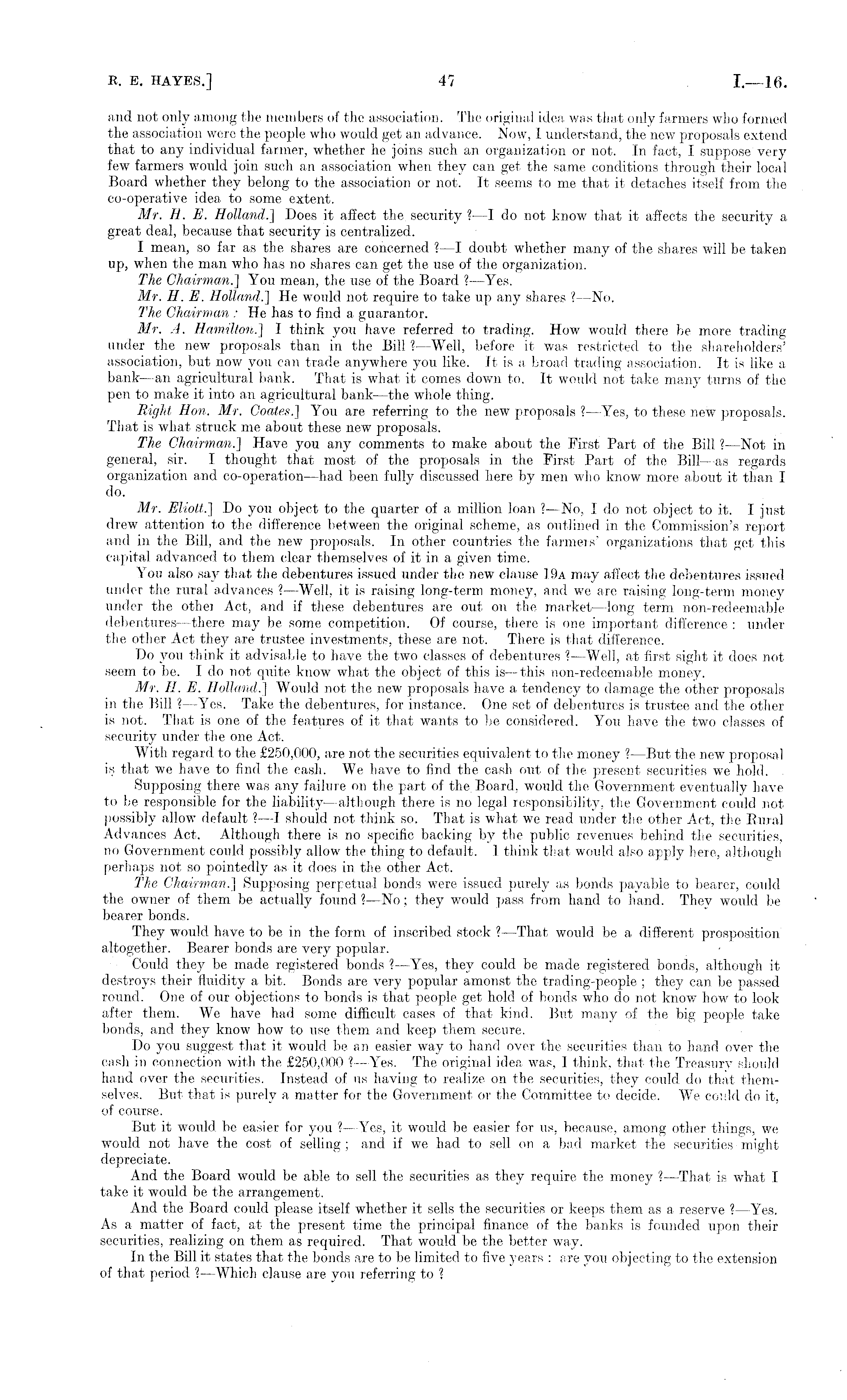 and not only among the members of the association. The original idea was that only farmers who formed the association were the people who would get an advance. Now, I understand, the new proposals extend that to any individual farmer, whether he joins such an organization or not. In fact, I suppose very few farmers would join such an association when they can get the same conditions through their local Board whether they belong to the association or not. It seems to me that it detaches itself from the co-operative idea to some extent. Mr. 11. E. Holland.] Does it affect the security ?—I do not know that it affects the security a great deal, because that security is centralized. I mean, so far as the shares are concerned ? —I doubt whether many of the shares will be taken up, when the man who has no shares can get the use of the organization. The Chairman.\ You mean, the use of the Board ? —Yes. Mr. H. E. Holland.] He would not require to take up any shares ?—No. The Chairman : He has to find a guarantor. Mr. A. Hamilton.'] I think you have referred to trading. How would there be more trading under the new proposals than in the Bill ? —Well, before it was restricted to the shareholders' association, but now you can trade anywhere you like. It is a broad trading association. It is like a bank—an agricultural bank. That is what it comes down to. It would not take many turns of the pen to make it into an agricultural bank —the whole thing. Right Hon. Mr. Coates.] You are referring to the new proposals ?—Yes, to these new proposals. That is what struck me about these new proposals. The Chairman.] Have you any comments to make about the First Part of the Bill ? —Not in general, sir. I thought that most of the proposals in the First Part of the Bill—as regards organization and co-operation —had been fully discussed here by men who know more about it than I do. Mr. Eliott.] Do you object to the quarter of a million loan ? —No, Ido not object to it. I just drew attention to the difference between the original scheme, as outlined in the Commission's report and in the Bill, and the new proposals. In other countries the farmers' organizations that get this capital advanced to them clear themselves of it in a given time. You also say that the debentures issued under the new clause ]9a may affect the debentures issued under the rural advances ? —Well, it is raising long-term money, and we are raising long-term money under the othei Act, and if these debentures are out on the market—long term non-redeemable debentures—there may be some competition. Of course, there is one important difference : under the other Act they are trustee investments, these are not. There is that difference. Do you think it advisable to have the two classes of debentures ?- Well, at first sight it does not seem to be. Ido not quite know what the object of this is—this non-redeemable money. Mr. 11. E. Holland.] Would not the new proposals have a tendency to damage the other proposals in the Bill ?—Yes. Take the debentures, for instance. One set of debentures is trustee and the other is not. That is one of the features of it that wants to be considered. You have the two classes of security under the one Act. With regard to the £250,000, are not the securities equivalent to the money ? —But the new proposal is that we have to find the cash. We have to find the cash out of the present securities we hold. Supposing there was any failure on the part of the Board, would the Government eventually have to be responsible for the liability —although there is 110 legal responsibility, the Government could not possibly allow default ?—I should not think so. That is what we read under the other Act, the Rural Advances Act. Although there is no specific backing by the public revenues behind the securities, no Government could possibly allow the thing to default. I think that would also apply here, although perhaps not so pointedly as it does in the other Act. The Chairman.] Supposing perpetual bonds were issued purely as bonds payable to bearer, could the owner of them be actually found ?—No; they would pass from hand to hand. They would be bearer bonds. They would have to be in the form of inscribed stock ? —That would be a different prosposition altogether. Bearer bonds are very popular. Could they be made registered bonds ? —Yes, they could be made registered bonds, although it destroys their fluidity a bit. Bonds are very popular amonst the trading-people ; they can be passed round. One of our objections to bonds is that people get hold of bonds who do not know how to look after them. We have had some difficult cases of that kind. But many of the big people take bonds, and they know how to use them and keep them secure. Do you suggest that it would be an easier way to hand over the securities than to hand over the cash in connection with the £250,000 ?—Yes. The original idea was, 1 think, that the Treasury should hand over the securities. Instead of us having to realize on the securities, they could do that themselves. But that is purely a matter for the Government or the Committee to decide. We could do it, of course. But it would be easier for you ? —Yes, it would be easier for us, because, among other things, we would not have the cost of selling ; and if we had to sell on a bad market the securities might depreciate. And the Board would be able to sell the securities as they require the money ?—That is what I take it would be the arrangement. And the Board could please itself whether it sells the securities or keeps them as a, reserve ?—Yes. As a matter of fact, at the present time the principal finance of the banks is founded upon their securities, realizing on them as required. That would be the better way. In the Bill it states that the bonds are to be limited to five years : are you objecting to the extension of that period ? —Which clause are you referring to ?