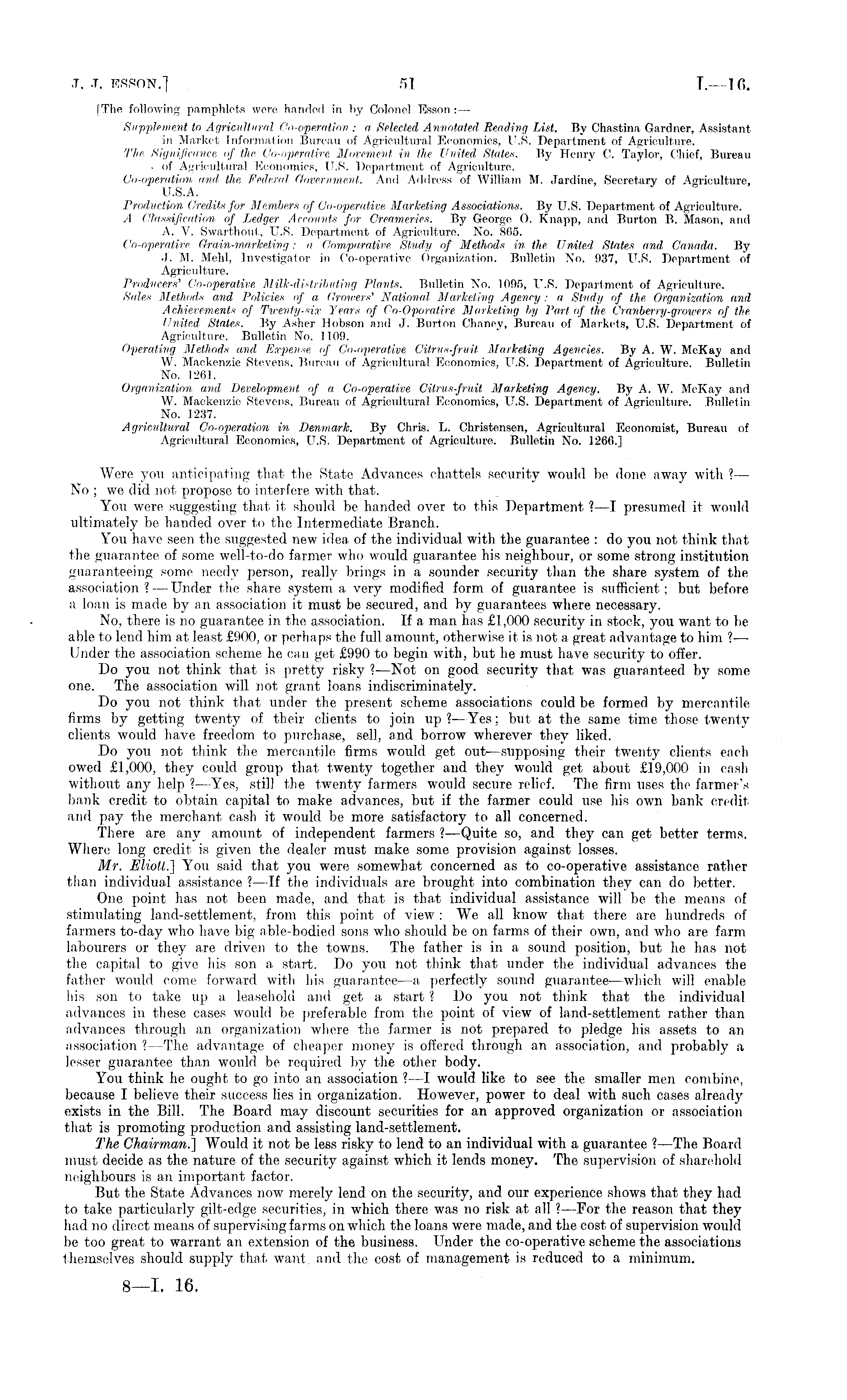 [The following pamphlets were handed in by Colonel Esson : — Supplement to Agricultural Co-operation : a Selected Annotated Reading List. By Chastina Gardner, Assistant in Market Information Bureau of Agricultural Economics, U.S. Department of Agriculture. The Significance of the Co-operative Movement in the United States. By Henry C. Taylor, Chief, Bureau ■ of Agricultural Economics, U.S. Department of Agriculture. Co-operation and the Federal Government. And Address of William M. Jardine, Secretary of Agriculture, U.S.A. Production Credits for Members of Co-operative Marketing Associations. By U.S. Department of Agriculture. A Classification of Ledger Accounts for Creameries. By George 0. Knapp, and Burton B. Mason, and A. V. Swarthout, U.S. Department of Agriculture. No. 865. Co-operative Grain-marketing: a Comparative Study of Methods in the United States and Canada. By •J. M. Mehl, Investigator in Co-operative Organization. Bulletin No. 937, U.S. Department of Agriculture. Producers' Co-operative Milk-distributing Plants. Bulletin No. 1095, U.S. Department of Agriculture. Sales Methods and Policies of a Growers' National Marketing Agency: a Study of the Organization and Achievements of Twenty-six Years of Co-Oporative Marketing by Part of the Cranberry-growers of the United States. By Asher Hobson and J. Burton Chaney, Bureau of Markets, U.S. Department of Agriculture. Bulletin No. 1109. Operating Methods and Expense of Go-operative Citrus-fruit Marketing Agencies. By A. W. McKay and W. Mackenzie Stevens, Bureau of Agricultural Economics, U.S. Department of Agriculture. Bulletin No. 1261. Organization and Development of a Co-operative Citrus-fruit Marketing Agency. By A. W. McKay and W. Mackenzie Stevens, Bureau of Agricultural Economics, U.S. Department of Agriculture. Bulletin No. 1237. Agricultural Co-operation in Denmark. By Chris. L. Christensen, Agricultural Economist, Bureau of Agricultural Economics, U.S. Department of Agriculture. Bulletin No. 1266.] Were you anticipating that the State Advances chattels security would be done away with ?— No ; we did not propose to interfere with that. You were suggesting that it should be handed over to this Department ? —I presumed it would ultimately be handed over to the Intermediate Branch. You have seen the suggested new idea of the individual with the guarantee : do you not think that the guarantee of some well-to-do farmer who would guarantee his neighbour, or some strong institution guaranteeing some needy person, really brings in a sounder security than the share system of the association? — Under the share system a very modified form of guarantee is sufficient; but before a loan is made by an association it must be secured, and by guarantees where necessary. No, there is no guarantee in the association. If a man has £1,000 security in stock, you want to lie able to lend him at least £900, or perhaps the full amount, otherwise it is not a great advantage to him ?— Under the association scheme he can get £990 to begin with, but he must have security to offer. Do you not think that is pretty risky ? —Not on good security that was guaranteed by some one. The association will not grant loans indiscriminately. Do you not think that under the present scheme associations could be formed by mercantile firms by getting twenty of their clients to join up?— Yes; but at the same time those twenty clients would have freedom to purchase, sell, and borrow wherever they liked. Do you not think the mercantile firms would get out —supposing their twenty clients each owed £1,000, they could group that twenty together and they would get about £19,000 in cash without any help ? —Yes, still the twenty farmers would secure relief. The firm uses the farmer's bank credit to obtain capital to make advances, but if the farmer could use his own bank credit and pay the merchant cash it would be more satisfactory to all concerned. There are any amount of independent farmers ? —Quite so, and they can get better terms. Where long credit is given the dealer must make some provision against losses. Mr. Eliott.] You said that you were somewhat concerned as to co-operative assistance rather than individual assistance ? —lf the individuals are brought into combination they can do better. One point has not been made, and that is that individual assistance will be the means of stimulating land-settlement, from this point of view : We all know that there are hundreds of farmers to-day who have big able-bodied sons who should be on farms of their own, and who are farm labourers or they are driven to the towns. The father is in a sound position, but he has not the capital to give his son a start. Do you hot think that under the individual advances the father would come forward with his guarantee —a perfectly sound guarantee- —which will enable his son to take up a leasehold and get a start ? Do you not think that the individual advances in these cases would be preferable from the point of view of land-settlement rather than advances through an organization where the farmer is not prepared to pledge his assets to an association ? —The advantage of cheaper money is offered through an association, and probably a lesser guarantee than would be required by the other body. You think he ought to go into an association ? —I would like to see the smaller men combine, because I believe their success lies in organization. However, power to deal with such cases already exists in the Bill. The Board may discount securities for an approved organization or association that is promoting production and assisting land-settlement. The Chairman.] Would it not be less risky to lend to an individual with a guarantee ?—The Board must decide as the nature of the security against which it lends money. The supervision of sharehold neighbours is an important factor. But the State Advances now merely lend on the security, and our experience shows that they h