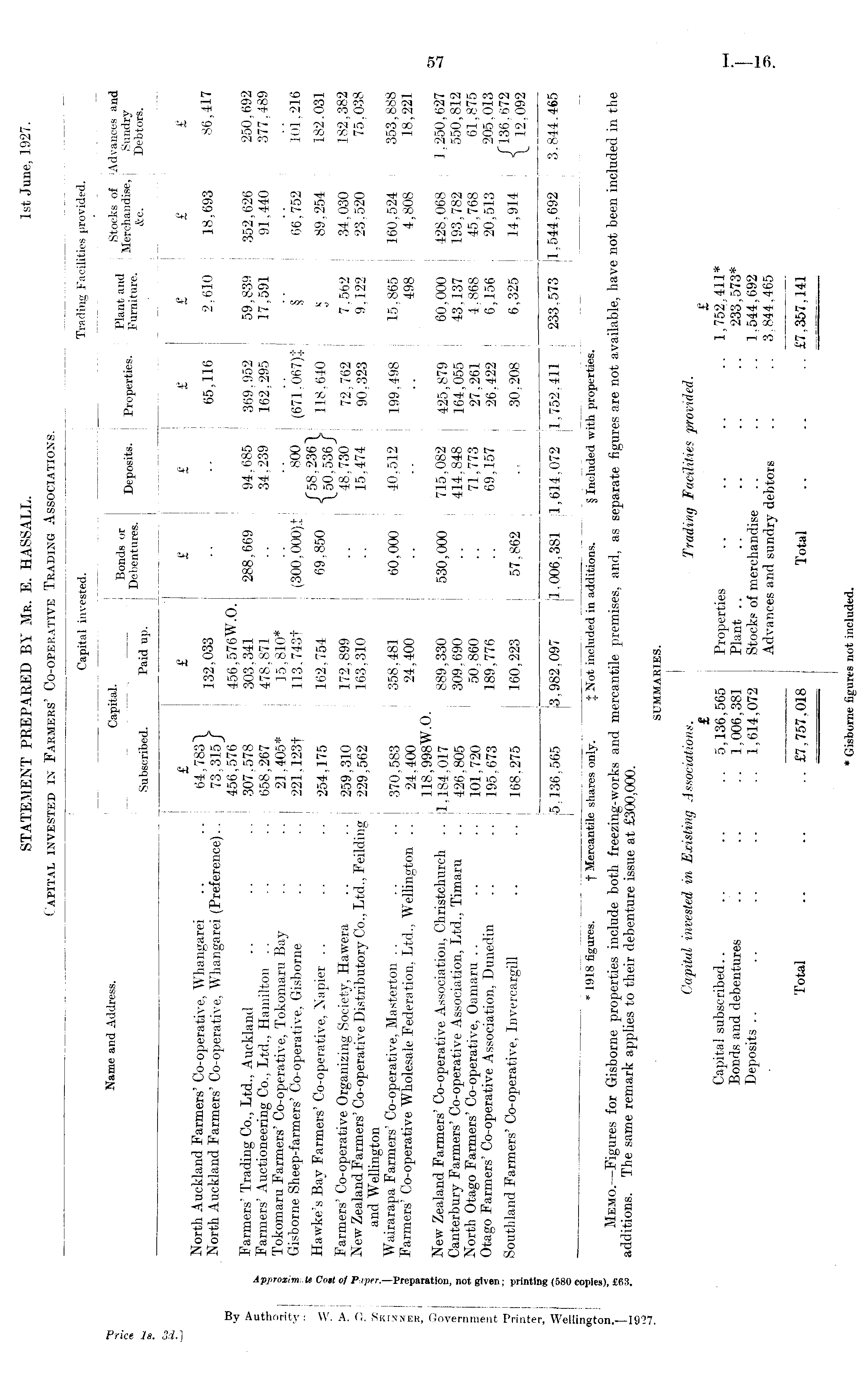STATEMENT PREPARED BY Mr. E. HASSALL. 1st June, 1927. Capital invested in Farmers' Co-operative Trading Associations.
