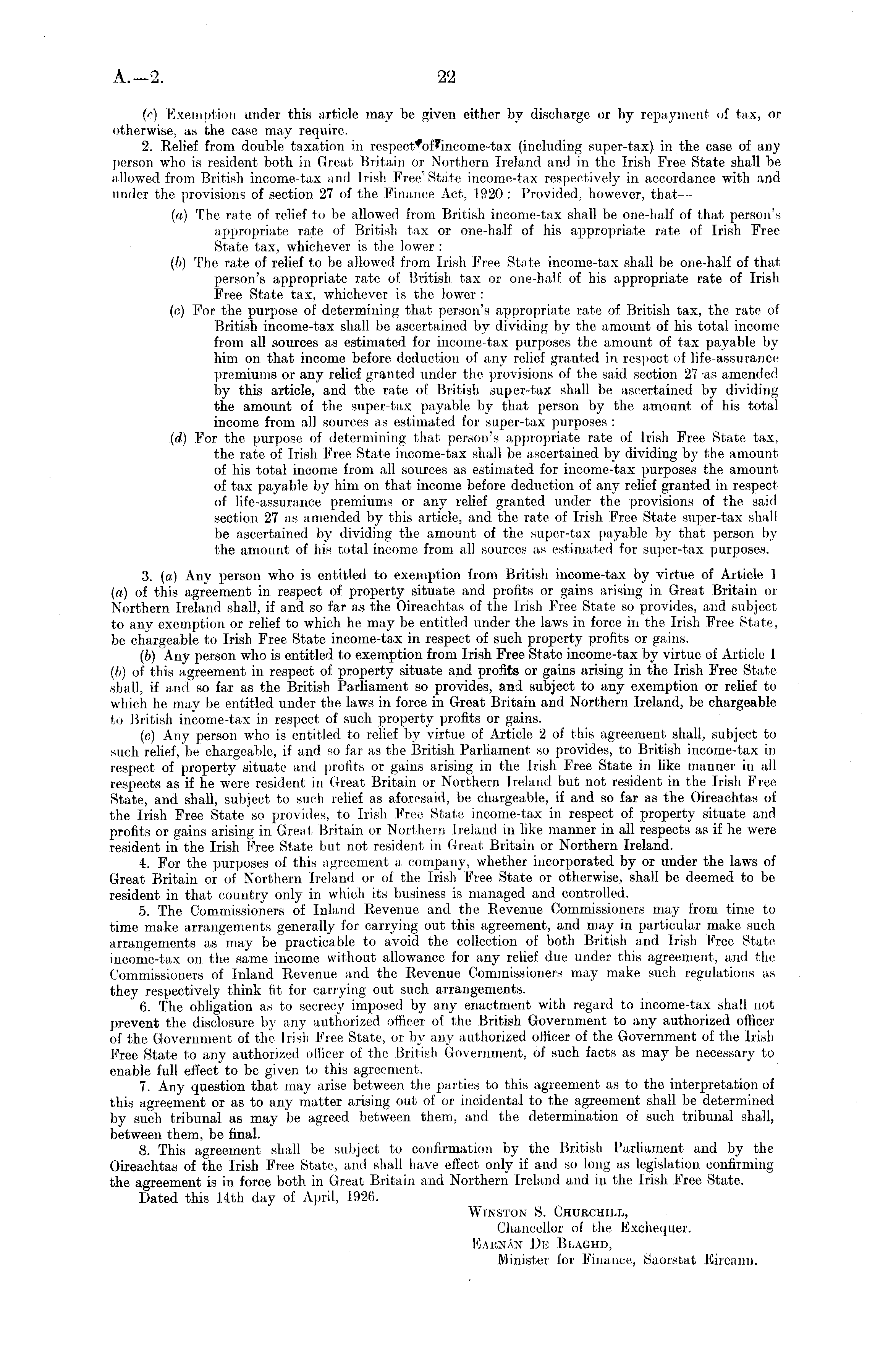 (c) Exemption under this article may be given either by discharge or by repayment of tax, or otherwise, as the case may require. 2. Relief from double taxation in respect # of?income-tax (including super-tax) in the case of any person who is resident both in Great Britain or Northern Ireland and in the Irish Free State shall be allowed from British income-tax and Irish Free 1 State income-tax respectively in accordance with and under the provisions of section 27 of the Finance Act, 1920 : Provided, however, that— (a) The rate of relief to be allowed from British income-tax shall be one-half of that person's appropriate rate of British tax or one-half of his appropriate rate of Irish Free State tax, whichever is the lower : (b) The rate of relief to be allowed from Irish Free State income-tax shall be one-half of that person's appropriate rate of British tax or one-half of his appropriate rate of Irish Free State tax, whichever is the lower : (c) For the purpose of determining that person's appropriate rate of British tax, the rate of British income-tax shall be ascertained by dividing by the amount of his total income from all sources as estimated for income-tax purposes the amount of tax payable by him on that income before deduction of any relief granted in respect of life-assurance premiums or any relief granted under the provisions of the said section 27 'as amended by this article, and the rate of British super-tax shall be ascertained by dividing the amount of the super-tax payable by that person by the amount of his total income from all sources as estimated for super-tax purposes : (d) For the purpose of determining that person's appropriate rate of Irish Free State tax, the rate of Irish Free State income-tax shall be ascertained by dividing by the amount of his total income from all sources as estimated for income-tax purposes the amount of tax payable by him on that income before deduction of any relief granted in respect of life-assurance premiums or any relief granted under the provisions of the said section 27 as amended by this article, and the rate of Irish Free State super-tax shall be ascertained by dividing the amount of the super-tax payable by that person by the amount of his total income from all sources as estimated for super-tax purposes. 3. (a) Any person who is entitled to exemption from British income-tax by virtue of Article 1 (a) of this agreement in respect of property situate and profits or gains arising in Great Britain or Northern Ireland shall, if and so far as the Oireachtas of the Irish Free State so provides, and subject to any exemption or relief to which he may be entitled under the laws in force in the Irish Free State, be chargeable to Irish Free State income-tax in respect of such property profits or gains. (b) Any person who is entitled to exemption from Irish Free State income-tax by virtue of Article I (b) of this agreement in respect of property situate and profits or gains arising in the Irish Free State shall, if and so far as the British Parliament so provides, and subject to any exemption or relief to which he may be entitled under the laws in force in Great Britain and Northern Ireland, be chargeable to British income-tax in respect of such property profits or gains. (c) Any person who is entitled to relief by virtue of Article 2 of this agreement shall, subject to such relief, be chargeable, if and so far as the British Parliament so provides, to British income-tax in respect of property situate and profits or gains arising in the Irish Free State in like manner in all respects as if he were resident in Great Britain or Northern Ireland but not resident in the Irish Free State, and shall, subject to such relief as aforesaid, be chargeable, if and so far as the Oireachtas of the Irish Free State so provides, to Irish Free State income-tax in respect of property situate and profits or gains arising in Great Britain or Northern Ireland in like manner in all respects as if he were resident in the Irish Free State but not resident in Great Britain or Northern Ireland. 4. For the purposes of this agreement a company, whether incorporated by or under the laws of Great Britain or of Northern Ireland or of the Irish Free State or otherwise, shall be deemed to be resident in that country only in which its business is managed and controlled. 5. The Commissioners of Inland Revenue and the Revenue Commissioners may from time to time make arrangements generally for carrying out this agreement, and may in particular make such arrangements as may be practicable to avoid the collection of both British and Irish Free State income-tax on the same income without allowance for any relief due under this agreement-, and the Commissioners of Inland Revenue and the Revenue Commissioners may make such regulations as they respectively think fit for carrying out such arrangements. 6. The obligation as to secrecy imposed by any enactment with regard to income-tax shall not prevent the disclosure by any authorized officer of the British Government to any authorized officer of the Government of the Irish Free State, or by any authorized officer of the Government of the Irish Free State to any authorized officer of the British Government, of such facts as may be necessary to enable full effect to be given to this agreement. 7. Any question that may arise between the parties to this agreement as to the interpretation of this agreement or as to any matter arising out of or incidental to the agreement shall be determined by such tribunal as may be agreed between them, and the determination of such tribunal shall, between them, be final. 8. This agreement shall be subject to confirmation by the British Parliament and by the Oireachtas of the Irish Free State, and shall have effect only if and so long as legislation confirming the agreement is in force both in Great Britain and Northern Ireland and in the Irish Free State. Dated this 14th day of April, 1926. Winston S. C