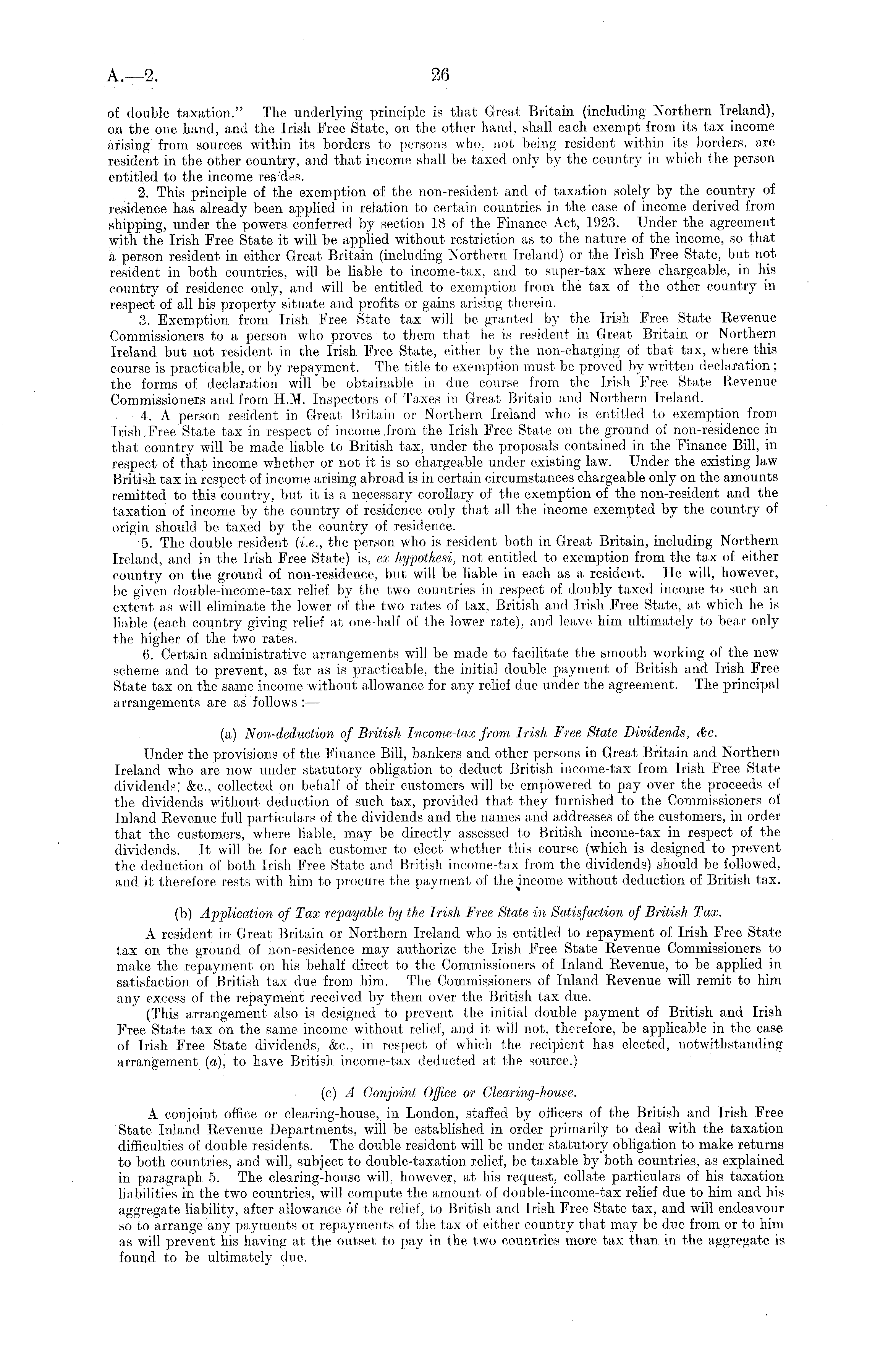 of double taxation." The underlying principle is that Great Britain (including Northern Ireland), on the one hand, and the Irish Free State, on the other hand, shall each exempt from its tax income arising from sources within its borders to persons who. not being resident within its borders, are resident in the other country, and that income shall be taxed only by the country in which the person entitled to the income res des. 2. This principle of the exemption of the non-resident and of taxation solely by the country of residence has already been applied in relation to certain countries in the case of income derived from shipping, under the powers conferred by section 18 of the Finance Act, 1923. Under the agreement with the Irish Free State it will be applied without restriction as to the nature of the income, so that a person resident in either Great Britain (including Northern Ireland) or the Irish. Free State, but not resident in both countries, will be liable to income-tax, and to super-tax where chargeable, in his country of residence only, and will be entitled to exemption from the tax of the other country in respect of all his property situate and profits or gains arising therein. 3. Exemption from Irish Free State tax will be granted by the Irish Free State Revenue Commissioners to a person who proves to them that he is resident in Great Britain or Northern Ireland but not resident in the Irish Free State, either by the non-charging of that tax, where this course is practicable, or by repayment. The title to exemption must be proved by written declaration ; the forms of declaration will be obtainable in due course from the Irish Free State Revenue Commissioners and from H.M. Inspectors of Taxes in Great Britain and Northern Ireland. 4. A person resident in Great Britain or Northern Ireland who is entitled to exemption from Tmh.Free State tax in respect of income .from the Irish Free State on the ground of non-residence in that country will be made liable to British tax, under the proposals contained in the Finance Bill, in respect of that income whether or not it is so chargeable under existing law. Under the existing law British tax in respect of income arising abroad is in certain circumstances chargeable only on the amounts remitted to this country, but it is a necessary corollary of the exemption of the non-resident and the taxation of income by the country of residence only that all the income exempted by the country of origin should be taxed by the country of residence. 5. The double resident (i.e., the person who is resident both in Great Britain, including Northern Ireland, and in the Irish Free State) is, ex hypothesi, not entitled to exemption from the tax of either country on the ground of non-residence, but will be liable in each as a resident. He will, however, be given double-income-tax relief by the two countries in respect of doubly taxed income to such an extent, as will eliminate the lower of the two rates of tax, British and Irish Free State, at which he is liable (each country giving relief at one-half of the lower rate), and leave him ultimately to bear only the higher of the two rates. 6. Certain administrative arrangements will be made to facilitate the smooth working of the new scheme and to prevent, as far as is practicable, the initial double payment of British and Irish Free State tax on the same income without allowance for any relief due under the agreement. The principal arrangements are as follows : — (a) Non-deduction of British Income-tax from Irish Free State Dividends, &c. Under the provisions of the Finance Bill, bankers and other persons in Great Britain and Northern Ireland who are now under statutory obligation to deduct British income-tax from Irish Free State dividends; &c., collected on behalf of their customers will be empowered to pay over the proceeds of the dividends without deduction of such tax, provided that they furnished to the Commissioners of Inland Revenue full particulars of the dividends and the names, and addresses of the customers, in order that the customers, where liable, may be directly assessed to British income-tax in respect of the dividends. It will be for each customer to elect whether this course (which is designed to prevent the deduction of both Irish Free State and British income-tax from the dividends) should be followed, and it therefore rests with him to procure the payment of the income without deduction of British tax. (b) Application of Tax repayable by the Irish Free State in Satisfaction of British Tax. A resident in Great Britain or Northern Ireland who is entitled to repayment of Irish Free State tax on the ground of non-sesidence may authorize the Irish Free State Revenue Commissioners to make the repayment on his behalf direct to the Commissioners of Inland Revenue, to be applied in satisfaction of British tax due from him. The Commissioners of Inland Revenue will remit to him any excess of the repayment received by them over the British tax due. (This arrangement also is designed to prevent the initial double payment of British and Irish Free State tax on the same income without relief, and it will not, therefore, be applicable in the case of Irish Free State dividends, &c., in respect of which the recipient has elected, notwithstanding arrangement (a), to have British income-tax deducted at the source.) (c) A Conjoint Office or Clearing-house. A conjoint office or clearing-house, in London, staffed by officers of the British and Irish Free 'State Inland Revenue Departments, will be established in order primarily to deal with the taxation difficulties of double residents. The double resident will be under statutory obligation to make returns to both countries, and will, subject to double-taxation relief, be taxable by both countries, as explained in paragraph 5. The clearing-house will, however, at his request, collate particulars of his taxation liabilities in the two countries, will compute t