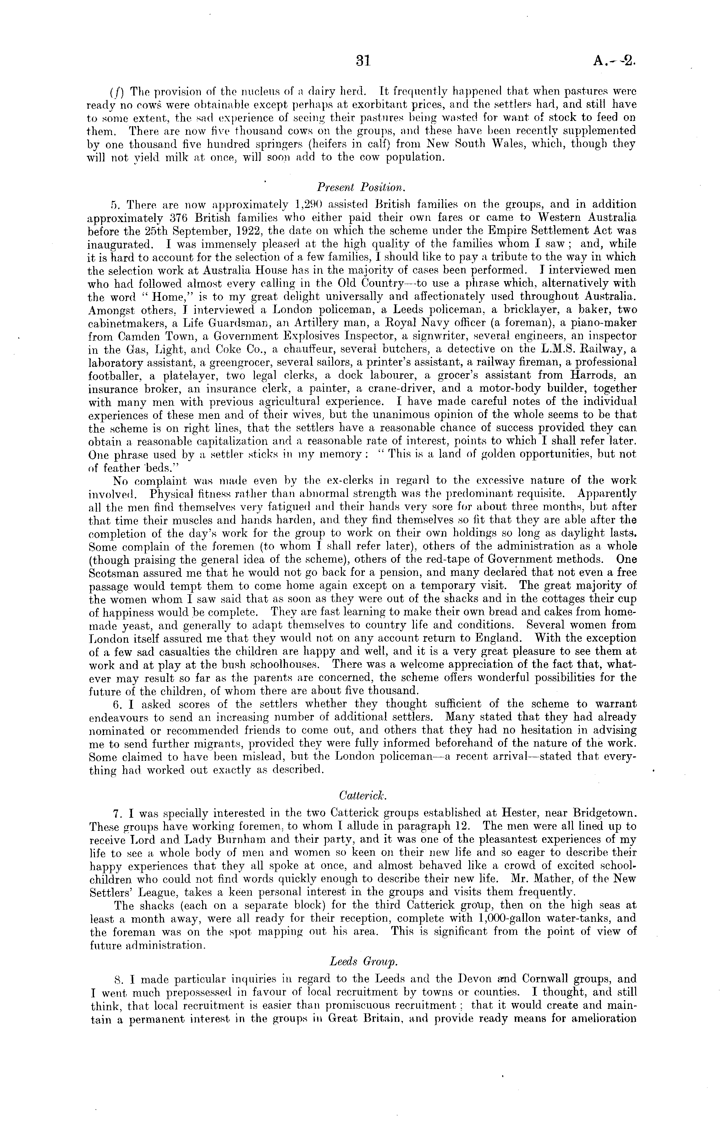 (/) The provision of the nucleus of a dairy herd. It frequently happened that when pastures were ready no cows were obtainable except perhaps at exorbitant prices, and the settlers had, and still have to some extent, the sad experience of seeing their pastures being wasted for want of stock to feed on them. There are now five thousand cows on the groups, and these have been recently supplemented by one thousand five hundred springers (heifers in calf) from New South Wales, which, though they will not yield milk at once, will soon add to the cow population. Present Position. 5. There are now approximately 1,290 assisted British families on the groups, and in addition approximately 376 British families who either paid their own fares or came to Western Australia before the 25th September, 1922, the date on which the scheme under the Empire Settlement Act was inaugurated. I was immensely pleased at the high quality of the families whom I saw ; and, while it is hard to account for the selection of a few families, I should like to pay a tribute to the way in which the selection work at Australia House has in the majority of cases been performed. I interviewed men who had followed almost every calling in the Old Country —to use a phrase which, alternatively with the word " Home," is to my great delight universally and affectionately used throughout Australia. Amongst others. I interviewed a London policeman, a Leeds policeman, a bricklayer, a baker, two cabinetmakers, a Life Guardsman, an Artillery man, a Royal Navy officer (a foreman), a piano-maker from Camden Town, a Government Explosives Inspector, a signwriter, several engineers, an inspector in the Gas, Light, and Coke Co., a chauffeur, several butchers, a detective on the L.M.S. Railway, a laboratory assistant, a greengrocer, several sailors, a printer's assistant, a railway fireman, a professional footballer, a platelayer, two legal clerks, a dock labourer, a grocer's assistant from Harrods, an insurance broker, an insurance clerk, a painter, a crane-driver, and a motor-body builder, together with many men with previous agricultural experience. I have made careful notes of the individual experiences of these men and of their wives, but the unanimous opinion of the whole seems to be that the scheme is on right lines, that the settlers have a reasonable chance of success provided they can obtain a reasonable capitalization and a reasonable rate of interest, points to which I shall refer later. One phrase used by a settler sticks in my memory: " This is a land of golden opportunities, but not of feather 'beds." No complaint was made even by the ex-clerks in regard to the excessive nature of the work involved. Physical fitness rather than abnormal strength was the predominant requisite. Apparently all the men find themselves very fatigued and their hands very sore for about three months, but after that time their muscles and hands harden, and they find themselves so fit that they are able after the completion of the day's work for the group to work on their own holdings so long as daylight lasts. Some complain of the foremen (to whom I shall refer later), others of the administration as a whole (though praising the general idea of the scheme), others of the red-tape of Government methods. One Scotsman assured me that he would not go back for a pension, and many declared that not even a free passage would tempt them to come home again except on a temporary visit. The great majority of the women whom I saw said that as soon as they were out of the shacks and in the cottages their cup of happiness would be complete. They are fast learning to make their own bread and cakes from homemade yeast, and generally to adapt themselves to country life and conditions. Several women from London itself assured me that they would not on any account return to England. With the exception of a few sad casualties the children are happy and well, and it is a very great pleasure to see them at work and at play at the bush schoolhouses. There was a welcome appreciation of the fact that, whatever may result so far as the parents are concerned, the scheme offers wonderful possibilities for the future of the children, of whom there are about five thousand. 6. I asked scores of the settlers whether they thought sufficient of the scheme to warrant endeavours to send an increasing number of additional settlers. Many stated that they had already nominated or recommended friends to come out, and others that they had no hesitation in advising me to send further migrants, provided they were fully informed beforehand of the nature of the work. Some claimed to have been mislead, but the London policeman—a recent arrival —stated that everything had. worked out exactly as described. Catterick. 7. I was specially interested in the two Catterick groups established at Hester, near Bridgetown. These groups have working foremen, to whom I allude in paragraph 12. The men were all lined up to receive Lord and Lady Burnham and their party, and it was one of the pleasantest experiences of my life to see a whole body of men and women so keen on their new life and so eager to describe their happy experiences that they all spoke at once, and almost behaved like a crowd of excited schoolchildren who could not find words quickly enough to describe their new life. Mr. Mather, of the New Settlers' League, takes a keen personal interest in the groups and visits them frequently. The shacks (each on a separate block) for the third Catterick group, then on the high seas at least a month away, were all ready for their reception, complete with 1,000-gallon water-tanks, and the foreman was on the spot mapping out his area. This is significant from the point of view of future administration. Leeds Group. 8. I made particular inquiries in regard to the Leeds and the Devon amd Cornwall groups, and I went much prepossessed in favour of local recruitment by towns or counties. I thought, and still t